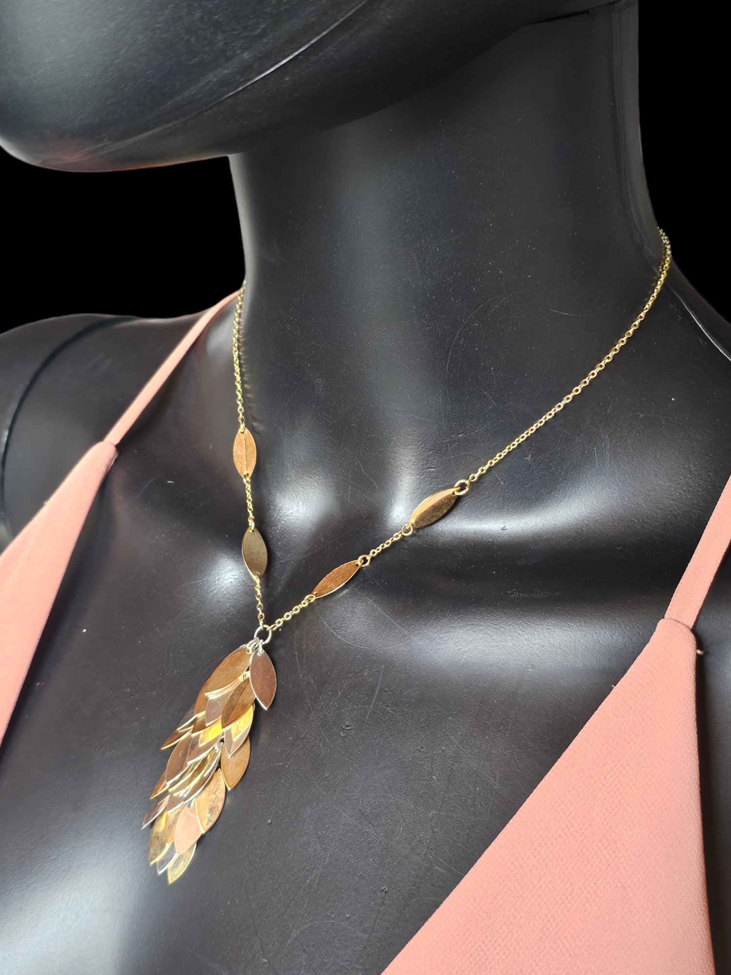 Elevate your style with our Silver/Gold Waterfall Y Necklace. The gold chain and leaf-shaped details, accented with pops of silver, exude sophistication. The waterfall chain adds movement to this exclusive piece, perfect for adding a touch of luxury to your favorite v-neck shirt or dress.