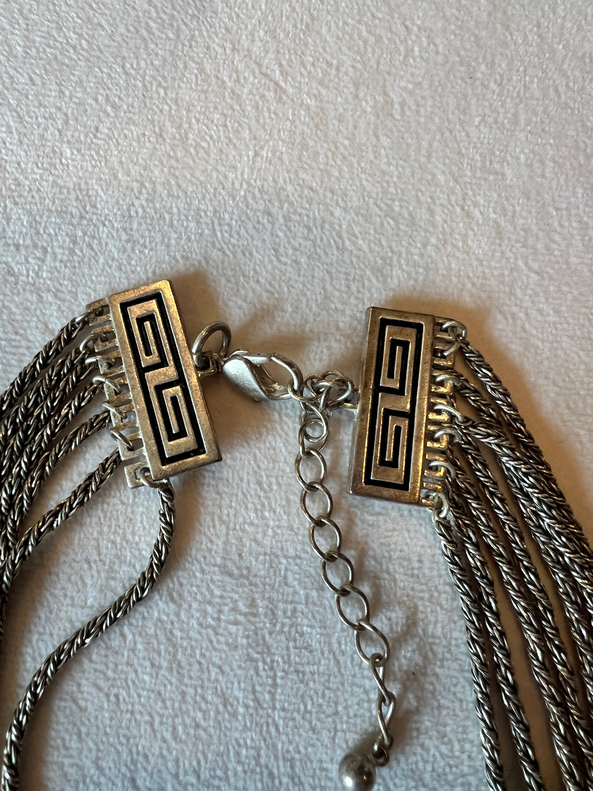This necklace lays several strands of beautiful woven silver down the collarbone and catches the light as you move. The simple design makes it easy for everyday wear, while the silver detailing elevates the piece for special occassions.