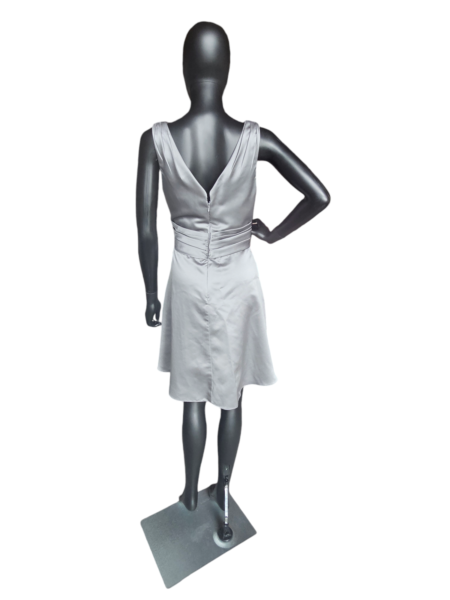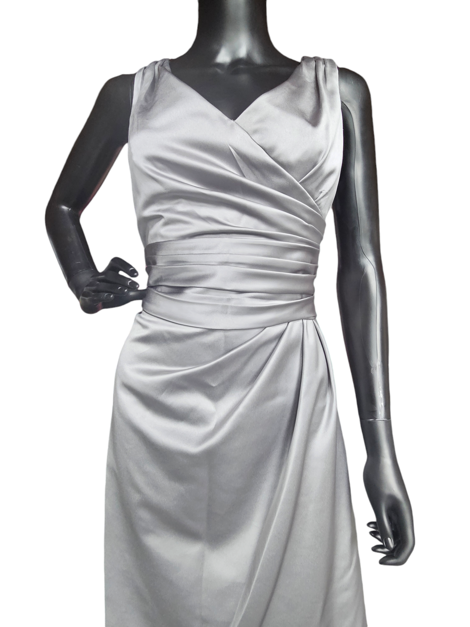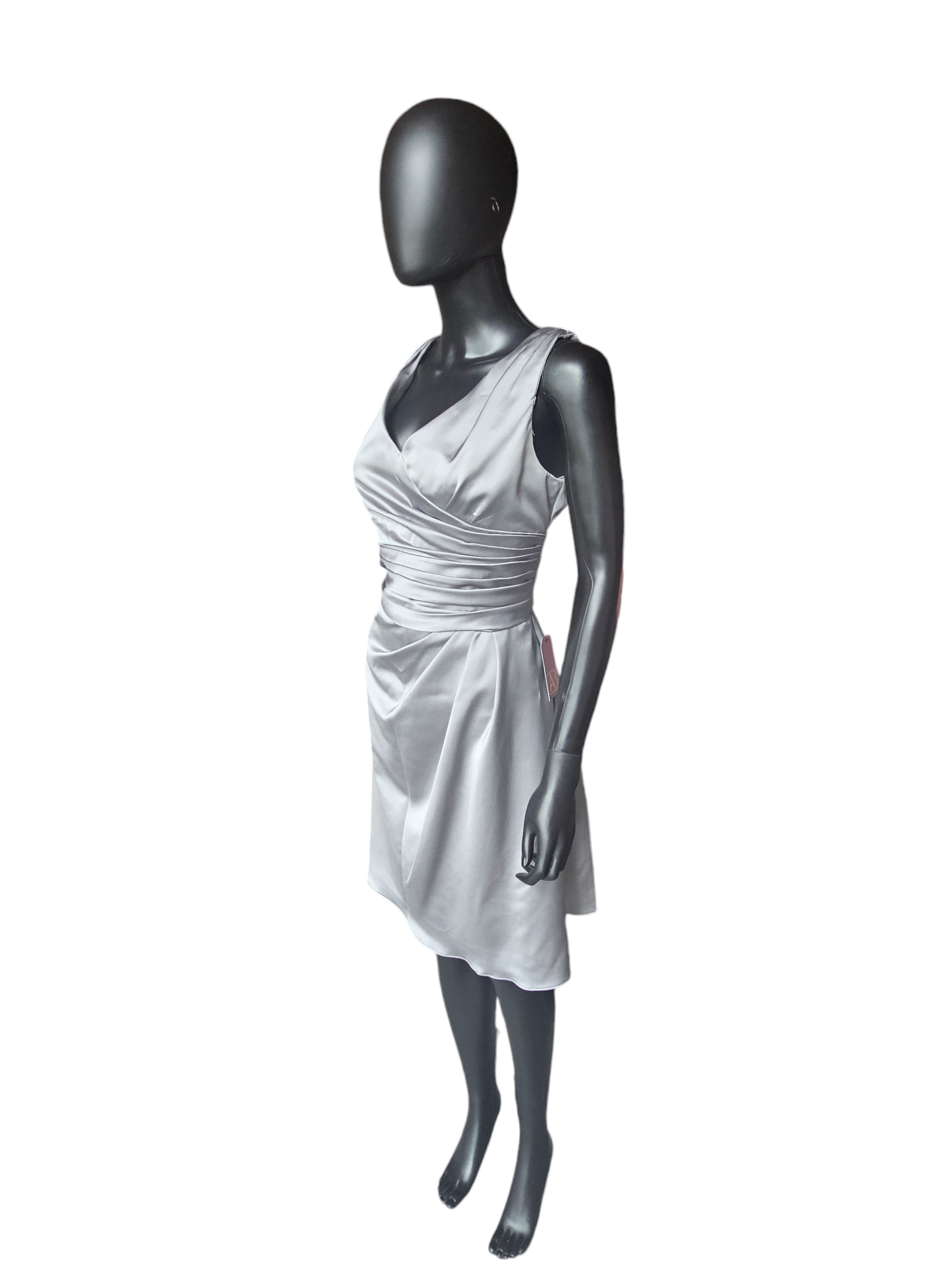 This Silver Satin Side Ruched Cocktail Dress from David's Bridal is made of soft satin fabric. The v-neckline and full skirt create an elegant and flattering silhouette. The waist is tucked, adding a touch of sophistication to this timeless dress. Perfect for any formal occasion.