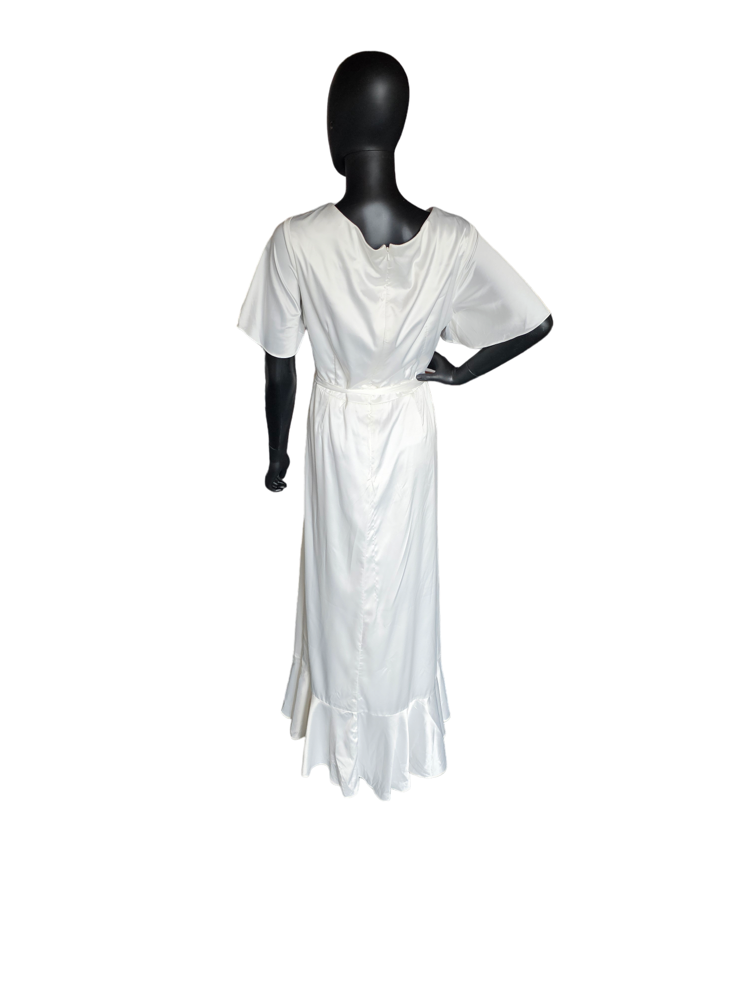 This beautiful wrap gown features a lustrous fabric, flutter sleeves and a flattering high-low hemline.