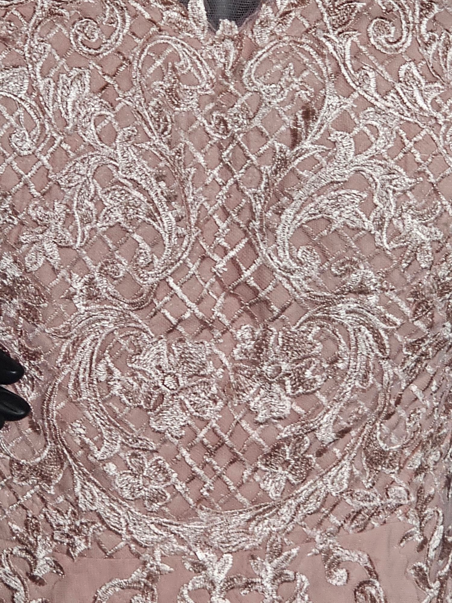 This exquisite illusion bodice gown features delicate embroidery and a soft pink hue, creating a stunning and timeless look. The a-line silhouette flatters all body types, making it a perfect choice for any special occasion. Truly a beautiful addition to any wardrobe.