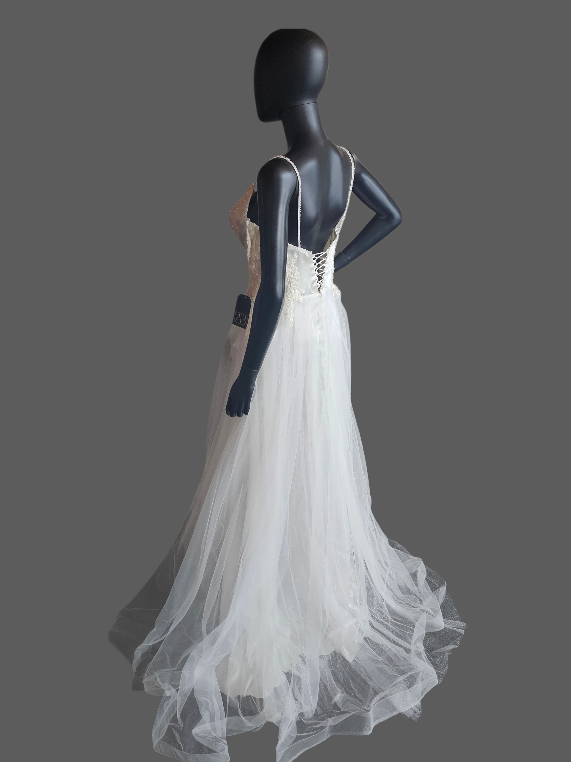 Spaghetti Strap Ivory Floral Embroidered Side Slit Wedd8ng Gown - Di La Sena