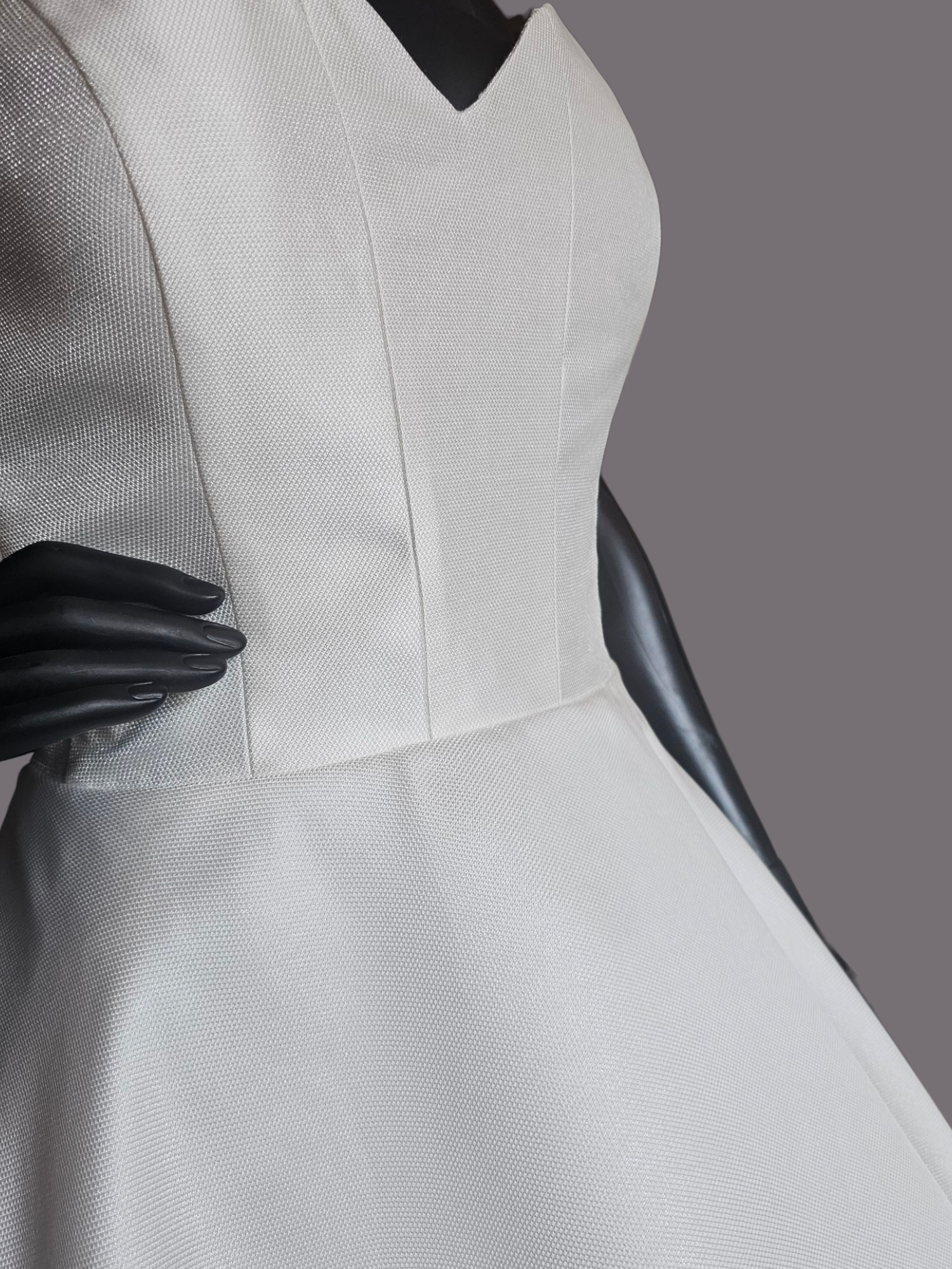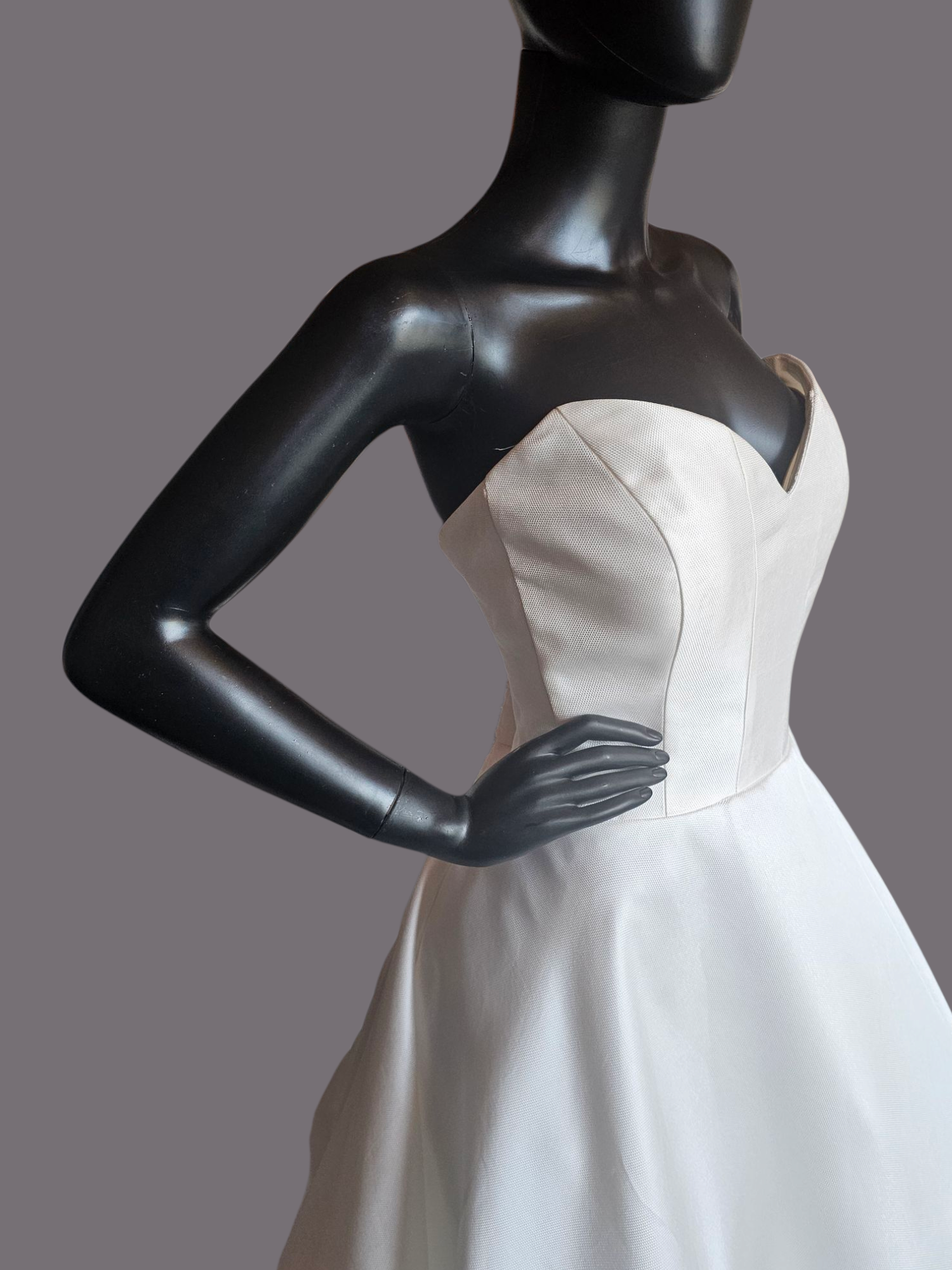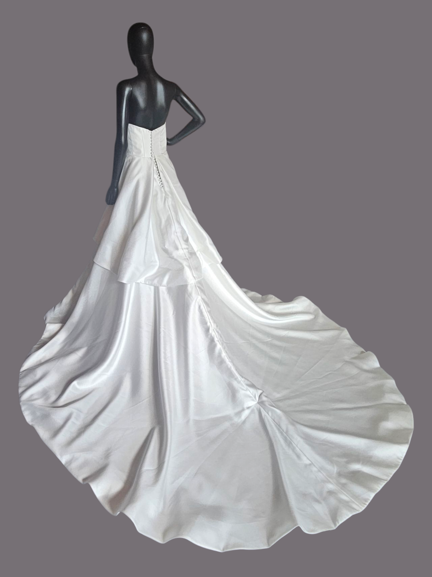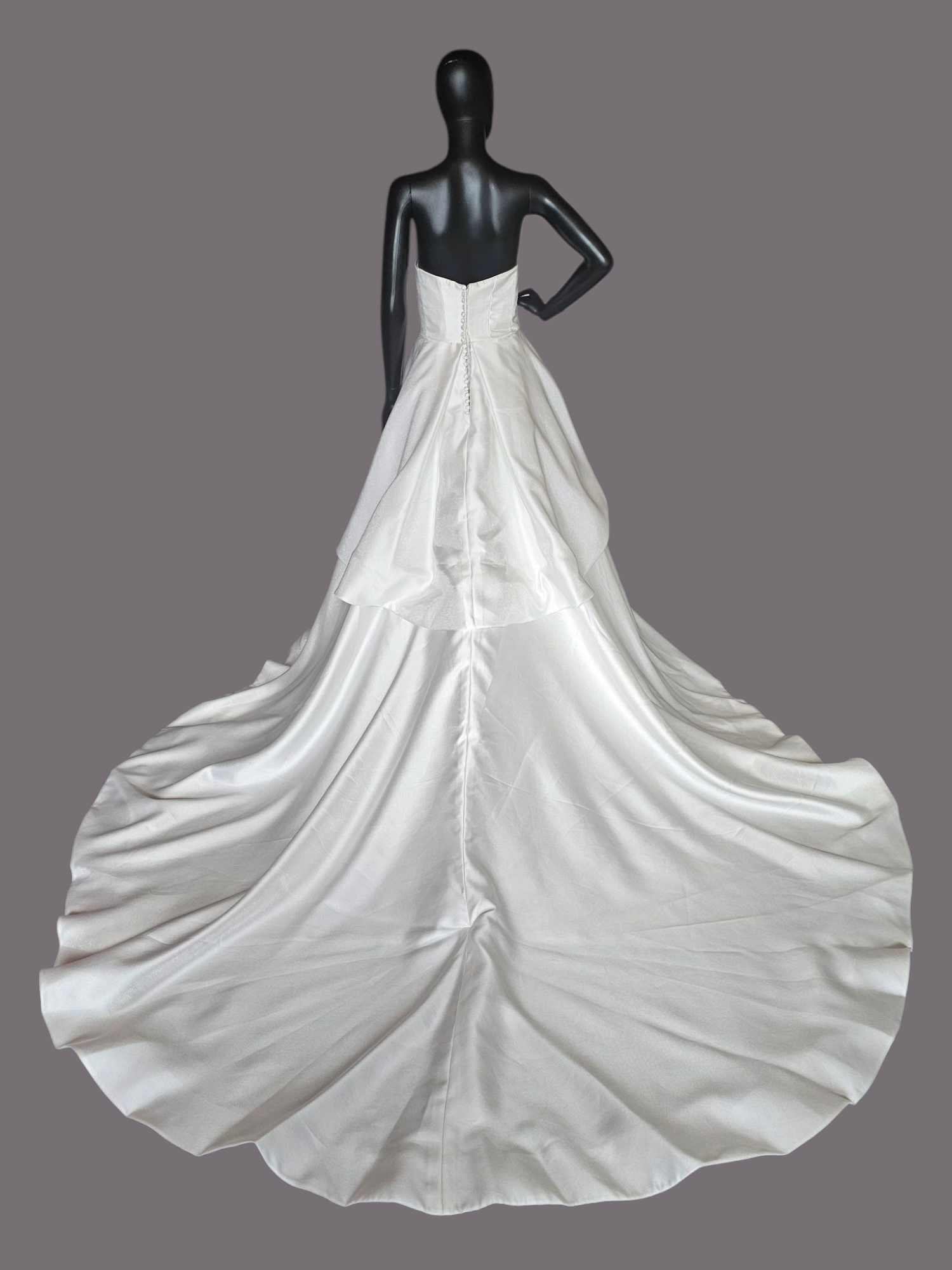 Delicately crafted with contoured seaming on luxurious diamantina satin, this A-line ball gown exudes an air of minimalist elegance. Featuring a deep sweetheart strapless neckline, back peplum, and cathedral train, this wedding gown is a statement of sophistication. Its practical pockets add a touch of practicality to this otherwise dreamy design.