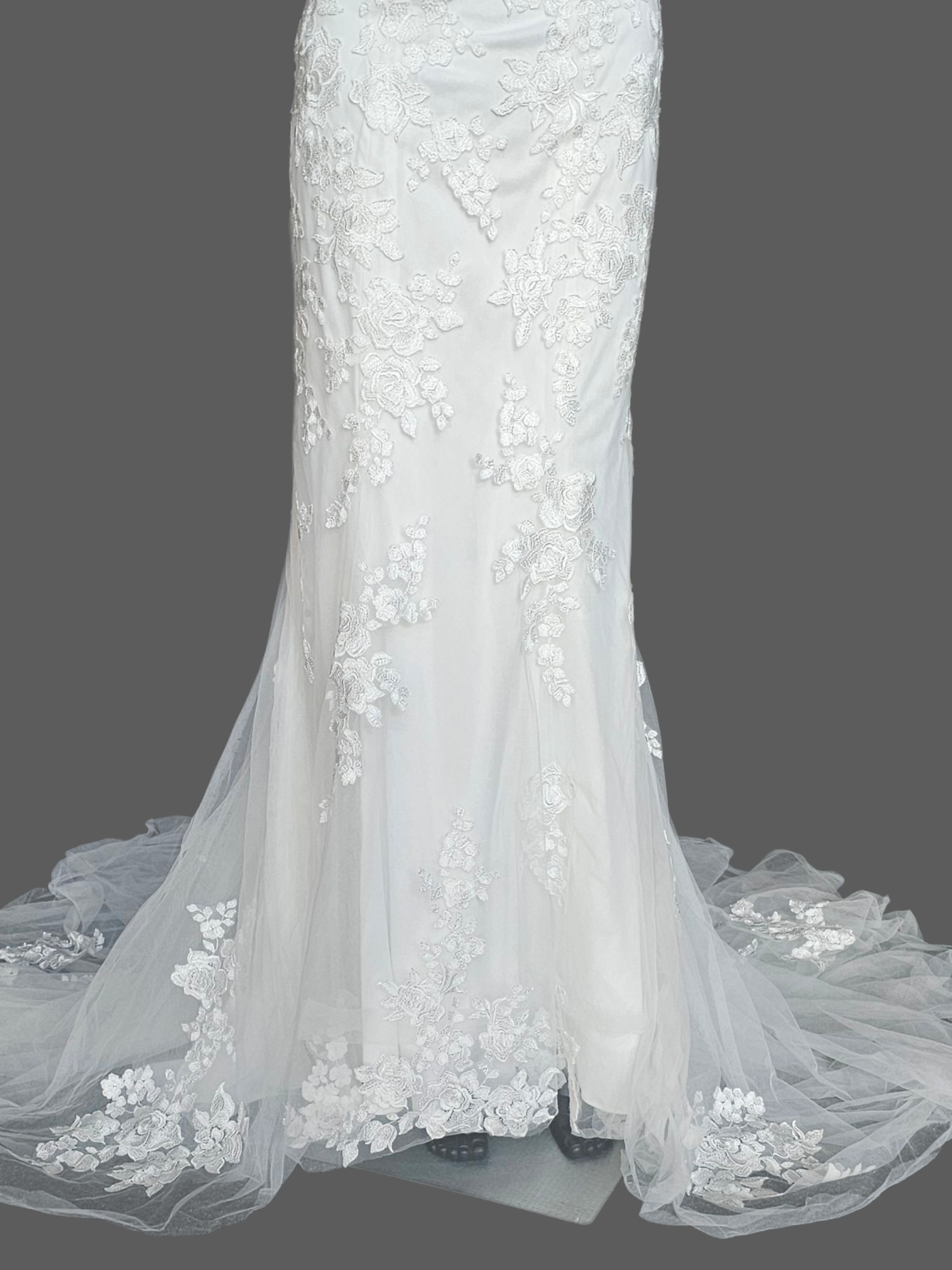 This dress is part of our pre loved collection. It is in excellent overall condition with clean hems. There is one small rip on the back train where a bustle hook pulled through the tulle. Easily fixed/hidden.