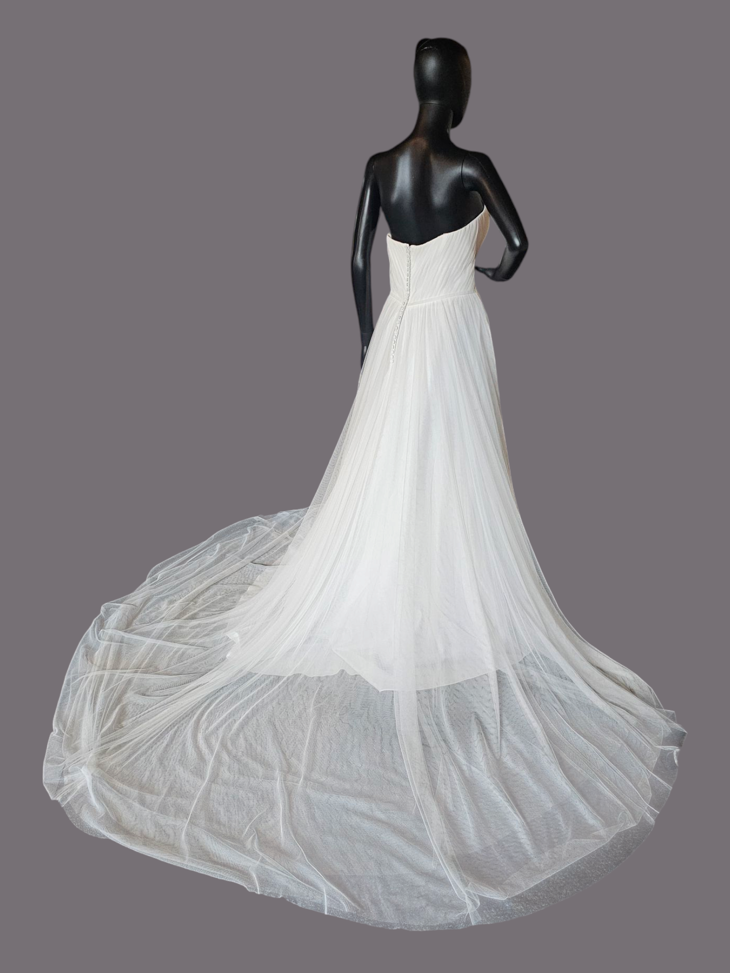 This gown is part of our store sample collection. It has never been worn for a wedding or altered in any way. Many will still have the original store tags on them. They may show some slight signs of wear from being tried on in the store. All prices reflect the condition of the gown. Please contact me to schedule a virtual consultation where we can go through the gown together and verify the condition so you feel confident in your purchase.