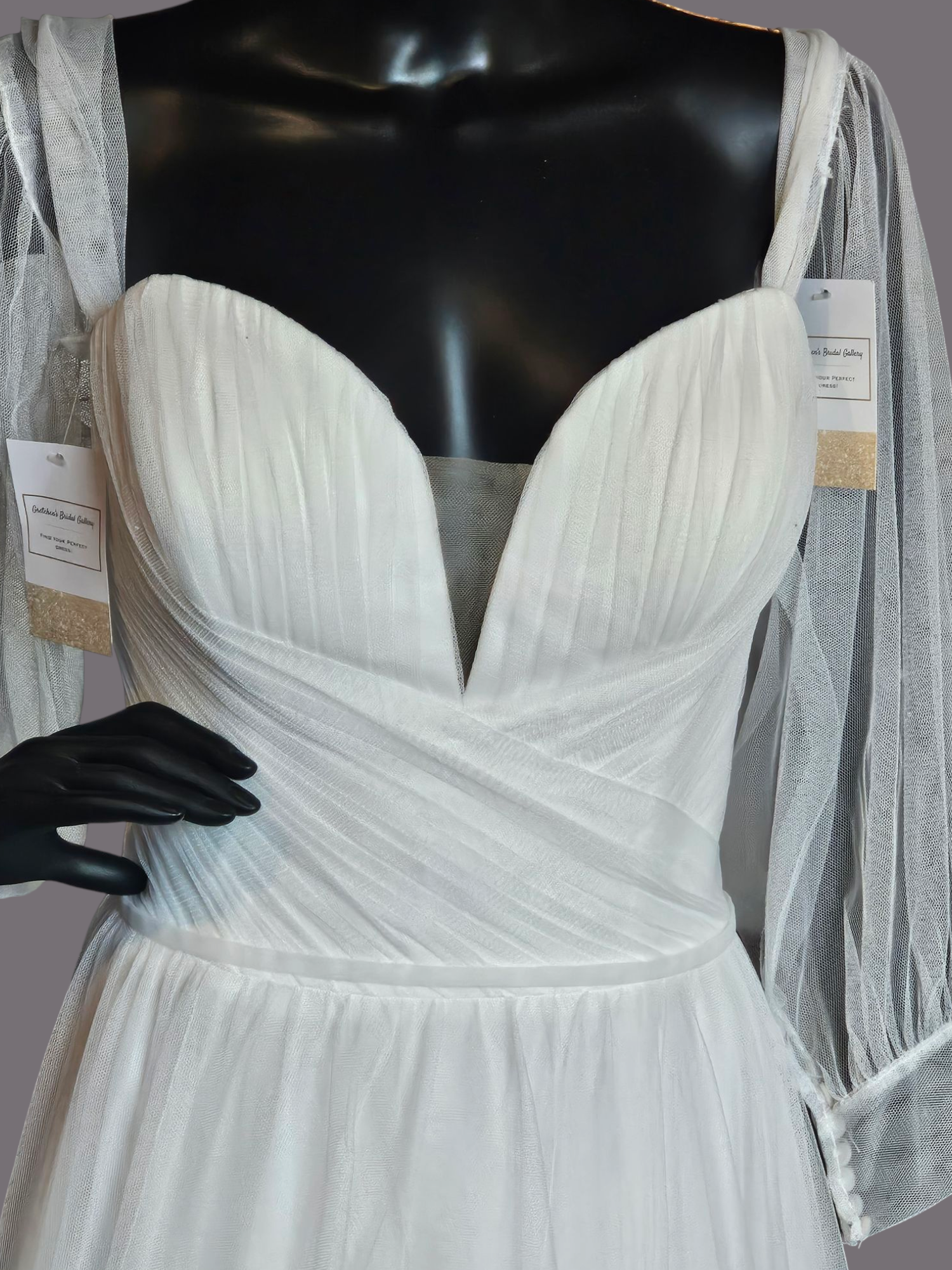Elevate your wedding day with this exquisite Sweetheart Plunge Ivory Netting Gown. The minimalist design is adorned with delicately folded details and cinched at the waist for a flattering silhouette. The plunging sweetheart neckline and detachable bishop sleeves add a touch of sophistication. Perfect for a luxurious and timeless look.