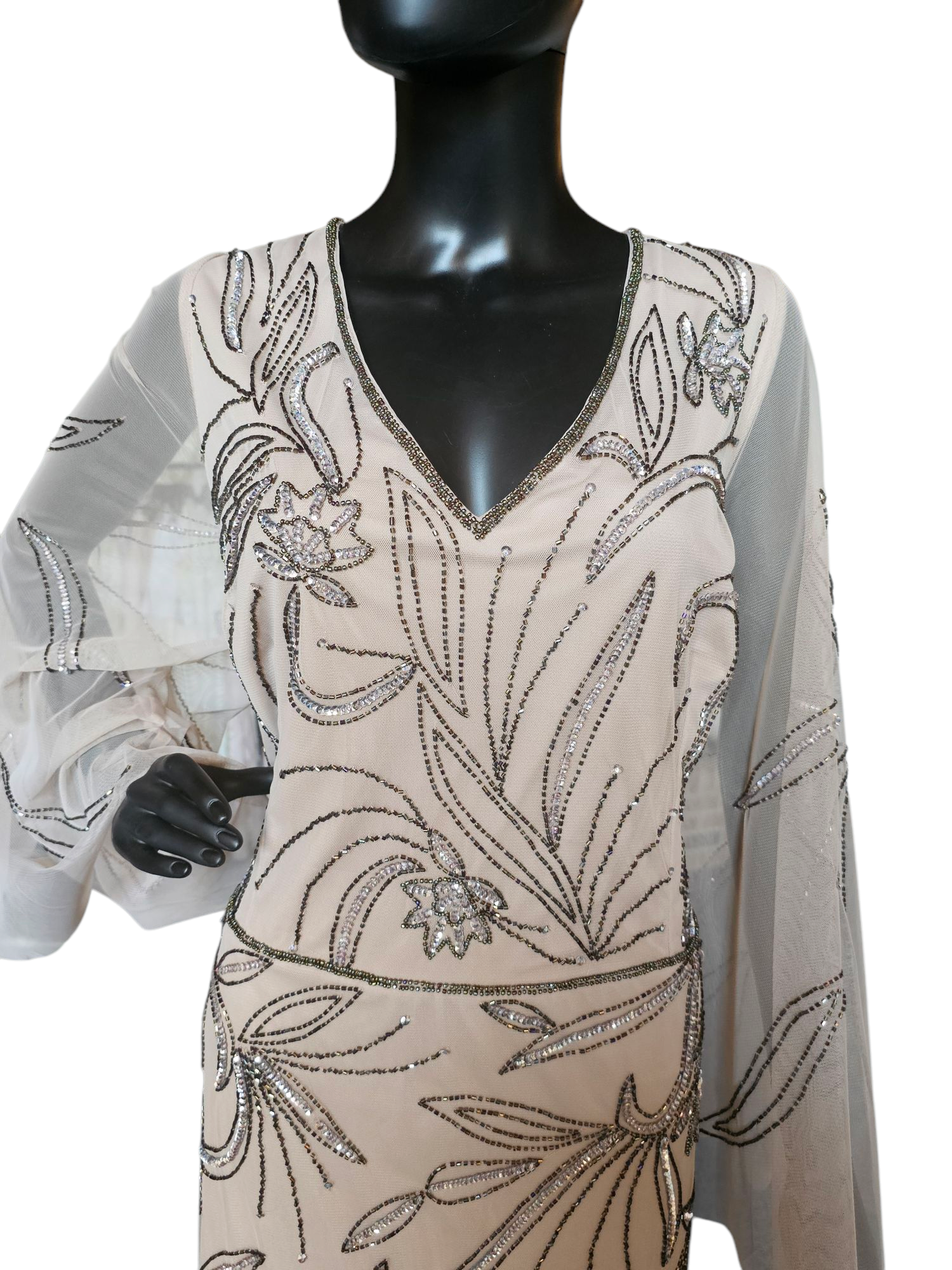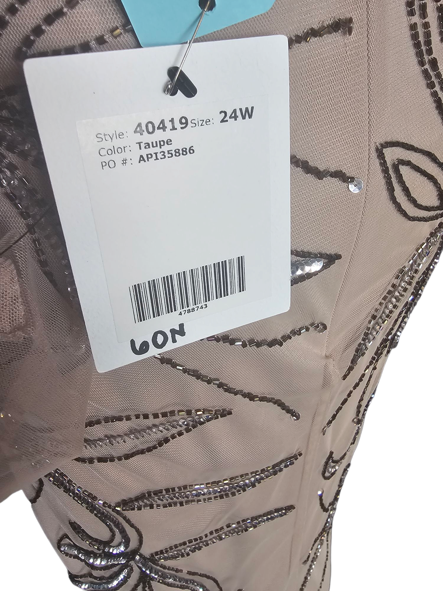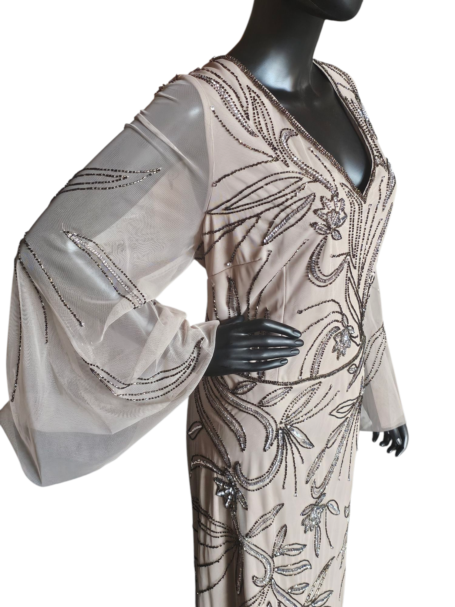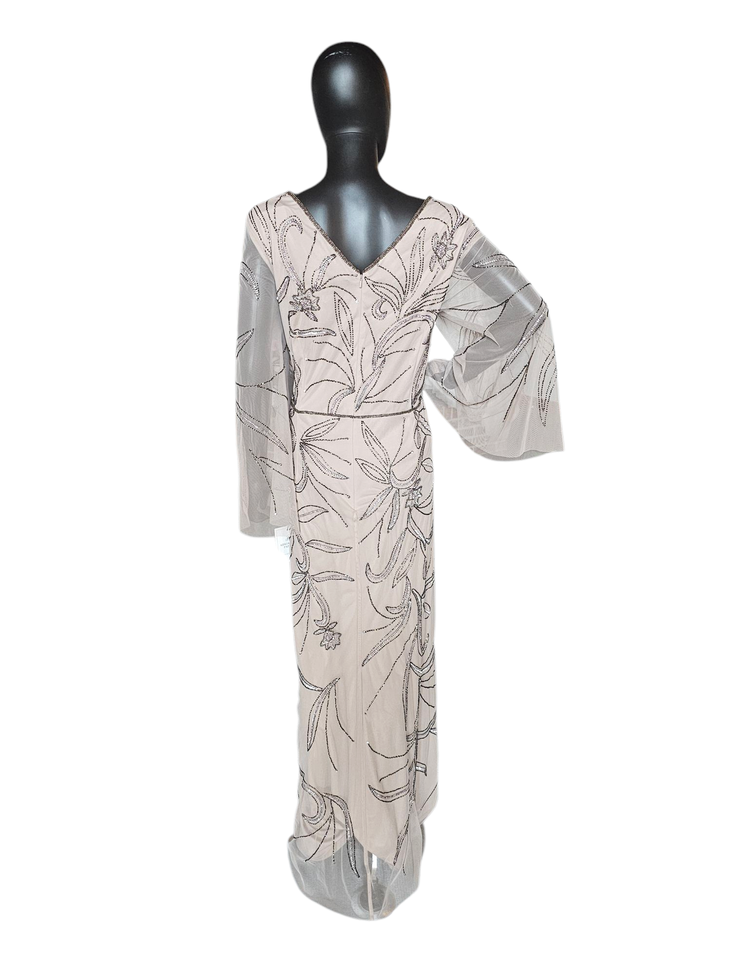Taupe Beaded Mesh Bell Sleeve Formal Gown - Adrianna Papell