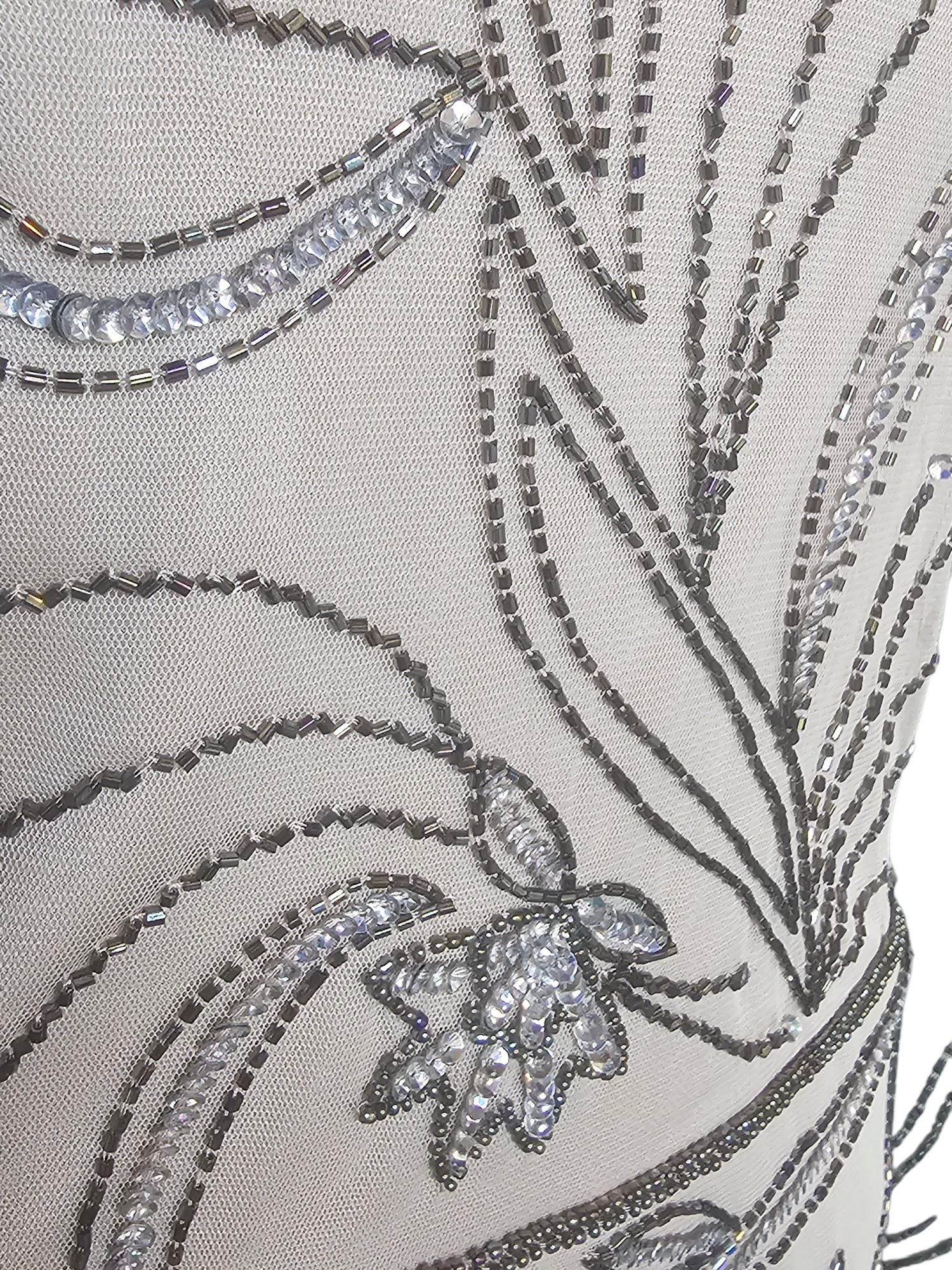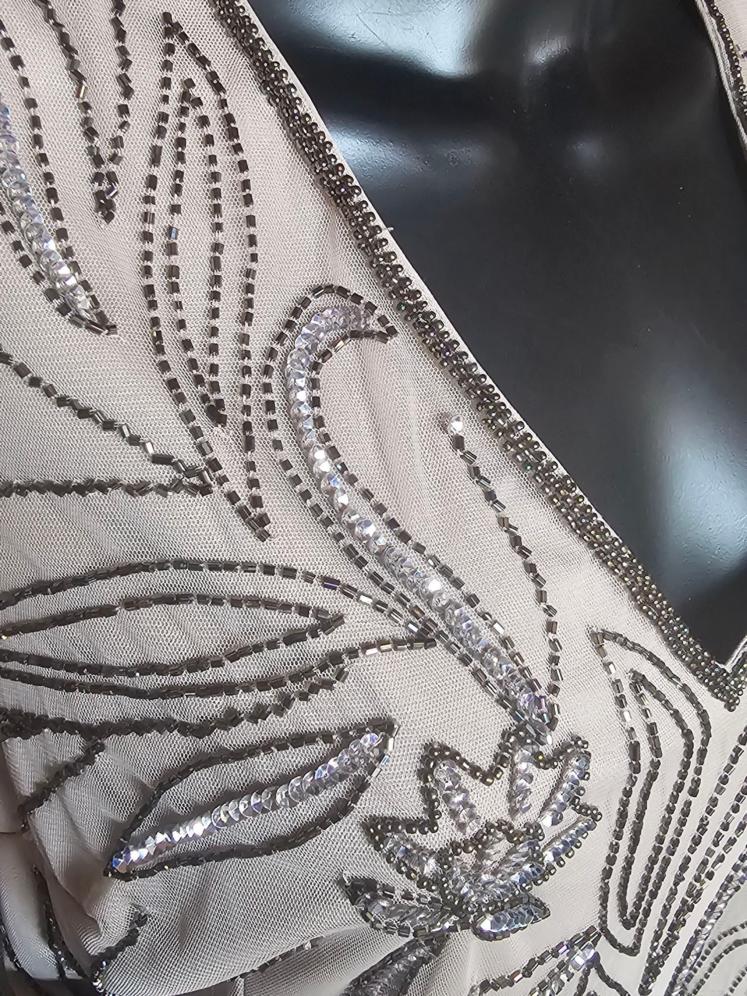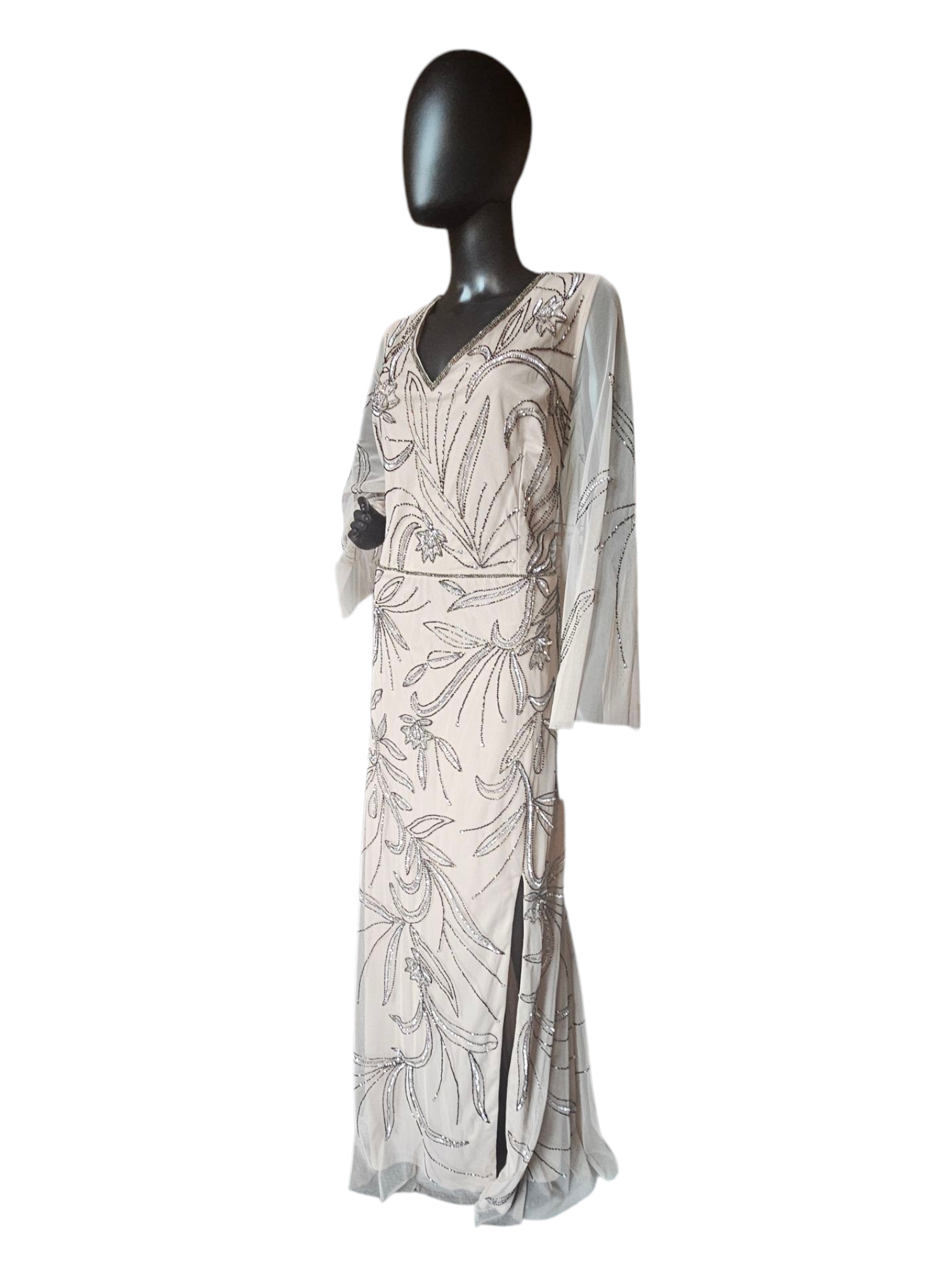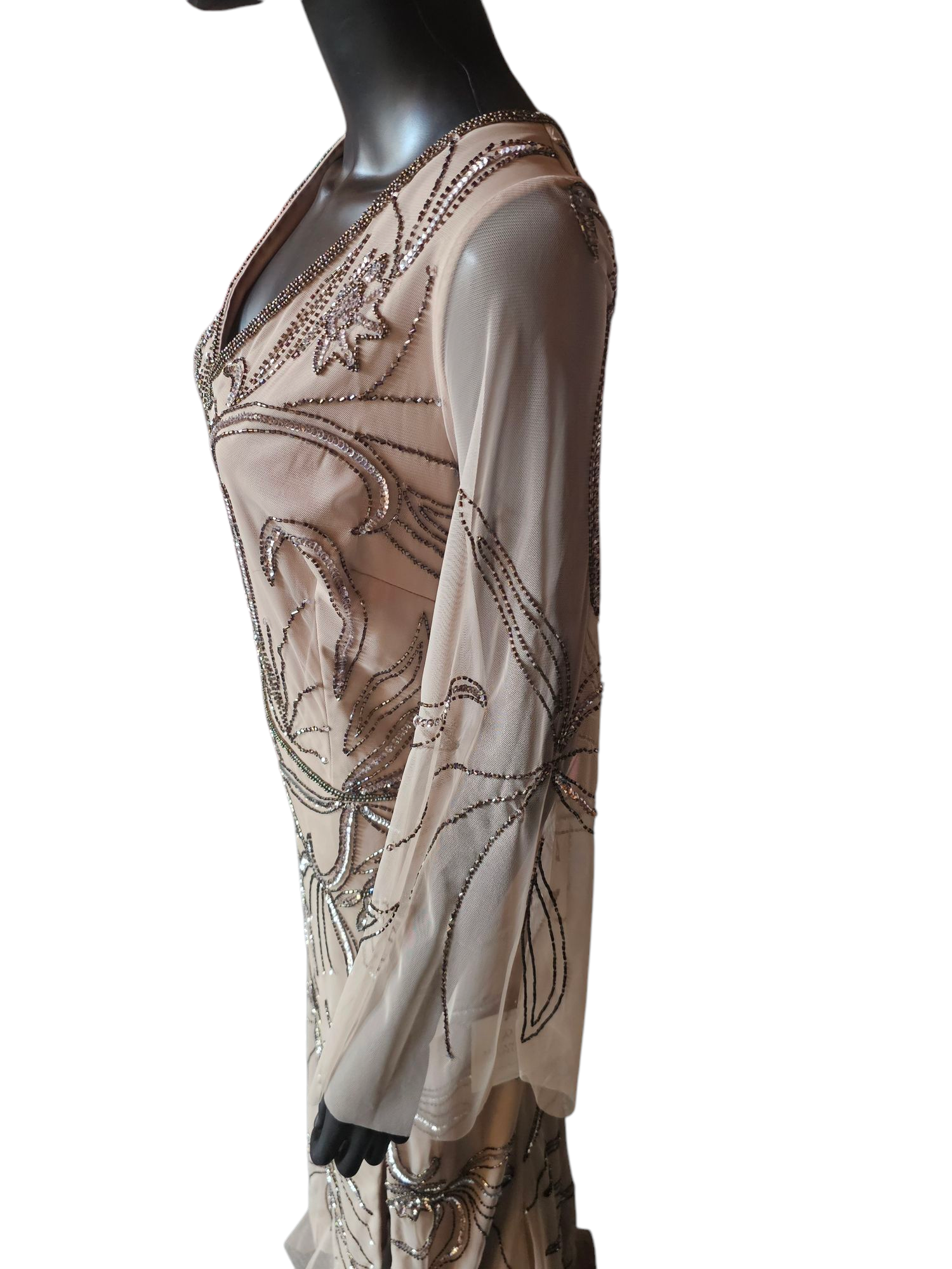 Taupe Beaded Mesh Bell Sleeve Formal Gown - Adrianna Papell