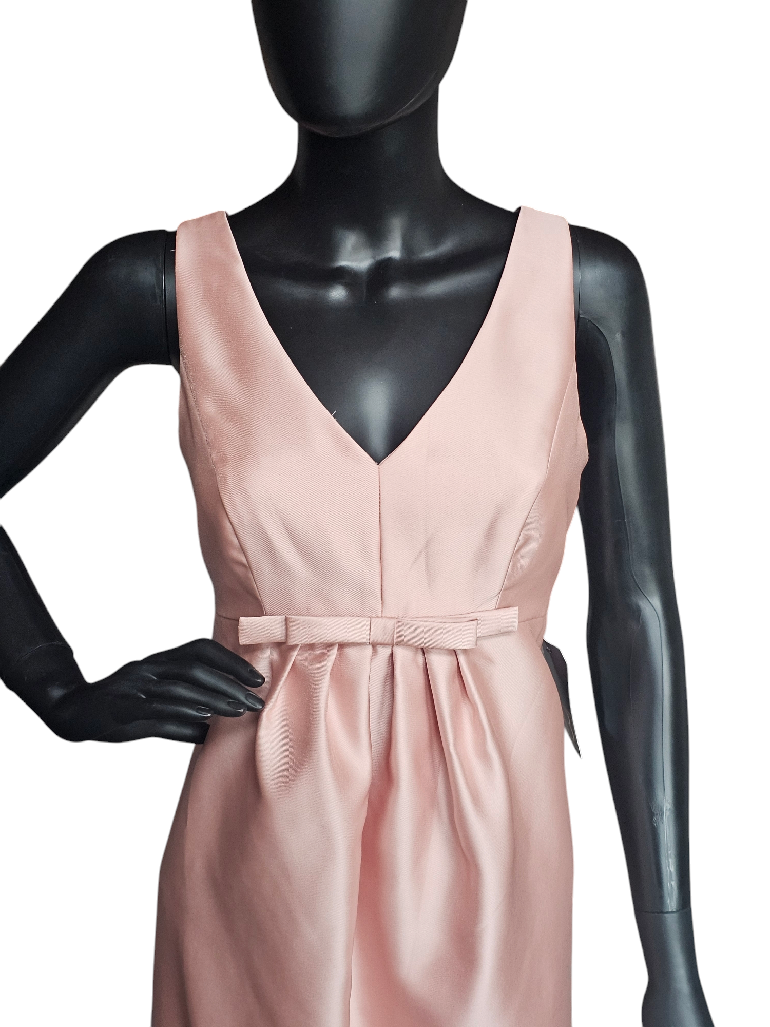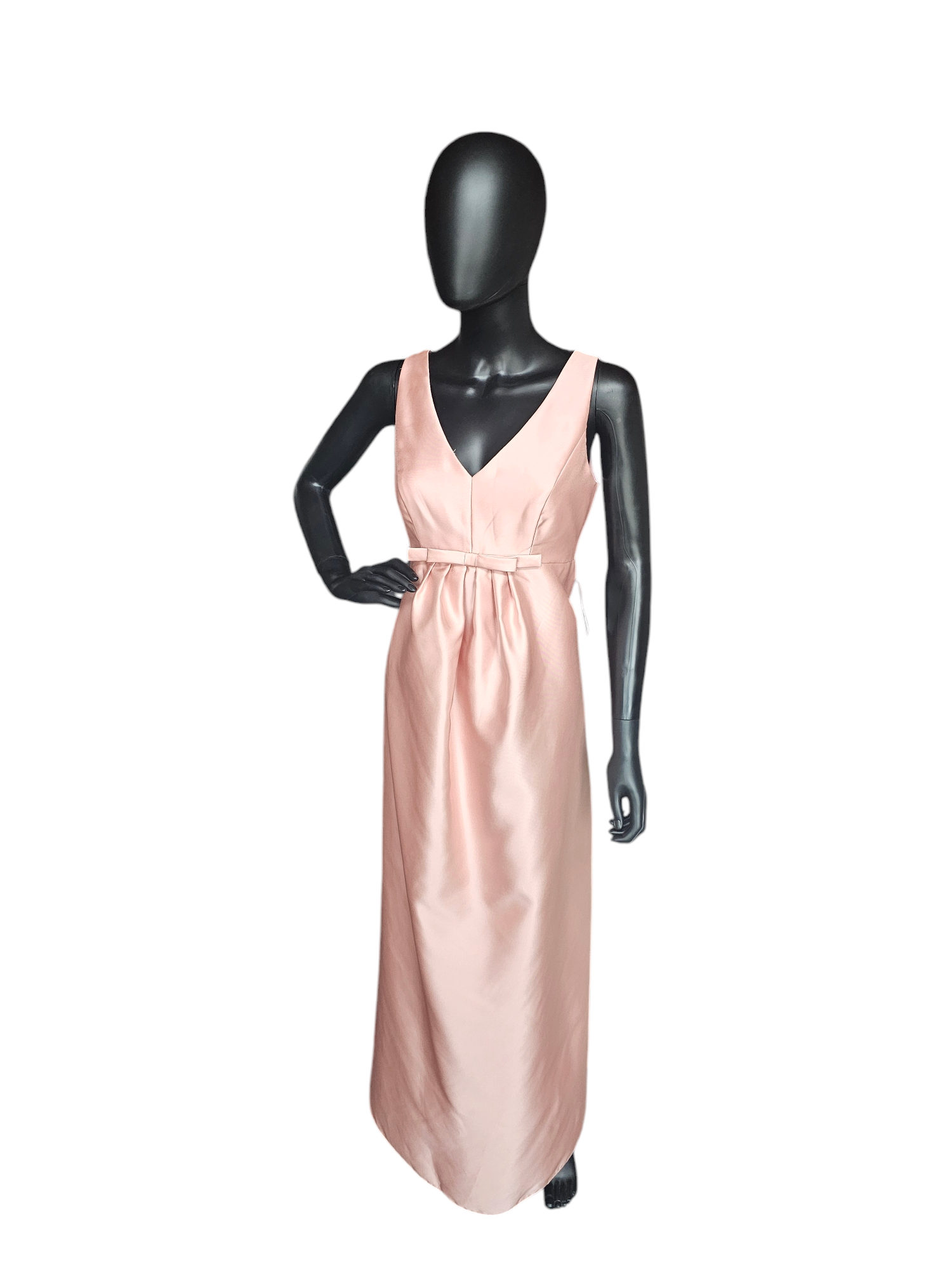 This Toasted Sugar Satin Twill V-Neck Formal by Alfred Sung NWT is the epitome of simple, classic, and chic. The demure soft blush pink with undertones of caramel offers a sophisticated twist. The v-neck and wide straps provide comfort and style while the gathered natural waistline and front bow detail add a touch of elegance.