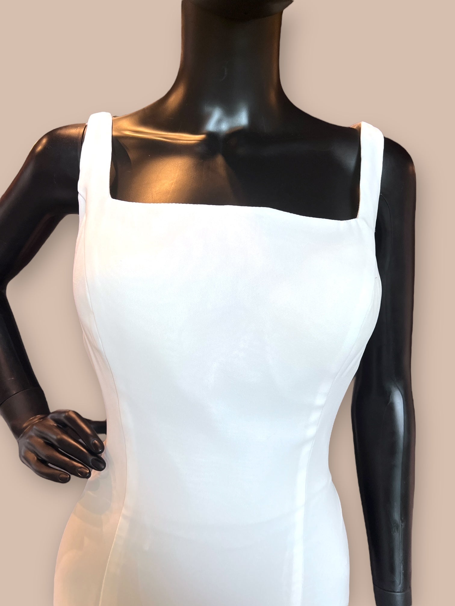 Simple, sweet and beautiful. This chiffon sheath is a slight fit and flare with a square neckline and wide straps. The open back has soft lace accents and button closure. The sweep train adds just a little touch of grace without impeding movement too much.