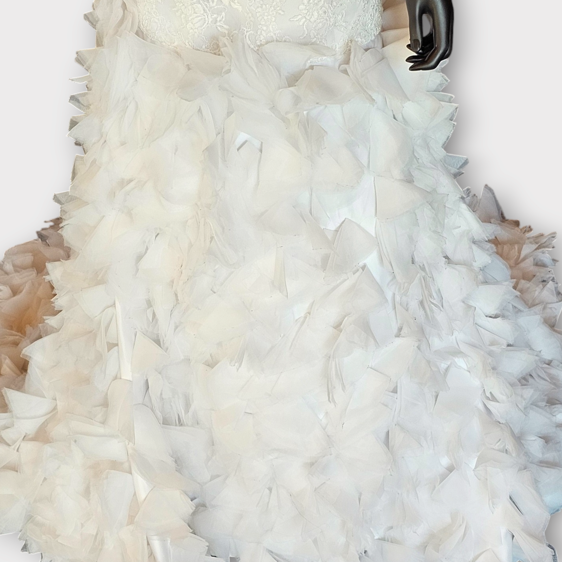 The deep sweetheart bodice features a soft lace overlay and beaded/crystal details under the bust. The sleek bodice is fitted to the mid-thigh and then dramatically explodes into a flurry of feathered organza throughout the skirt an into the long cathedral length train. Amazing!