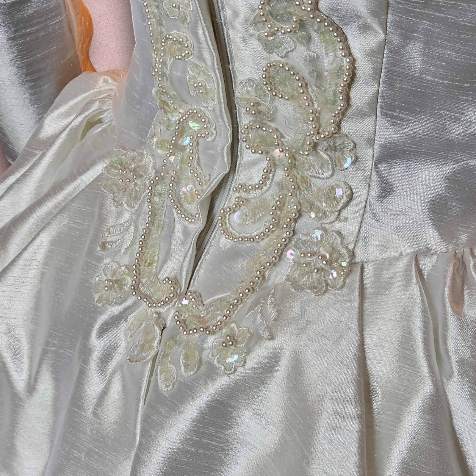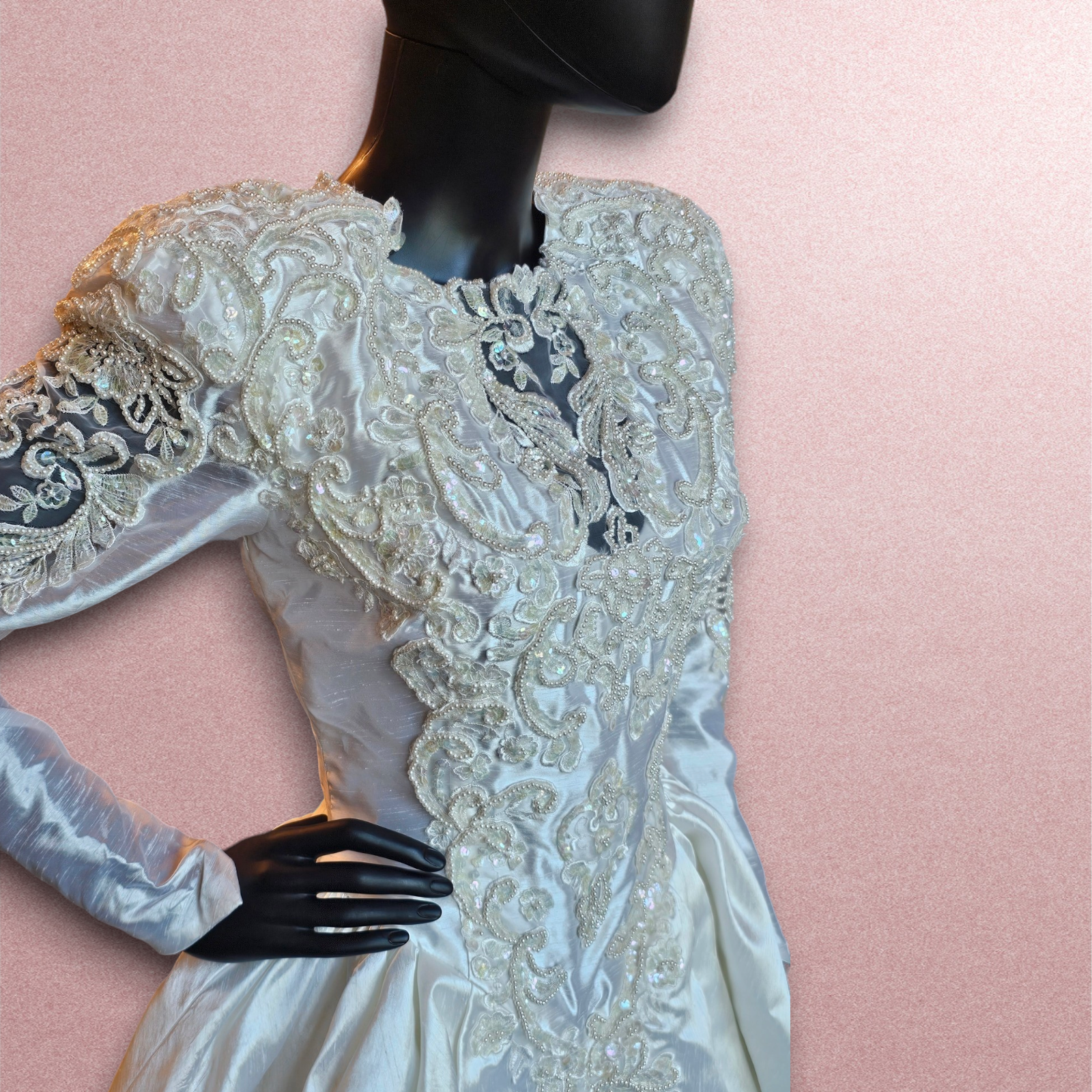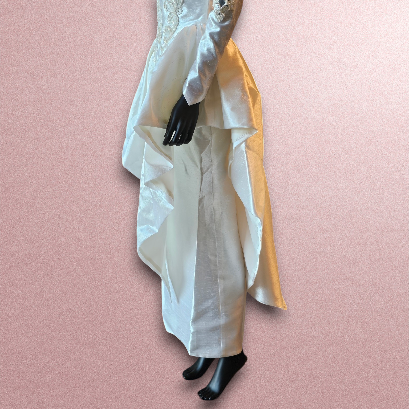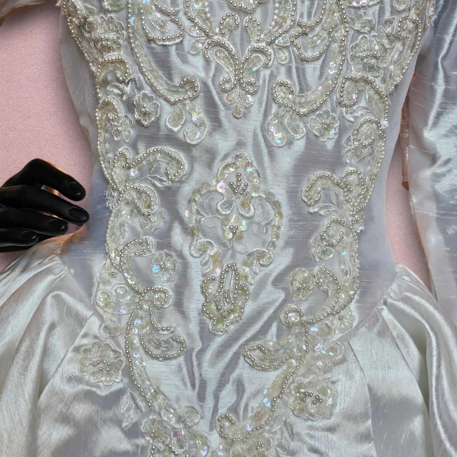 Be the ultimate vintage fashion icon in this one-of-a-kind Vintage 90's Fitted Detachable Train Wedding Gown. With its dramatic and avant garde design, you'll wow the crowd with every step. The ivory fabric has a luminous quality, perfectly accentuating the heavily detailed pearls and sequins. The fitted bodice and sleeves (complete with extra large shoulder pads), along with the unique voluminous asymmetrical overskirt, add a touch of edgy glamour. And the best part? You can easily detach the cathedral length train for a more practical reception look. Say "I do" to this statement piece.