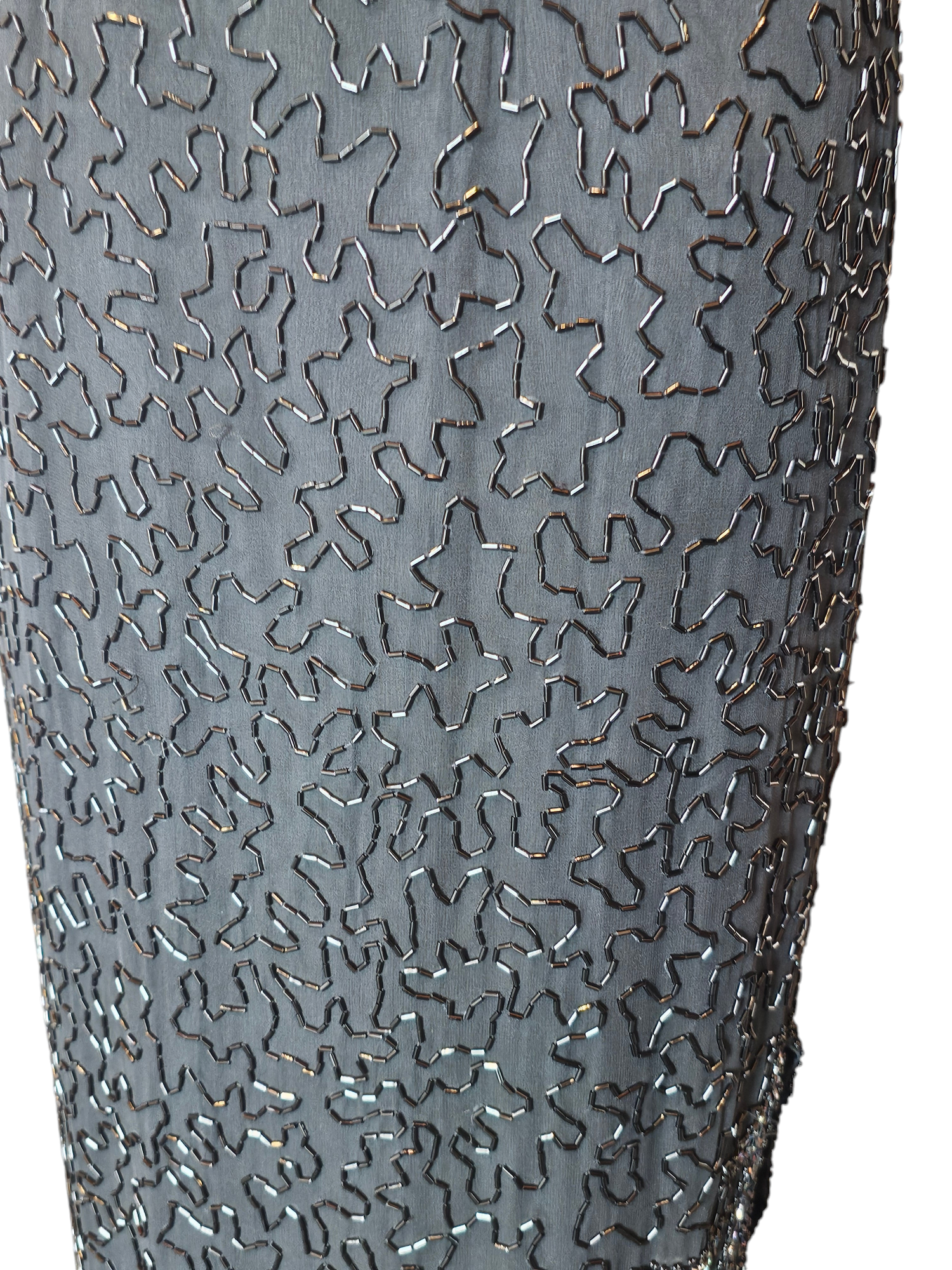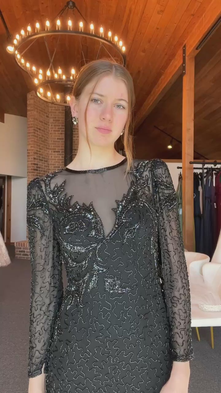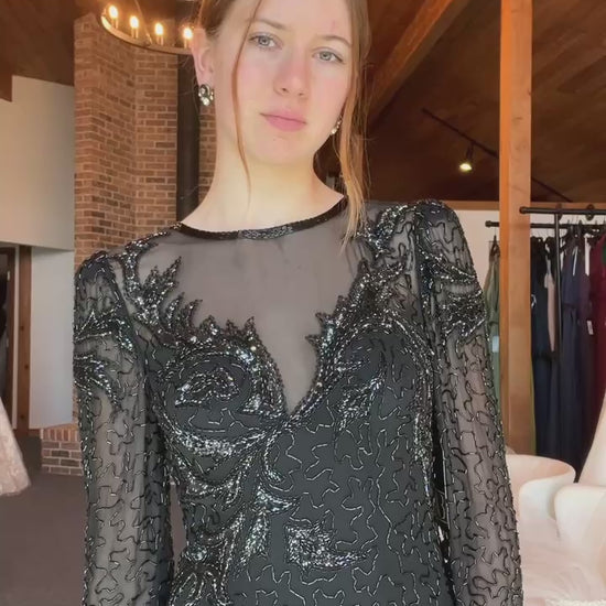 Looking for a fashionista with somewhere special to be. Absolutely stunning details and beading cover every inch of this gorgeous eveningwear gown. The dress is a slim straight cut lightweight black crepe with a black chiffon illusion bodice and a plunge neckline surrounded by rows of shimmering beads. The sleeves and skirt feature a patterned beading edged in an asymmetrical slit. You have to see it to believe it!