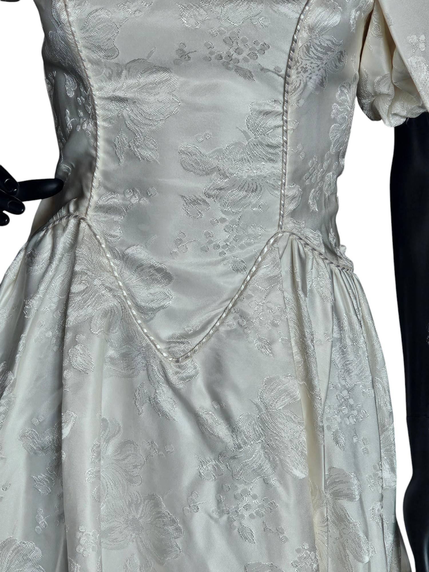 This gown is in excellent condition! It is missing a single fabric covered button. There is a bustle in place.
