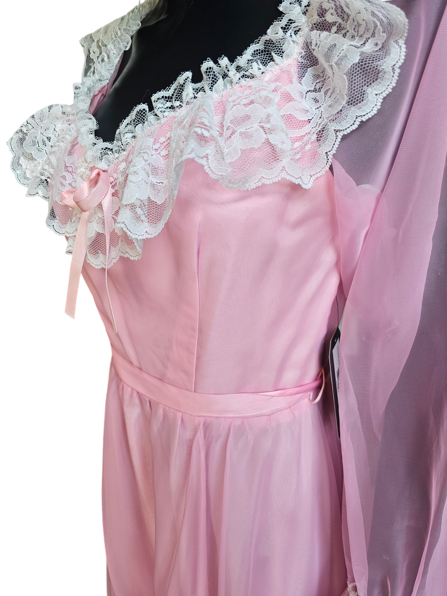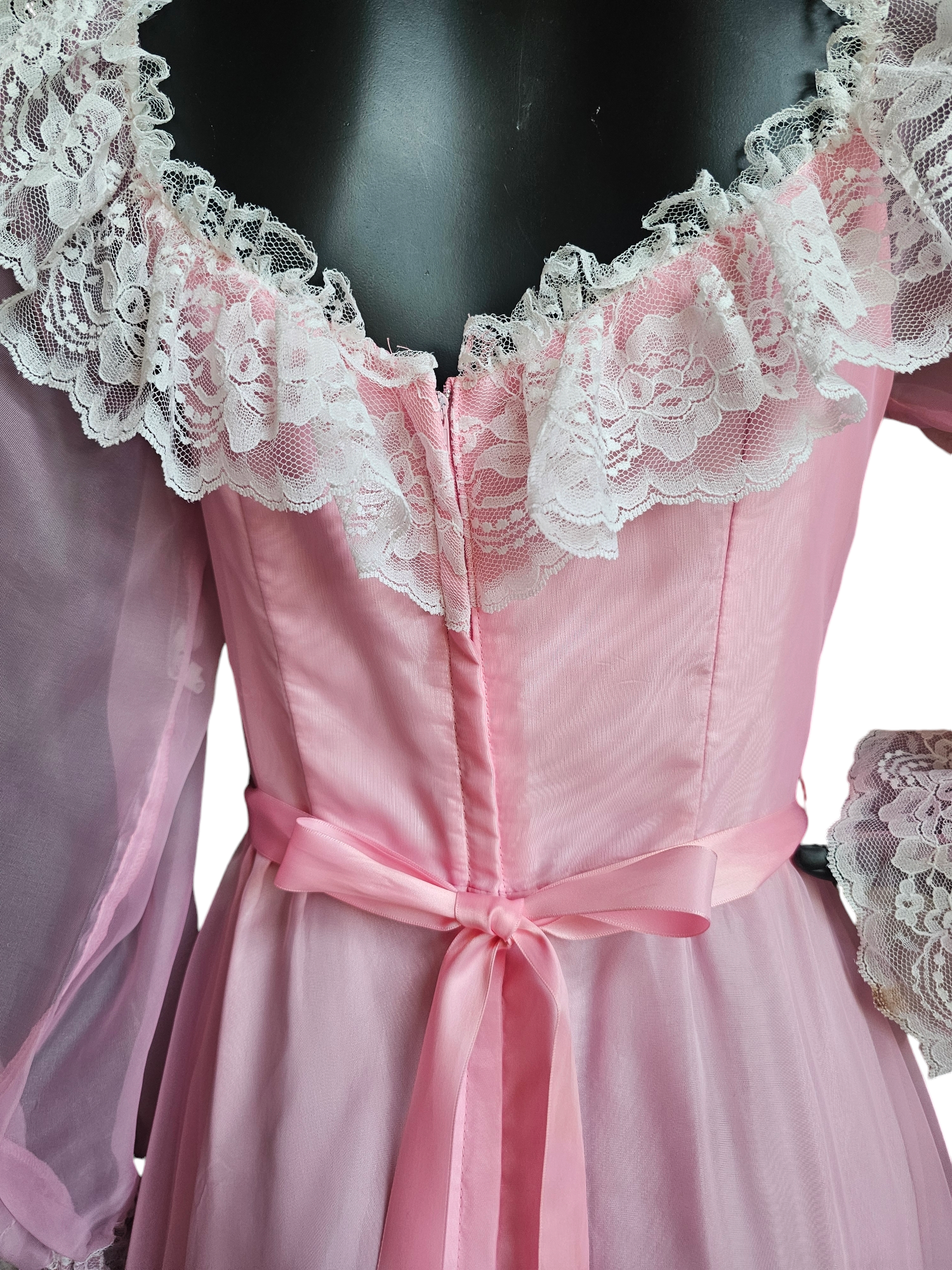 Introducing the Vintage Barbie Pink Long Sleeve Formal dress, featuring peasant-core design and dark pink chiffon. The scoop neck, wrists, and scalloped hem are adorned with white lace accents, adding a touch of elegance. The fitted bodice and full prairie style sleeves provide a flattering and comfortable fit. Elevate your style with this timeless piece.Vintage Barbie Pink Long Sleeve Formal