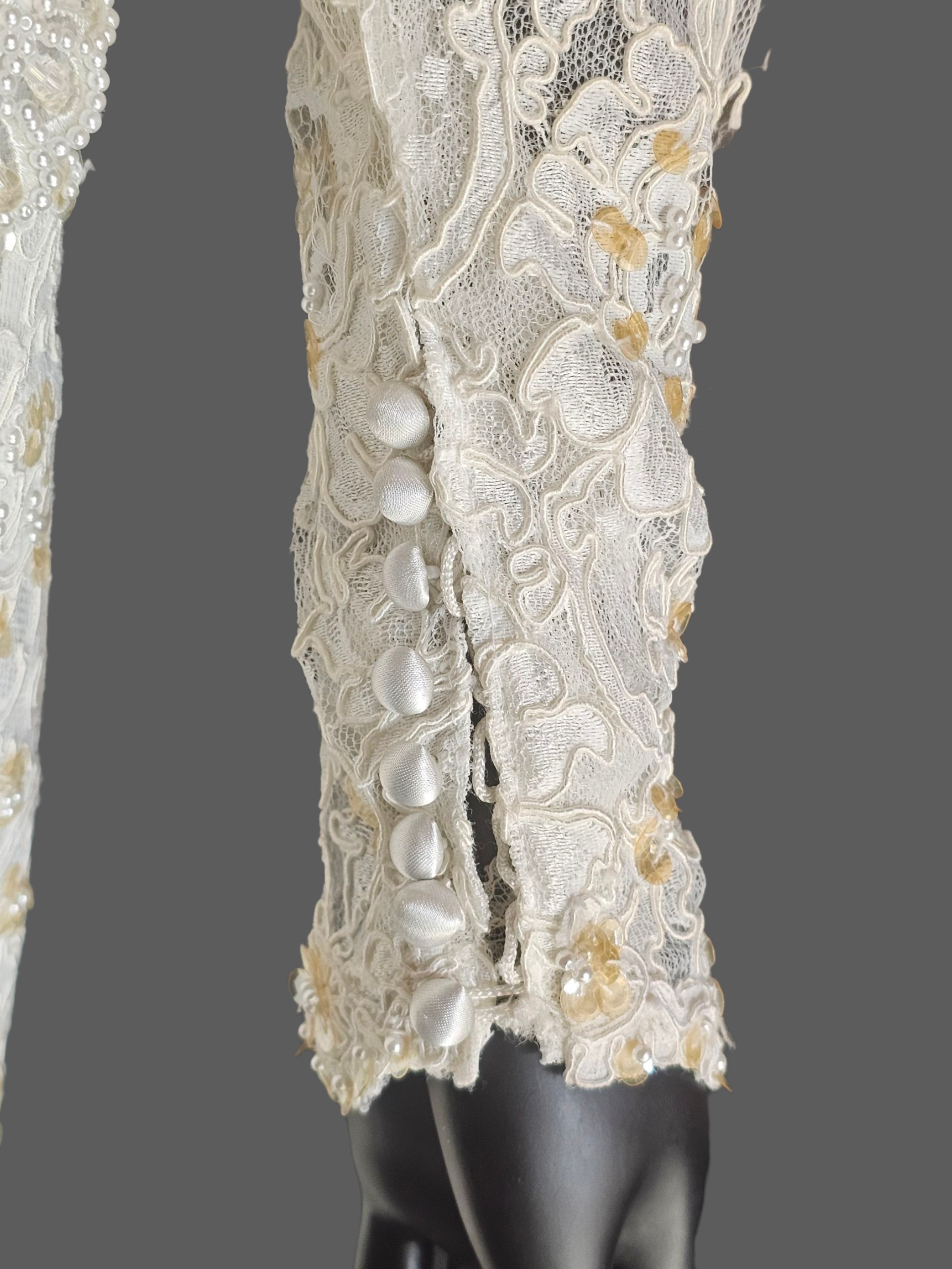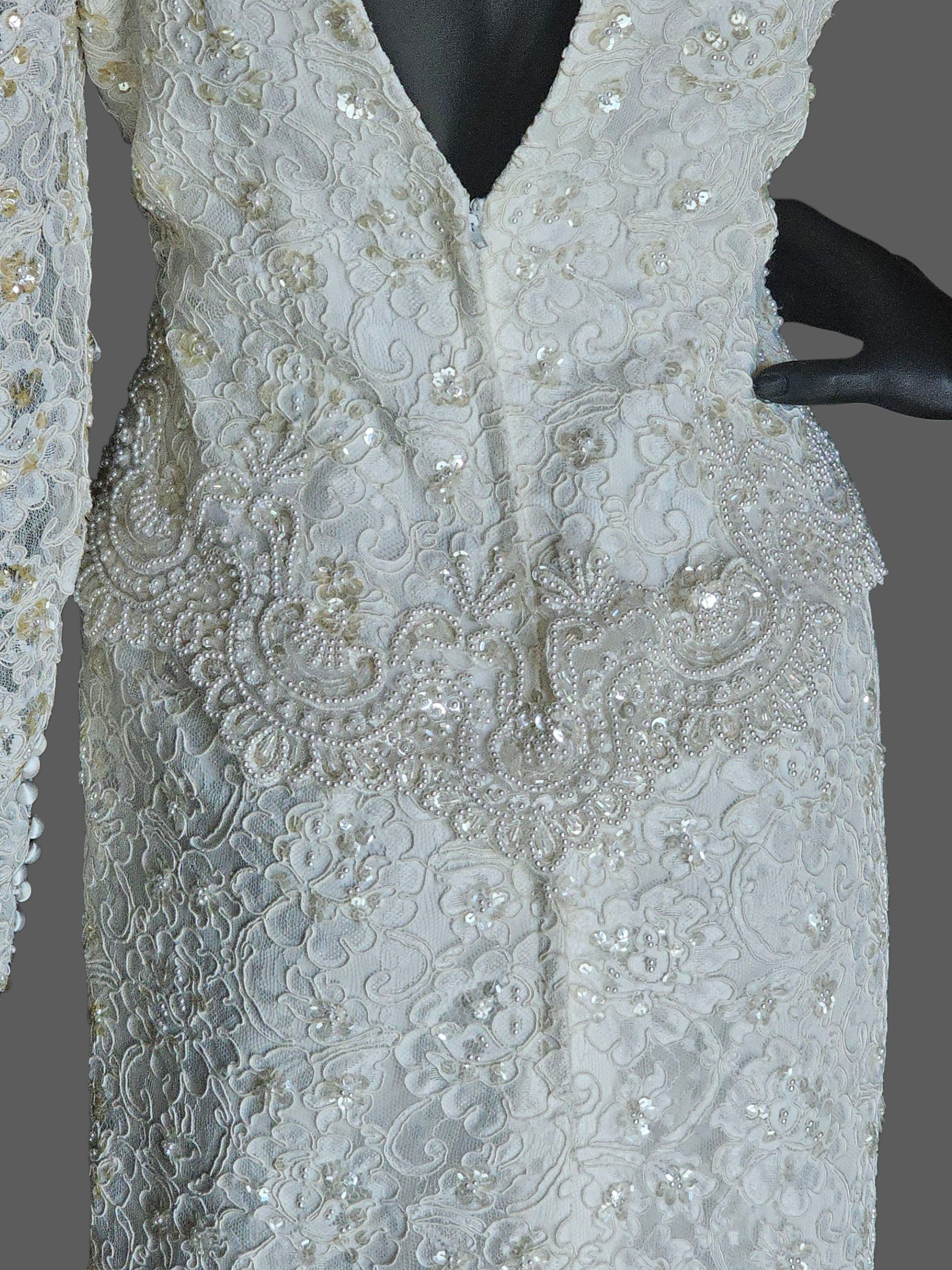 Vintage Ivory Beaded Lace Long Sleeve Fitted Sheath Wedding Gown