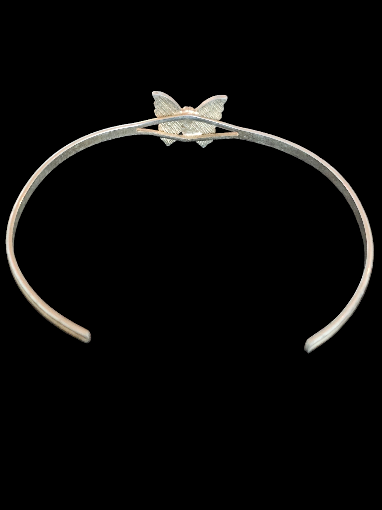 Indulge in the sweet and chic elegance of our Vintage Butterfly Cuff Bracelet. The slim silver band gracefully adorns your wrist while the cream enamel butterfly adds a touch of delicate charm. Perfect for any occasion, this stunning piece will elevate your style with its timeless beauty.