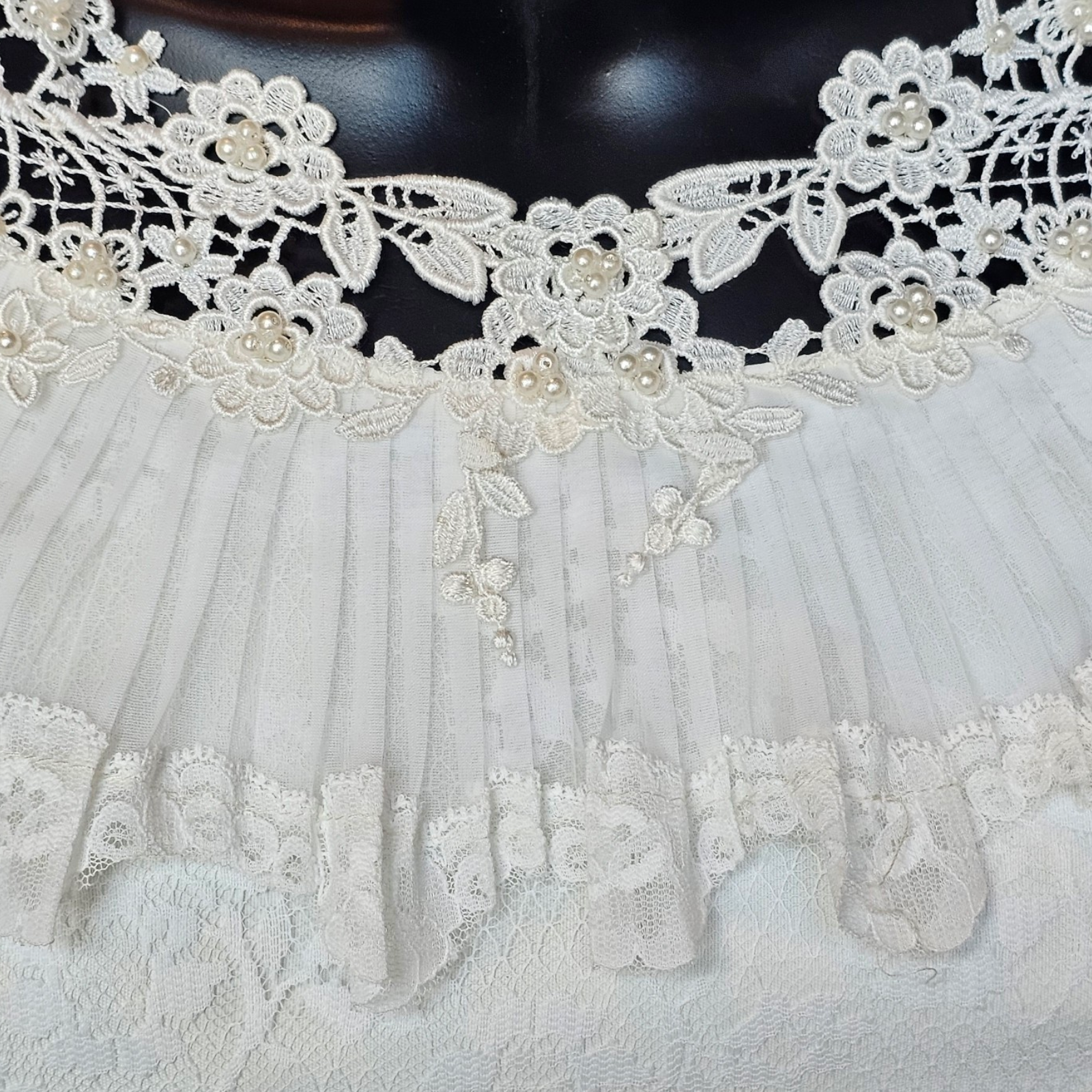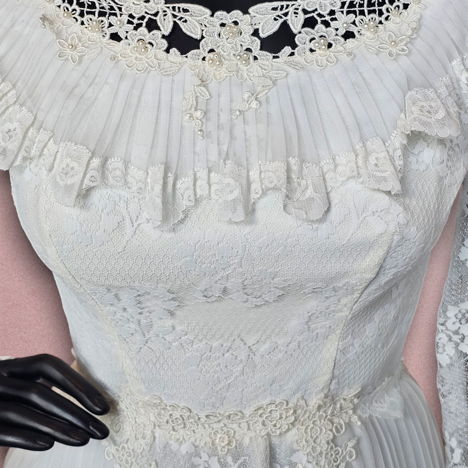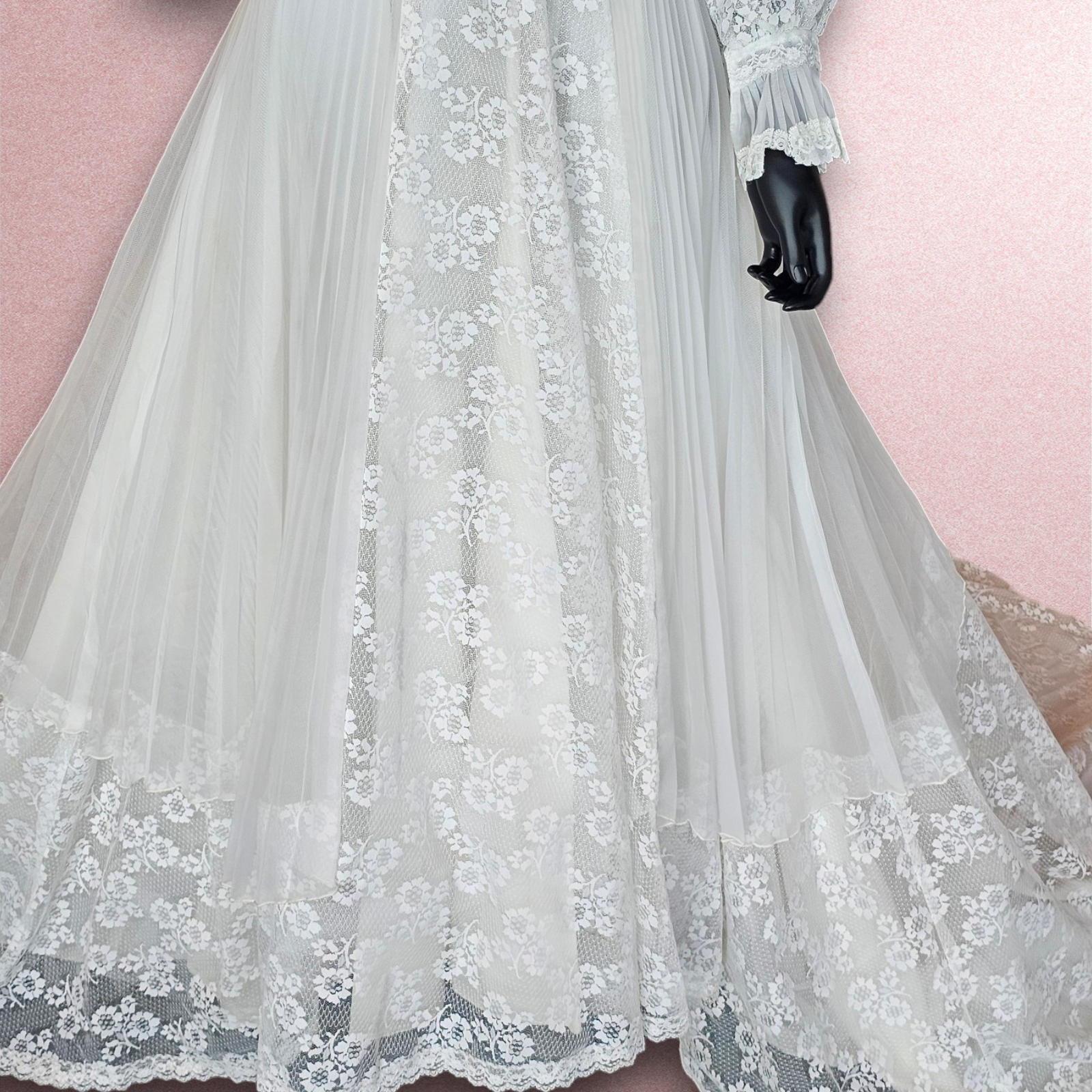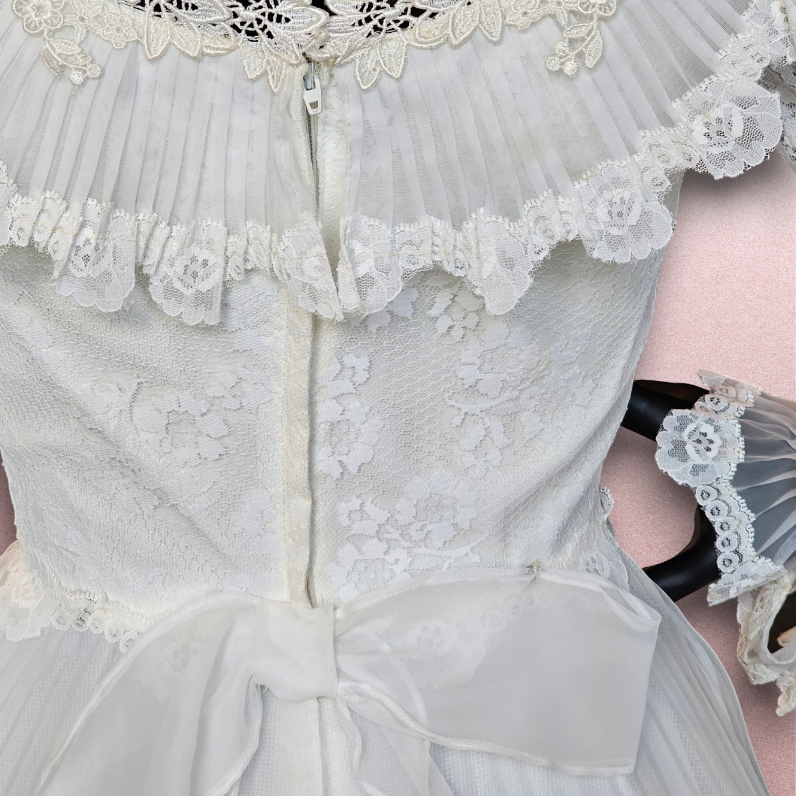 This vintage wedding gown exudes sweet romance with the plethora of amazing details from its flowing accordion pleat organza overly, lovely ruffles and puffed lace sleeves. The tiered skirt and chapel train add a touch of elegance and grace. Perfect for a dreamy and romantic wedding day.