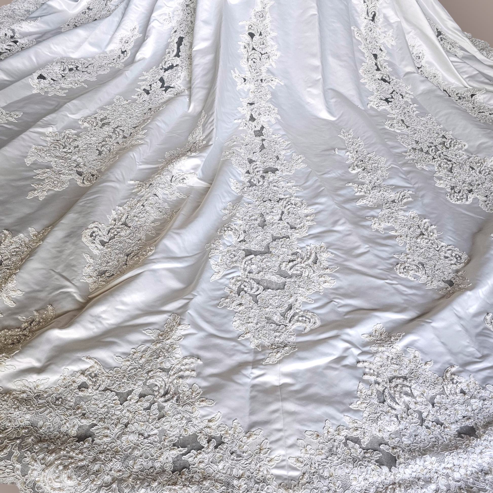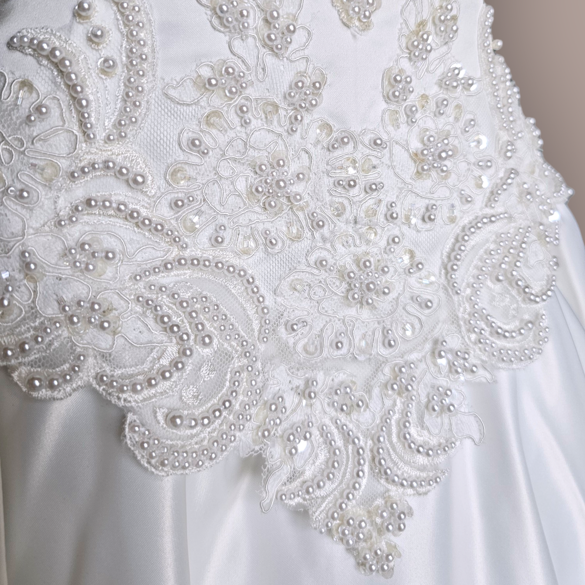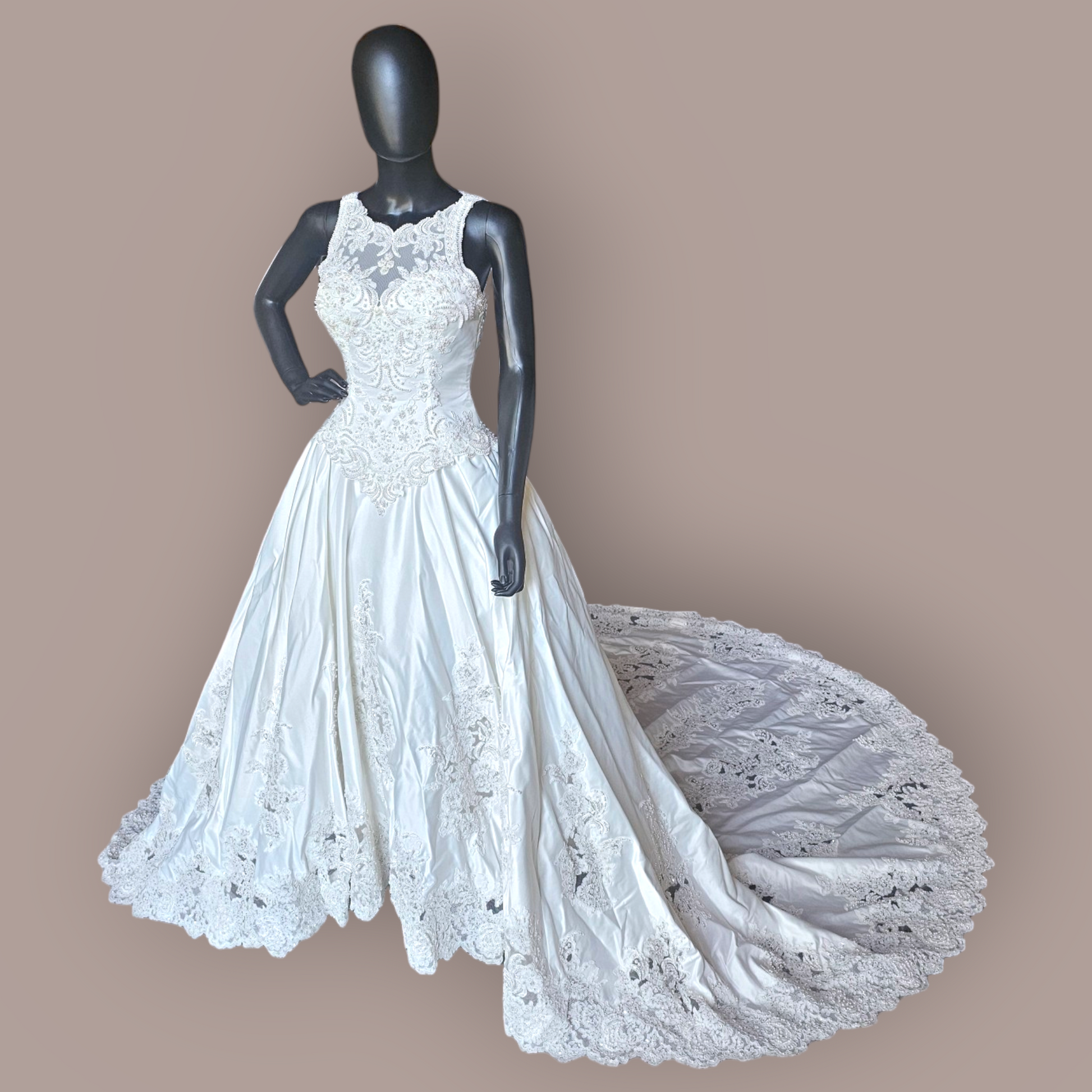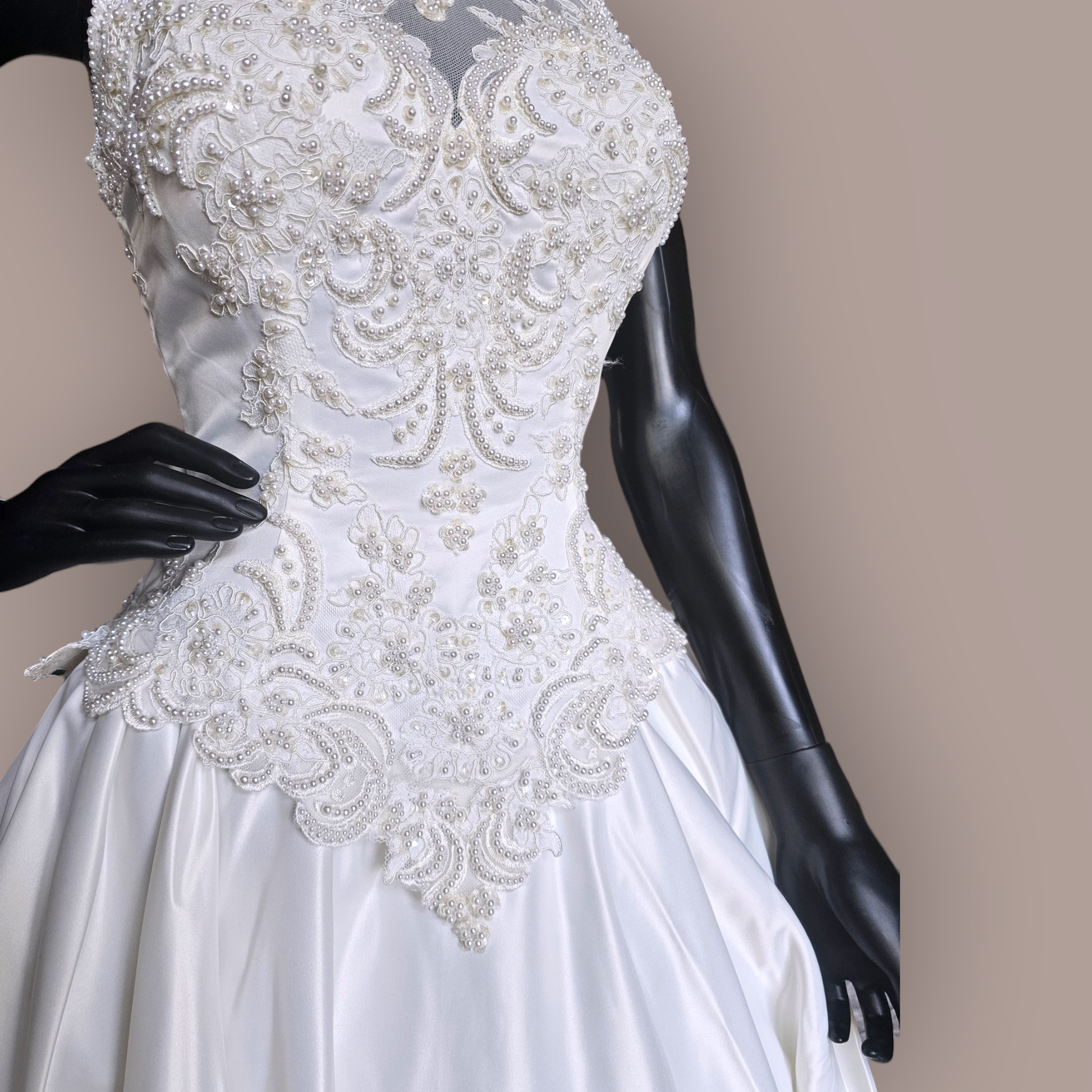 Indulge in the epitome of elegance with our Vintage Ginza Sleeveless Regal Train Wedding Gown. Crafted from luxurious ivory satin, this gown boasts a fitted bodice with a gathered basque waist, an illusion neckline and back, and exquisite pearl and beaded details. The scalloped lace hemline adds a touch of romance, while the zipper and button closure ensure a perfect fit. Make a statement with the regal length train encrusted with more pearls, corded lace and mesh netting. Absolutely stunning!
