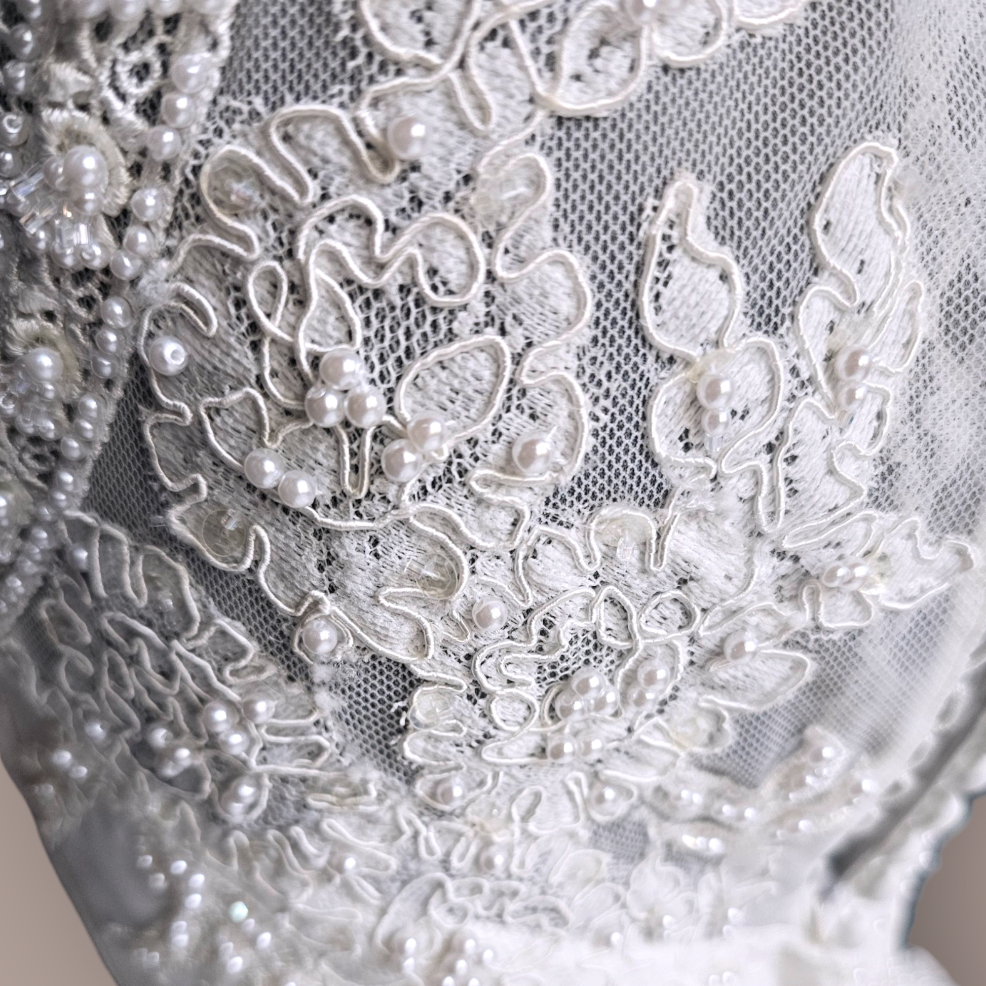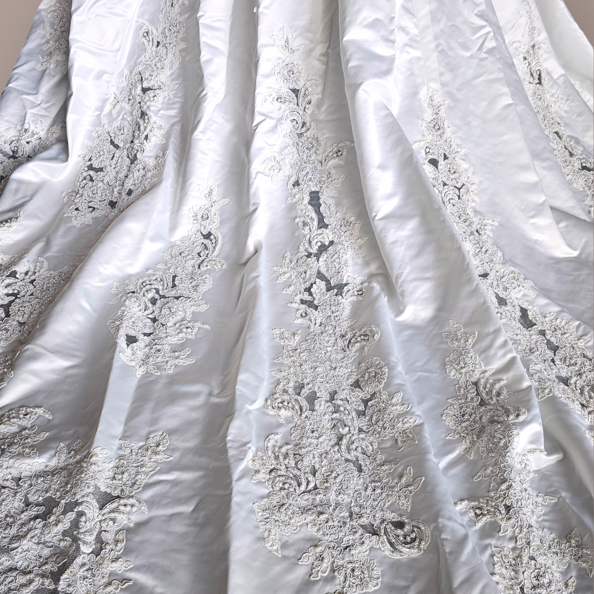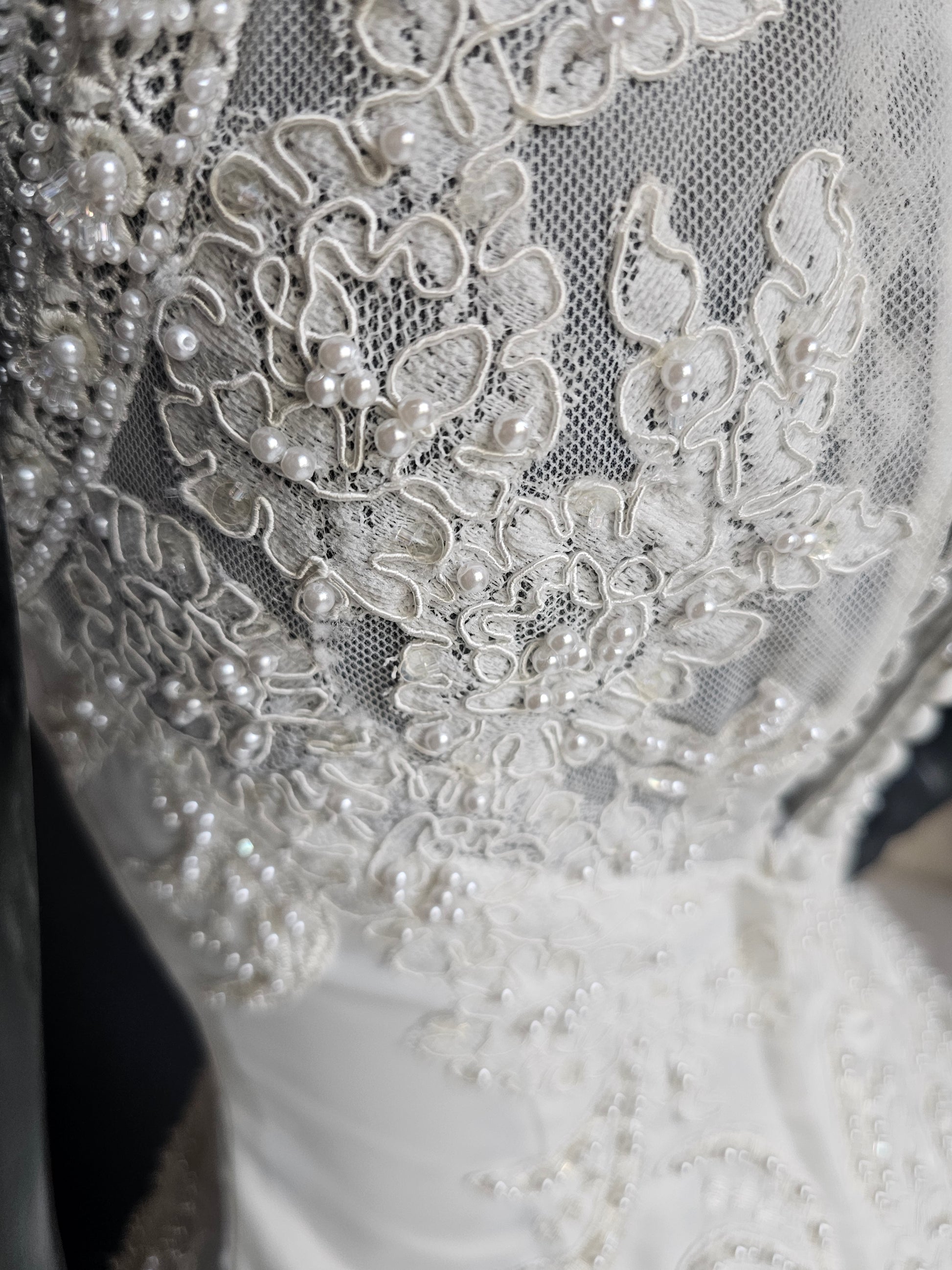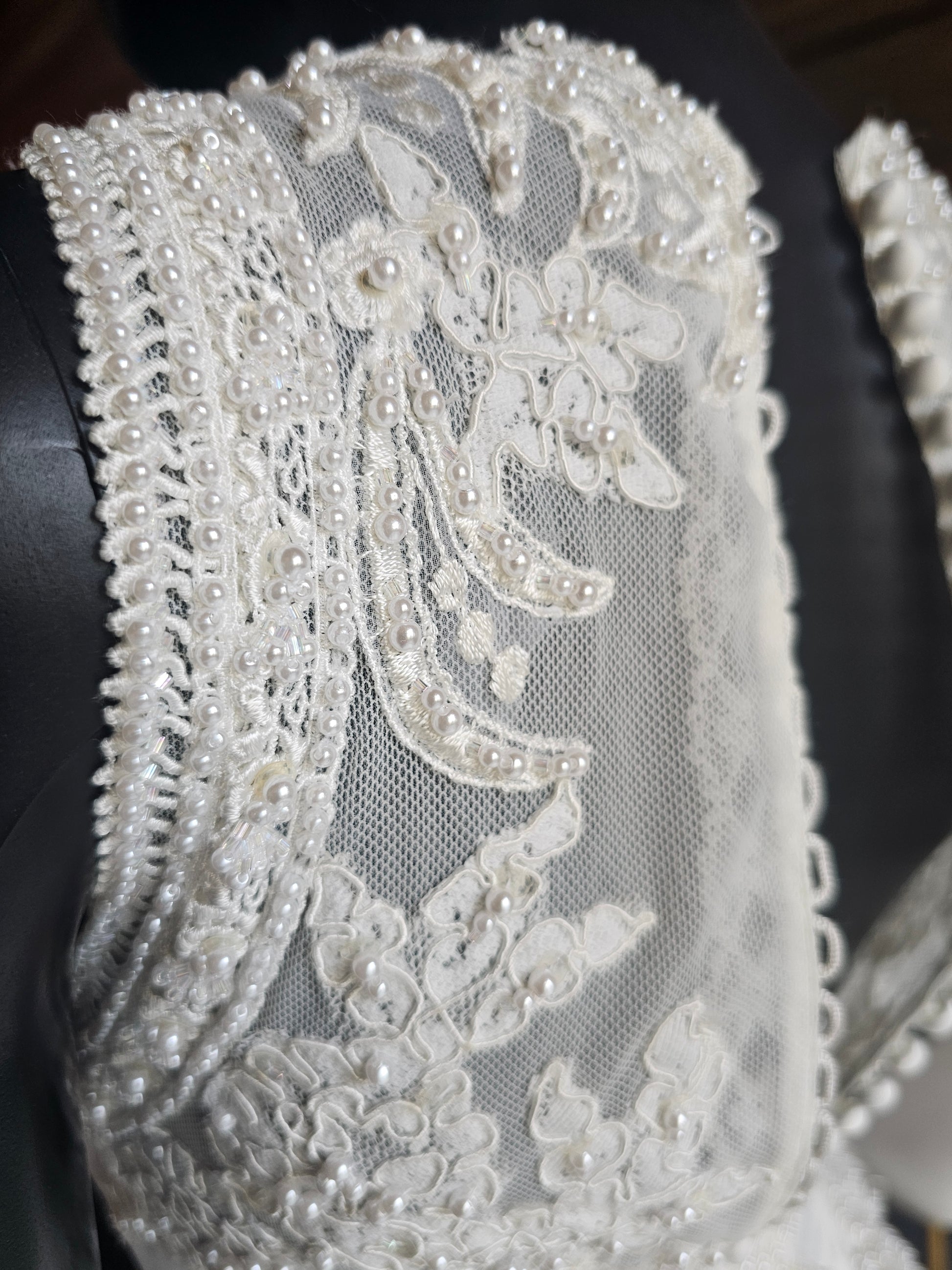 Indulge in the epitome of elegance with our Vintage Ginza Sleeveless Regal Train Wedding Gown. Crafted from luxurious ivory satin, this gown boasts a fitted bodice with a gathered basque waist, an illusion neckline and back, and exquisite pearl and beaded details. The scalloped lace hemline adds a touch of romance, while the zipper and button closure ensure a perfect fit. Make a statement with the regal length train encrusted with more pearls, corded lace and mesh netting. Absolutely stunning!