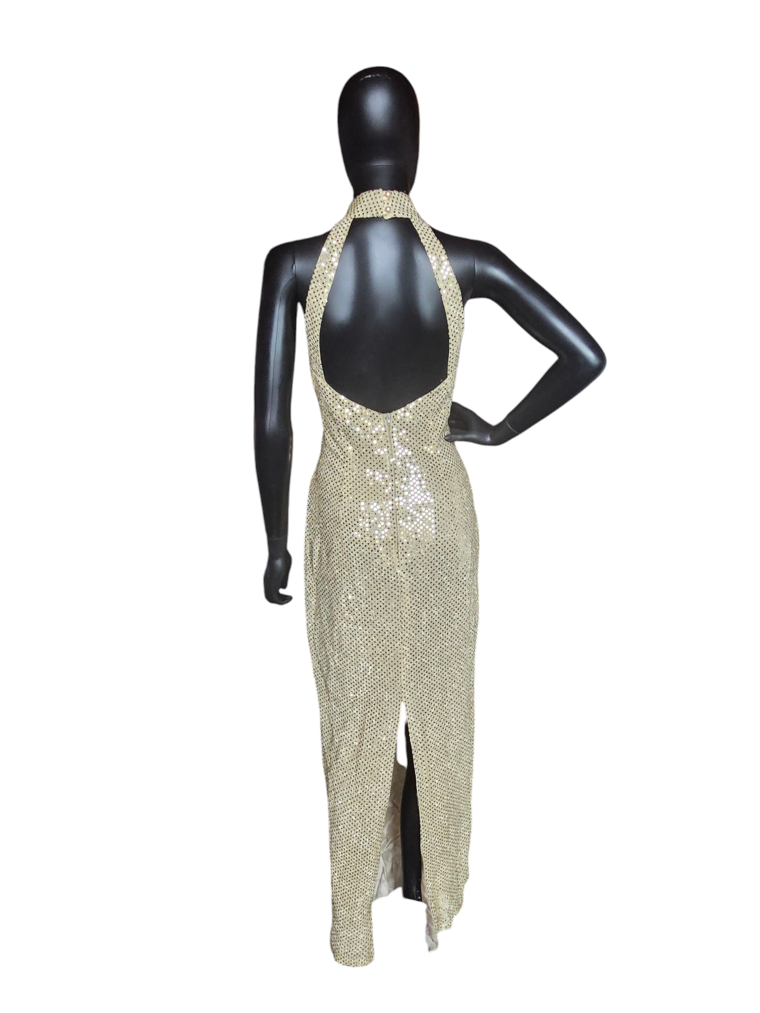 Indulge in 90's nostalgia with our Vintage Gold Sequin Halter Sheath. The gold mirrored fabric shimmers in the light, while the racer-cut halter and open back add a touch of sensuality. The fitted silhouette and back slit exude sophistication and class. Elevate your special event with this exclusive piece.
