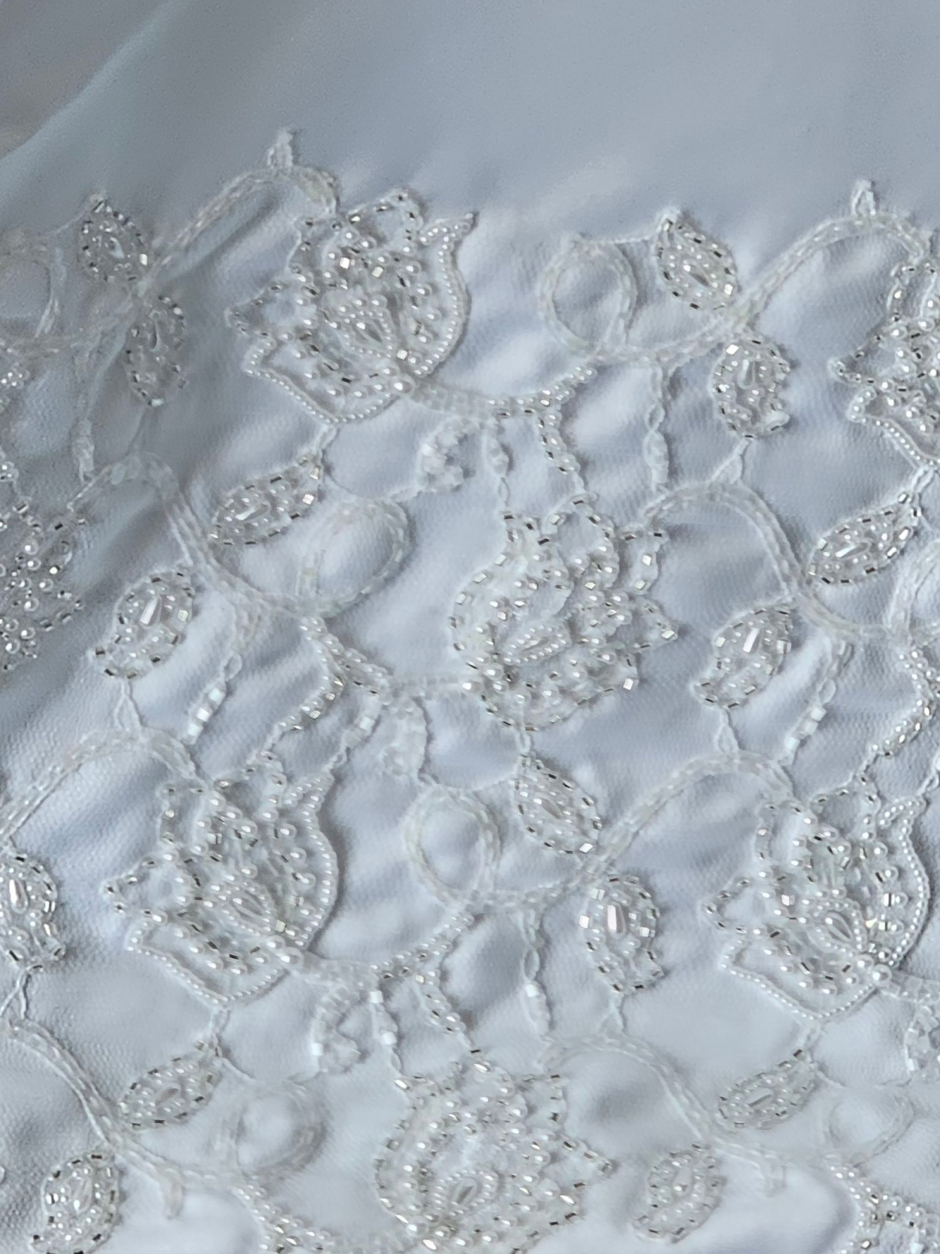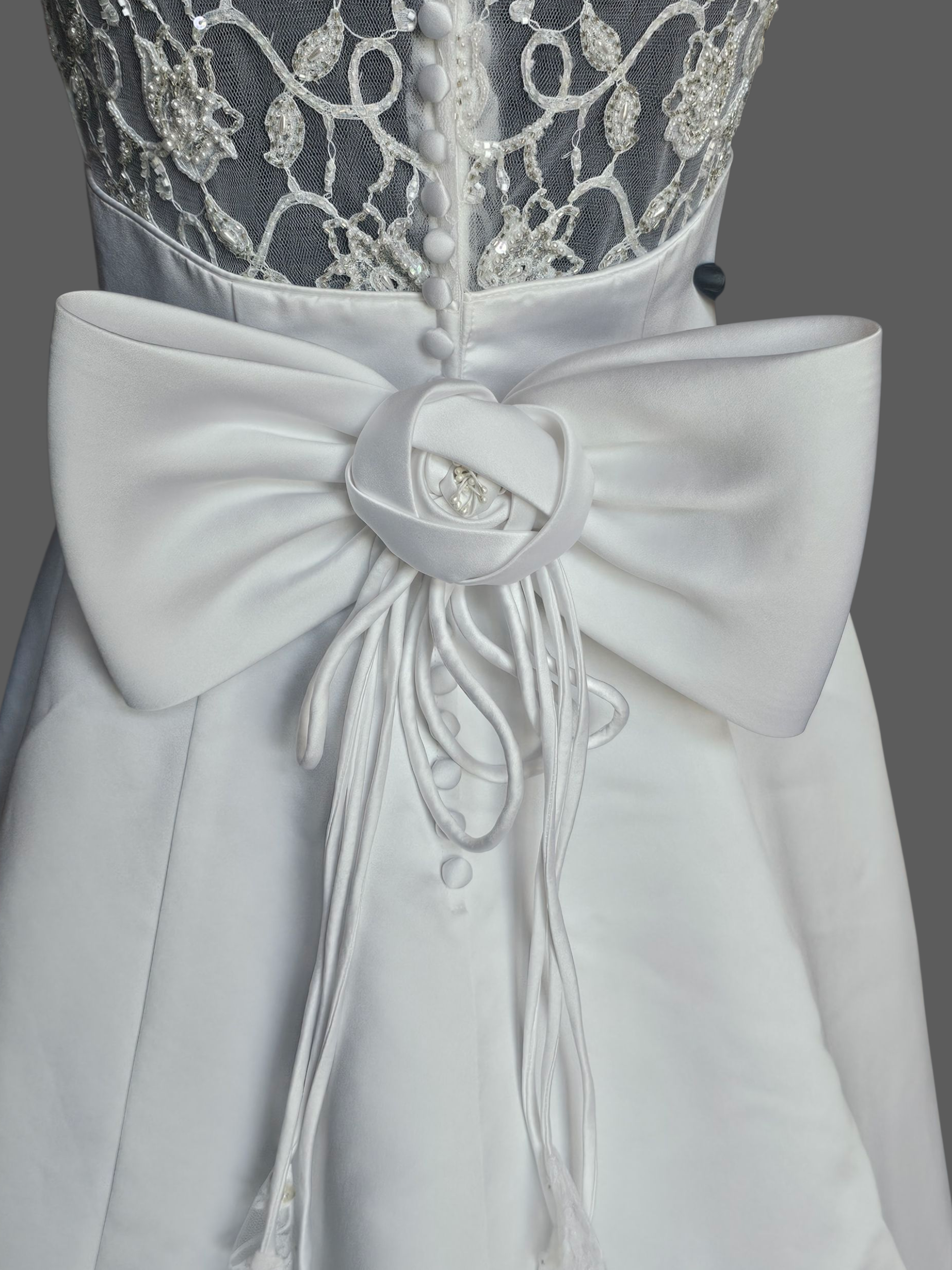 USED - in very good shape. Bustle is present, but one or more of the hooks has come undone and will need to be re-sewn.