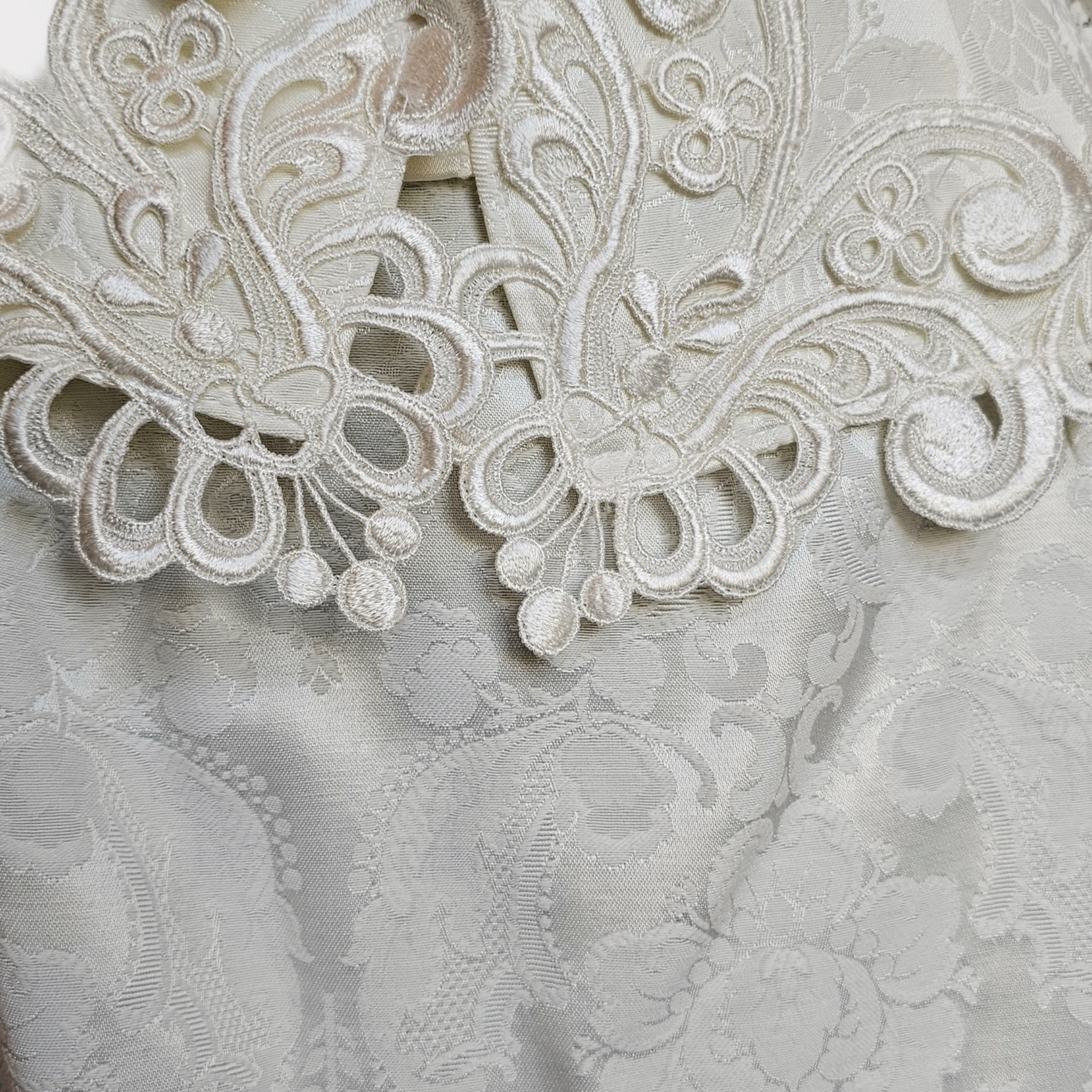 Indulge in vintage elegance with the Jessica McClintock Courthouse Wedding Jacket/Skirt. The sophisticated ivory brocade is adorned with intricate lace details. The pearl buttons and illusion lace back add a touch of luxury. The straight cut skirt completes the exclusive ensemble.