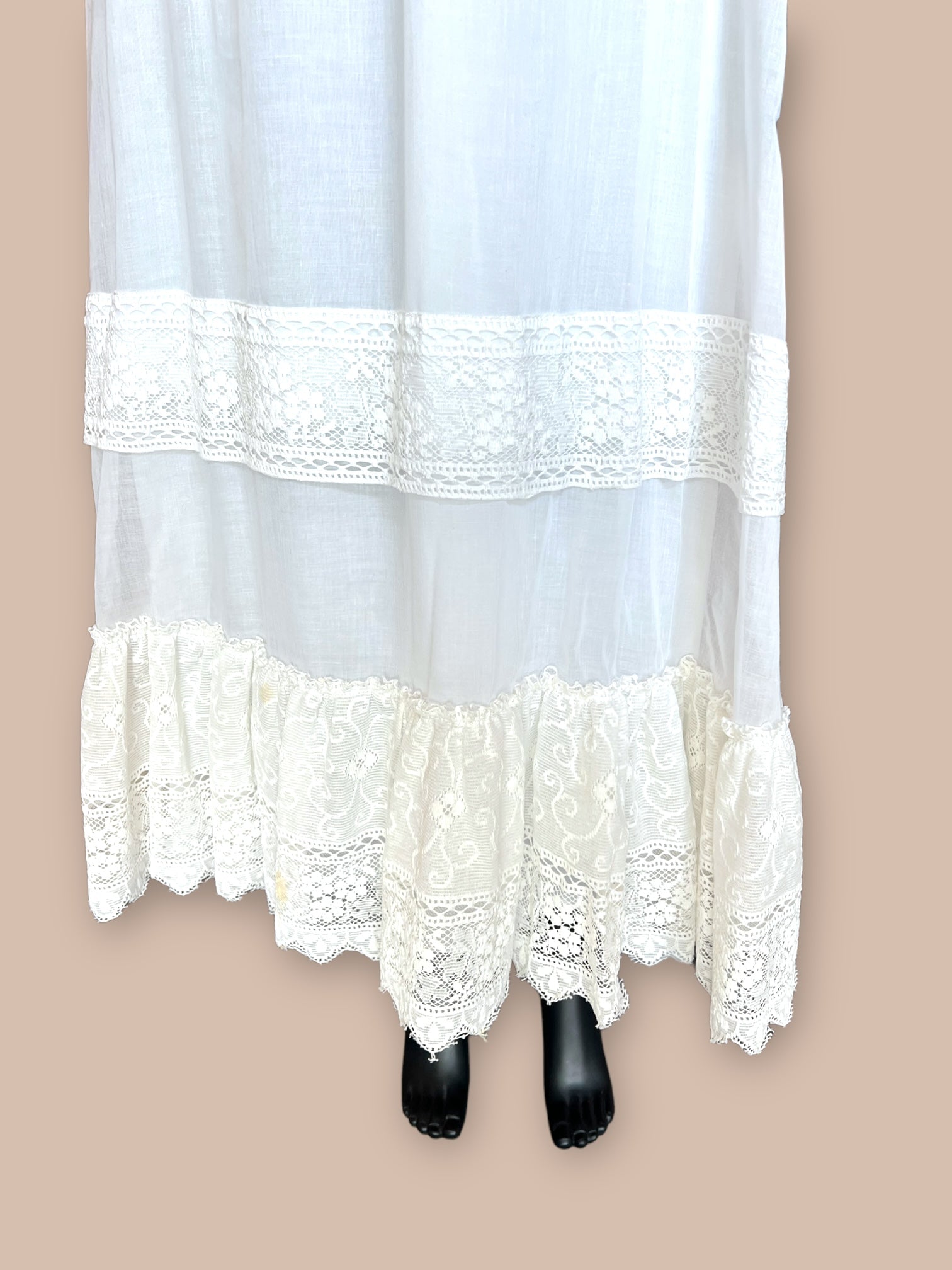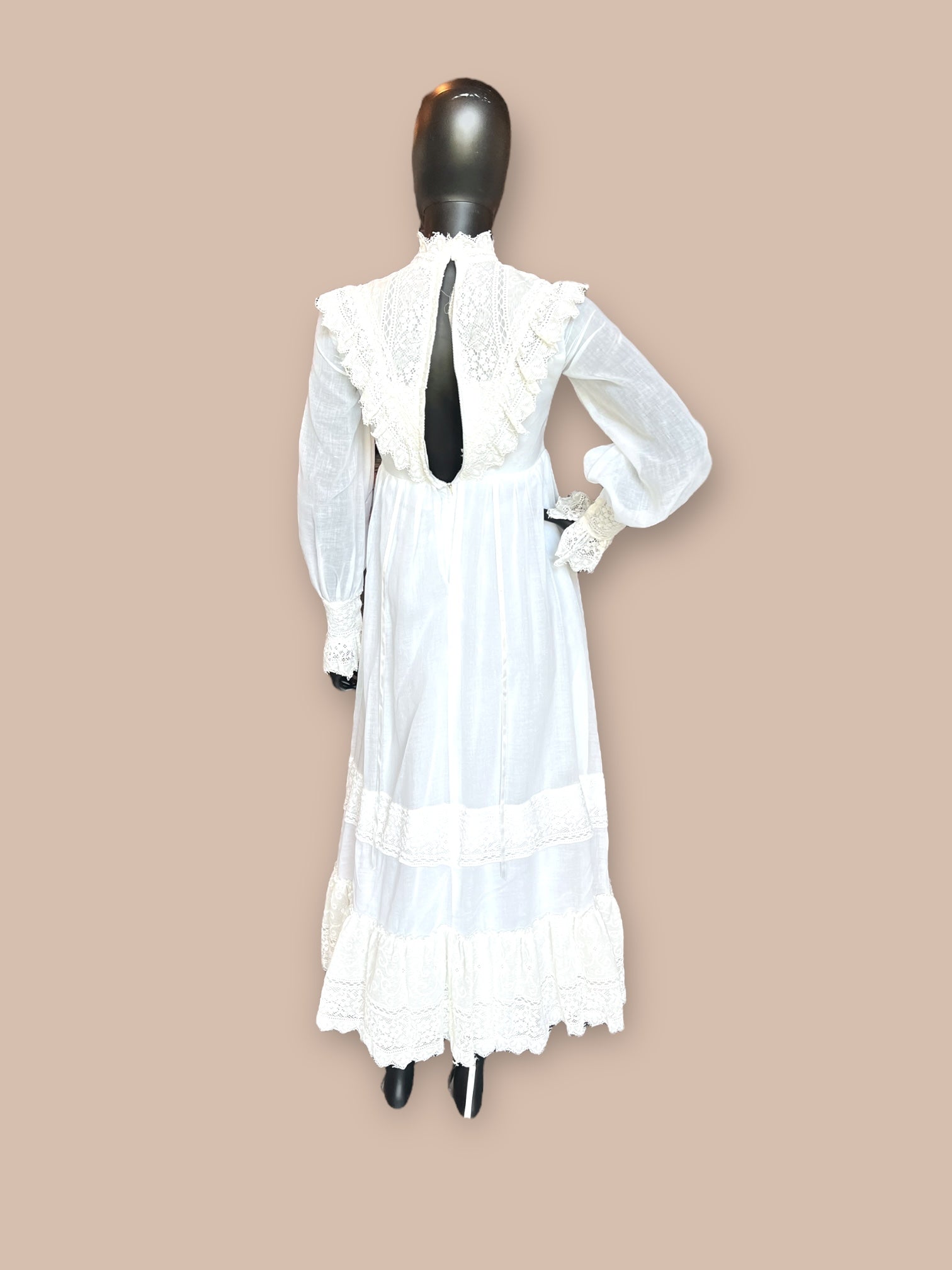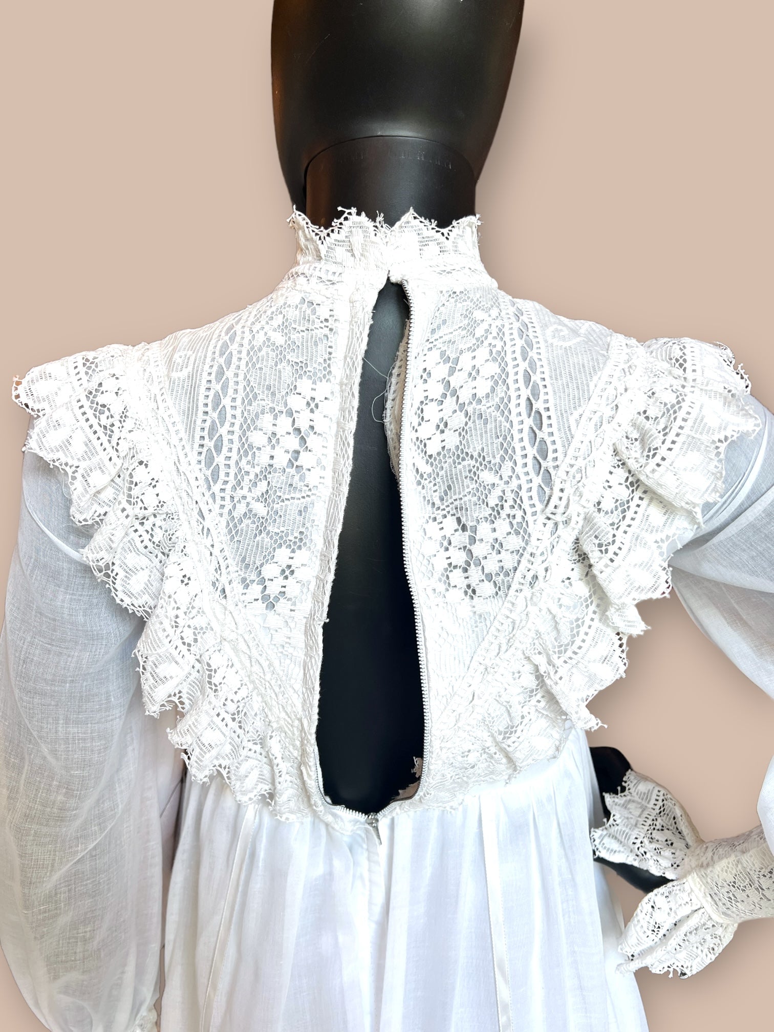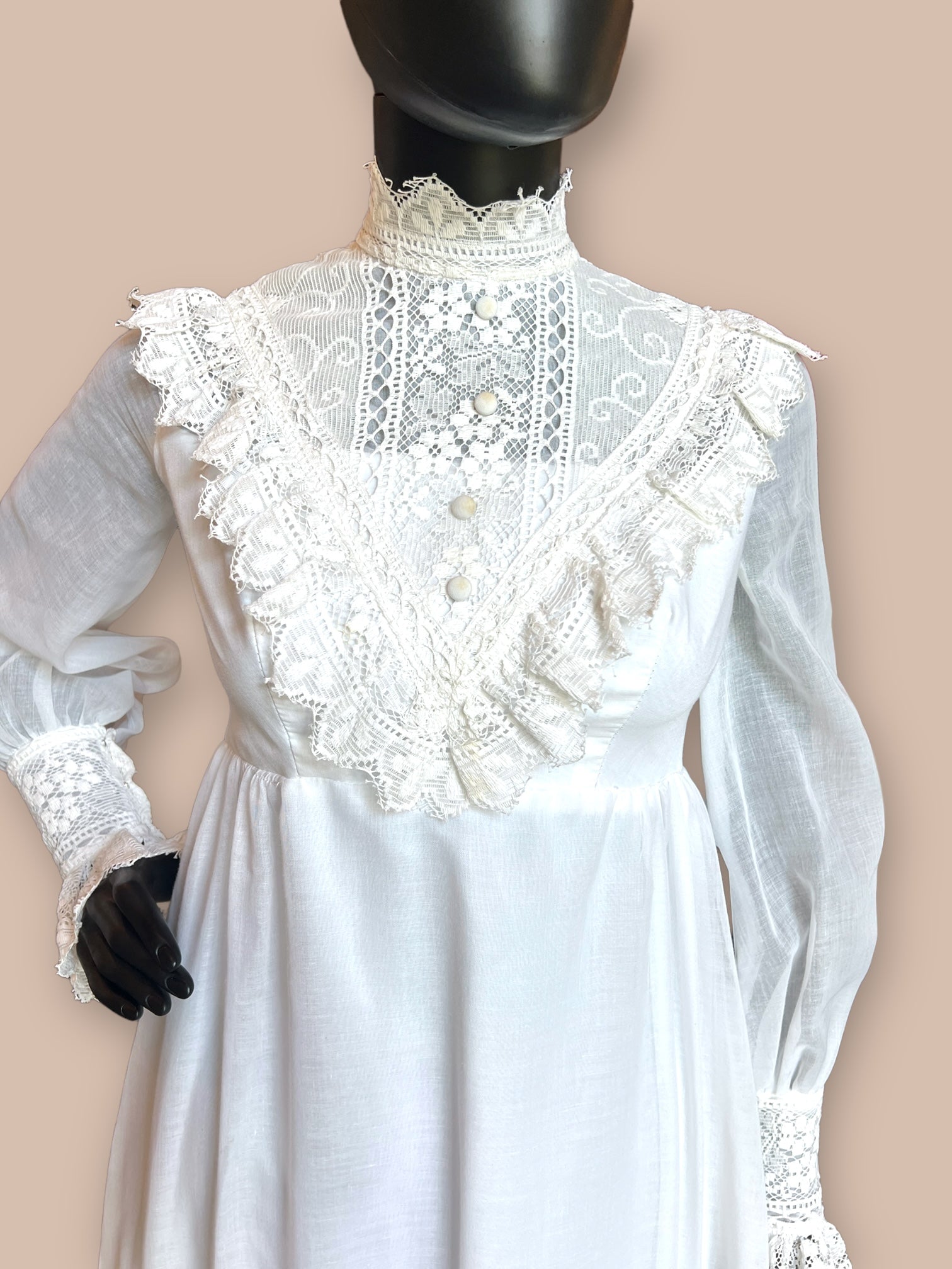 This beautifully crafted wedding gown embraces vintage cottagecore style with its light voile fabric, accentuated by heavy lace accents at the high neck and wrists. The tiered hemline adds a touch of elegance to this timeless piece. Perfect for the classic and romantic bride.