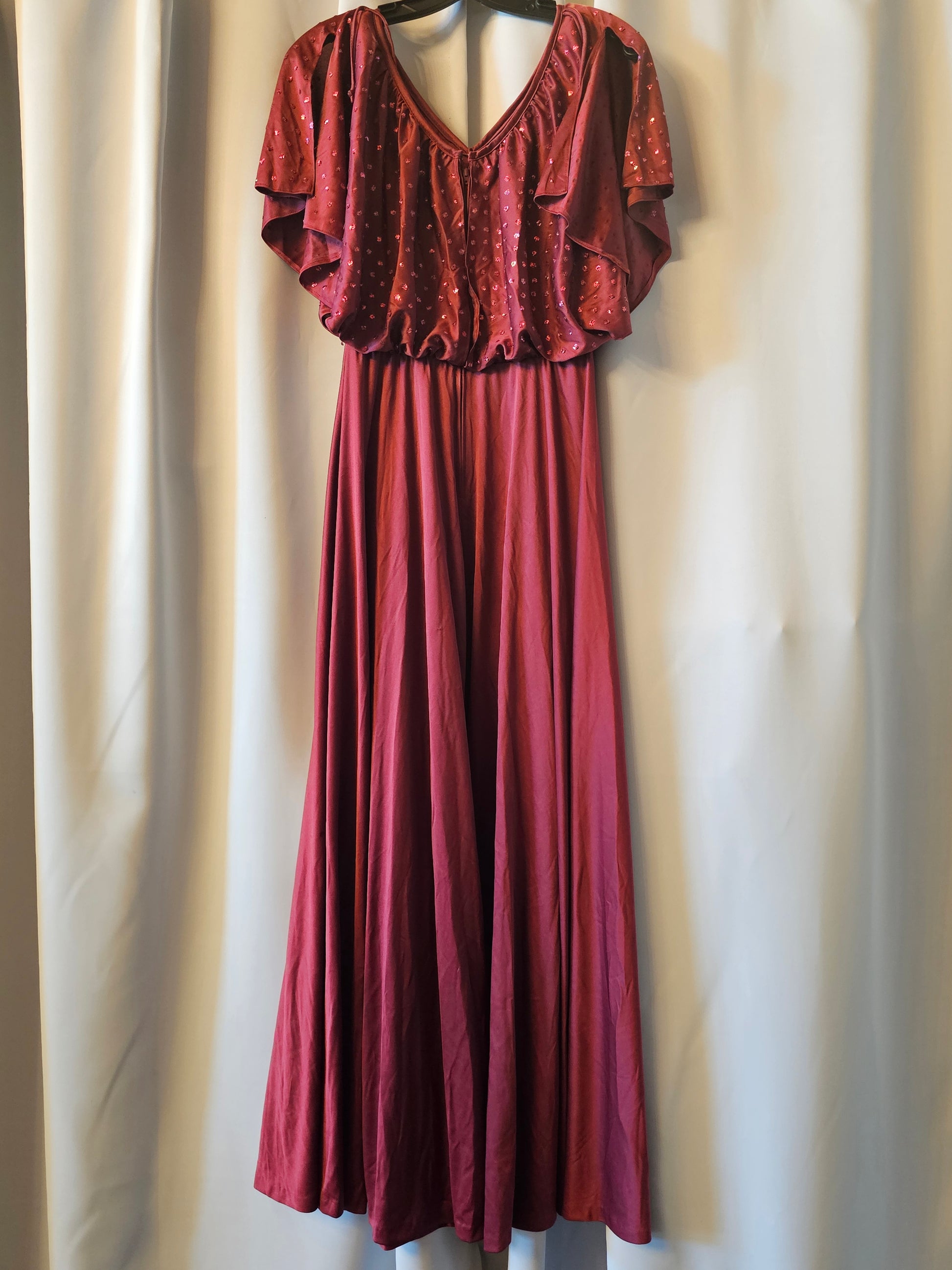 This vintage 70's look gown has a little extra pizzazz with the sparkle polka-dot flutter top and full skirt. This gown accentuates the waist and sparkles in the light! Wear this to prom, a night out, or to a wedding.