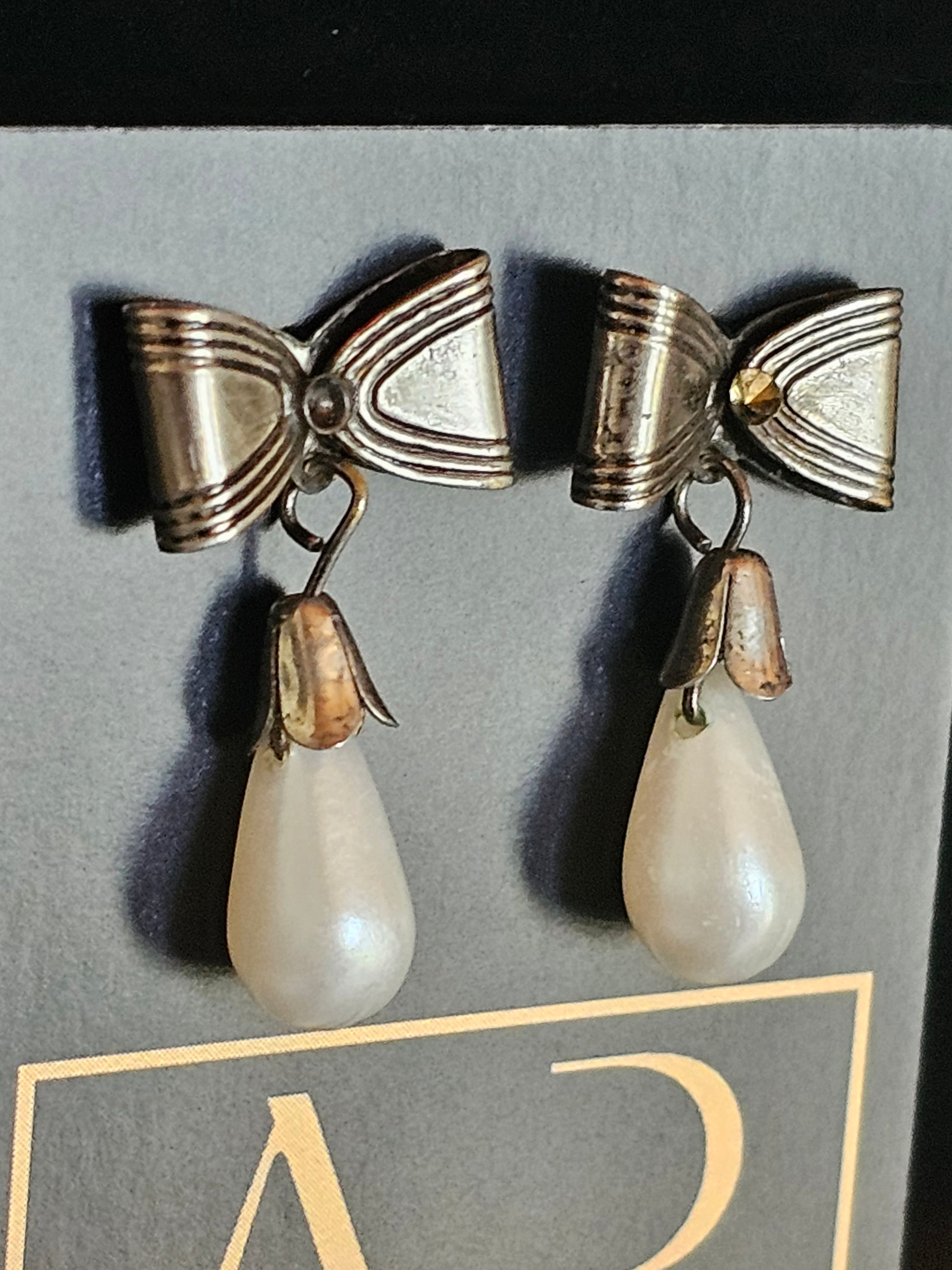 Vintage Silver Bow/Faux Pearl Drop Earring