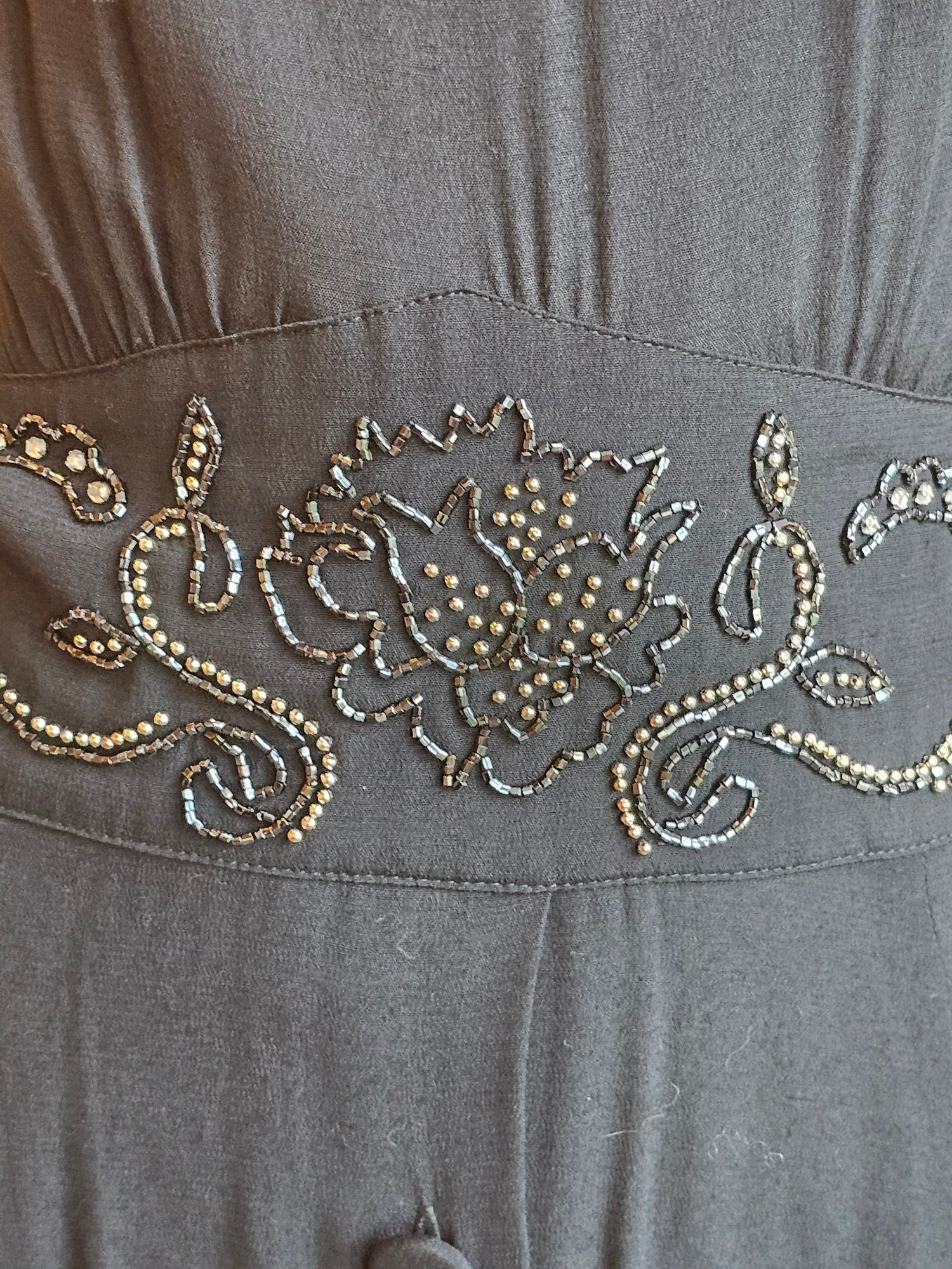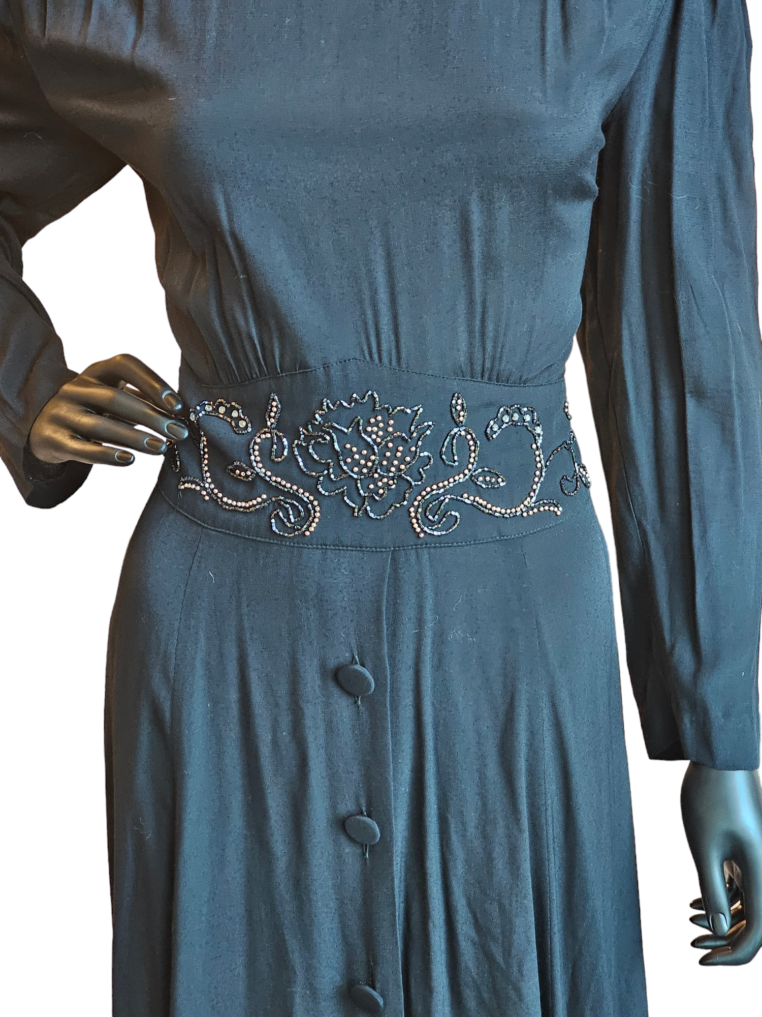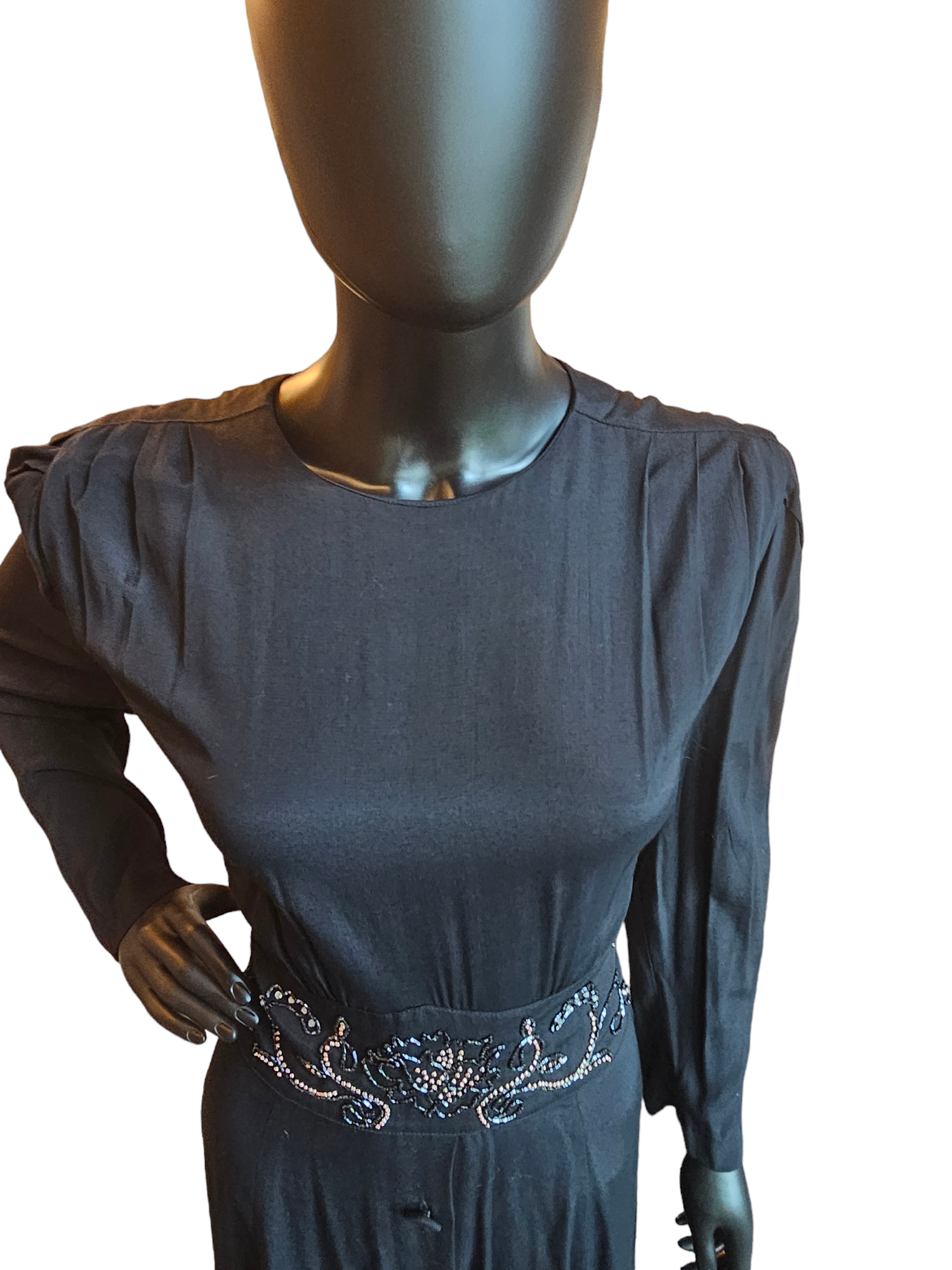 Special Attributes: Full sleeves, beaded waist, buttons down the skirt and back