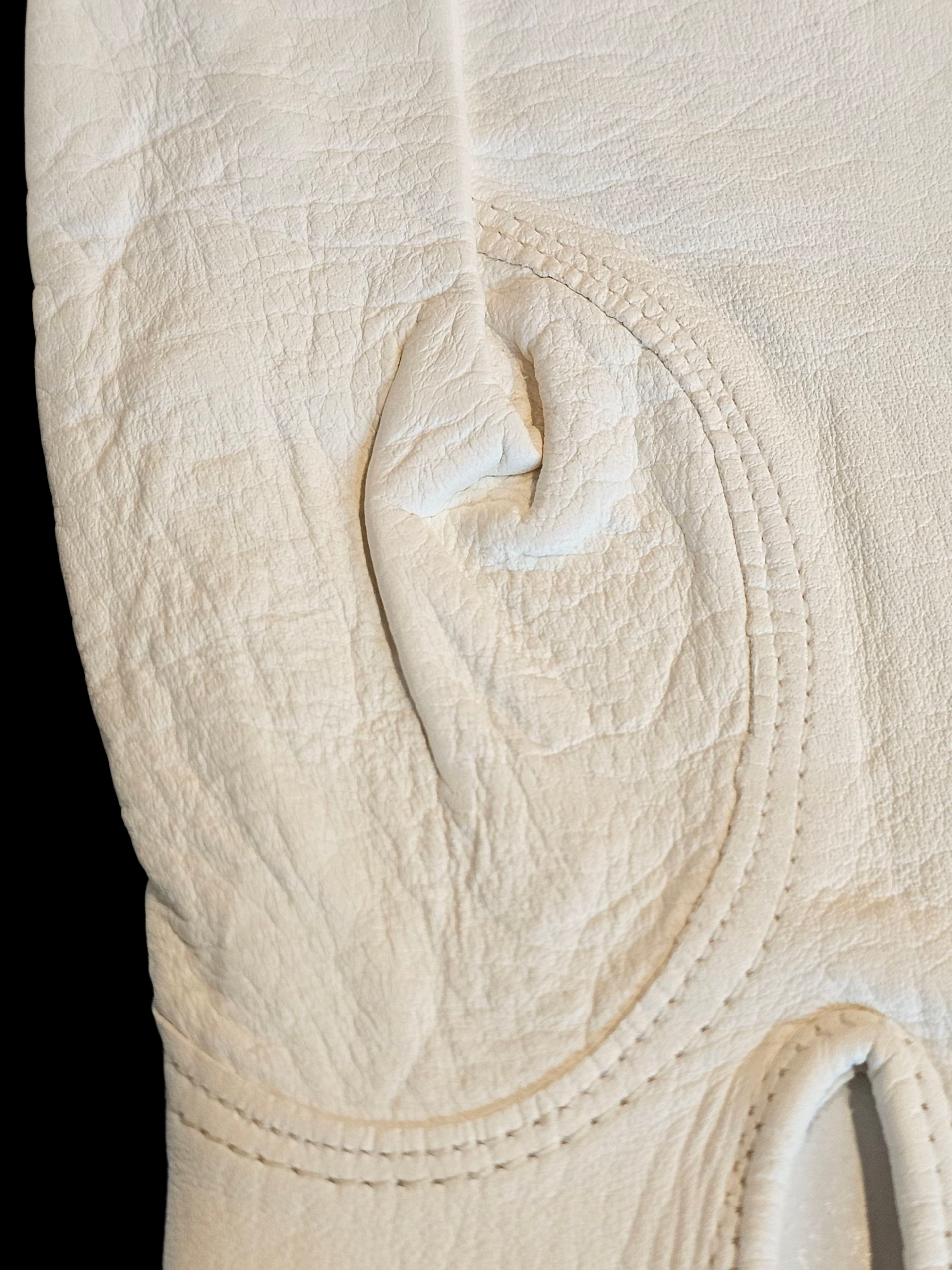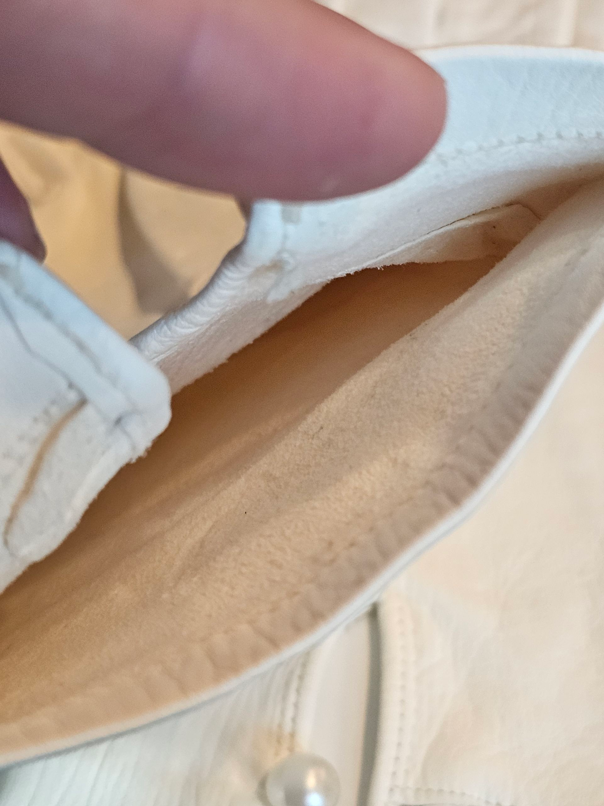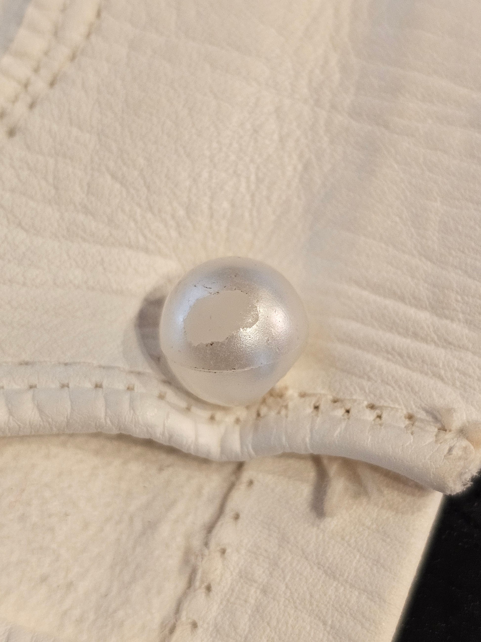 Pristine never worn white leather! Very soft and supple. The enamel on the small pearl buttons is coming off a little.