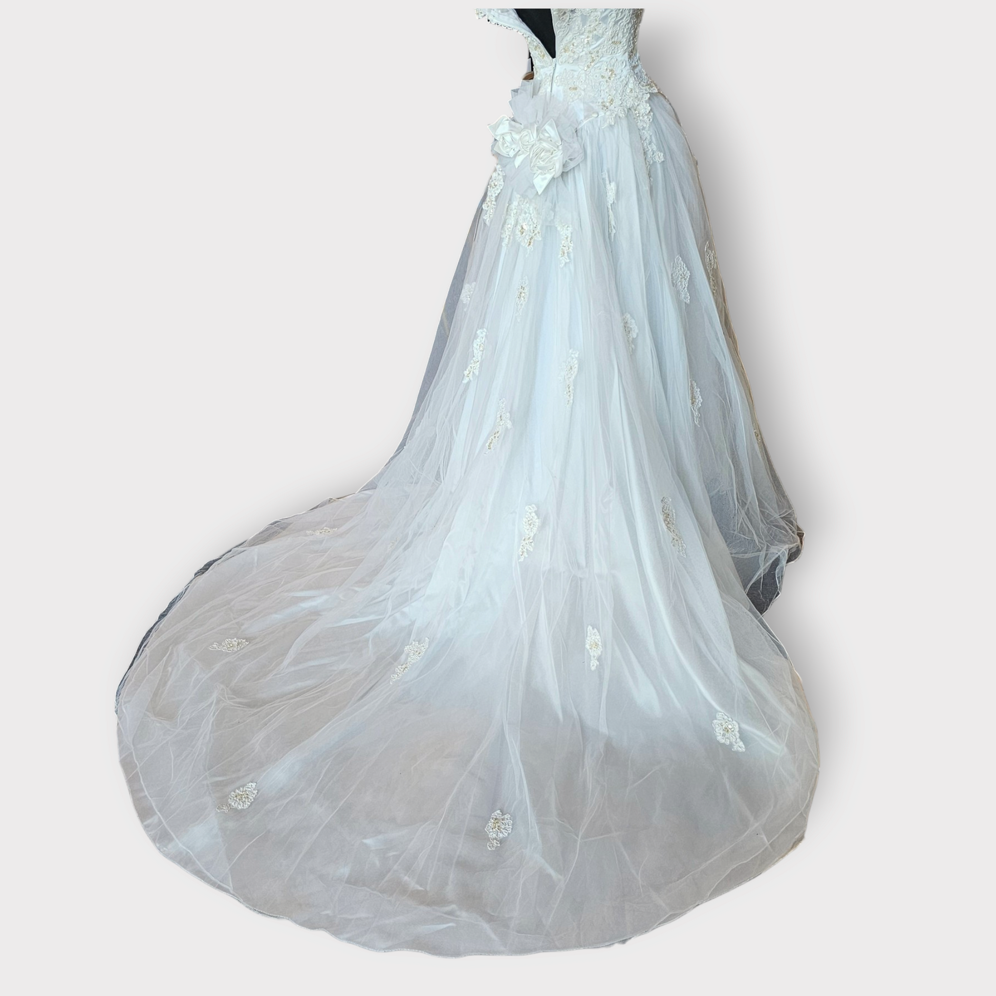 Indulge in the romance and luxury of our Vintage Mon Cheri Ballgown Wedding Dress. The fitted bodice is embellished with delicate sequins and beaded applique details while the multi-layered tulle ballgown style skirt adds a touch of whimsy. Complete with a long cathedral train, this dress is perfect for a dreamy and unforgettable wedding day.