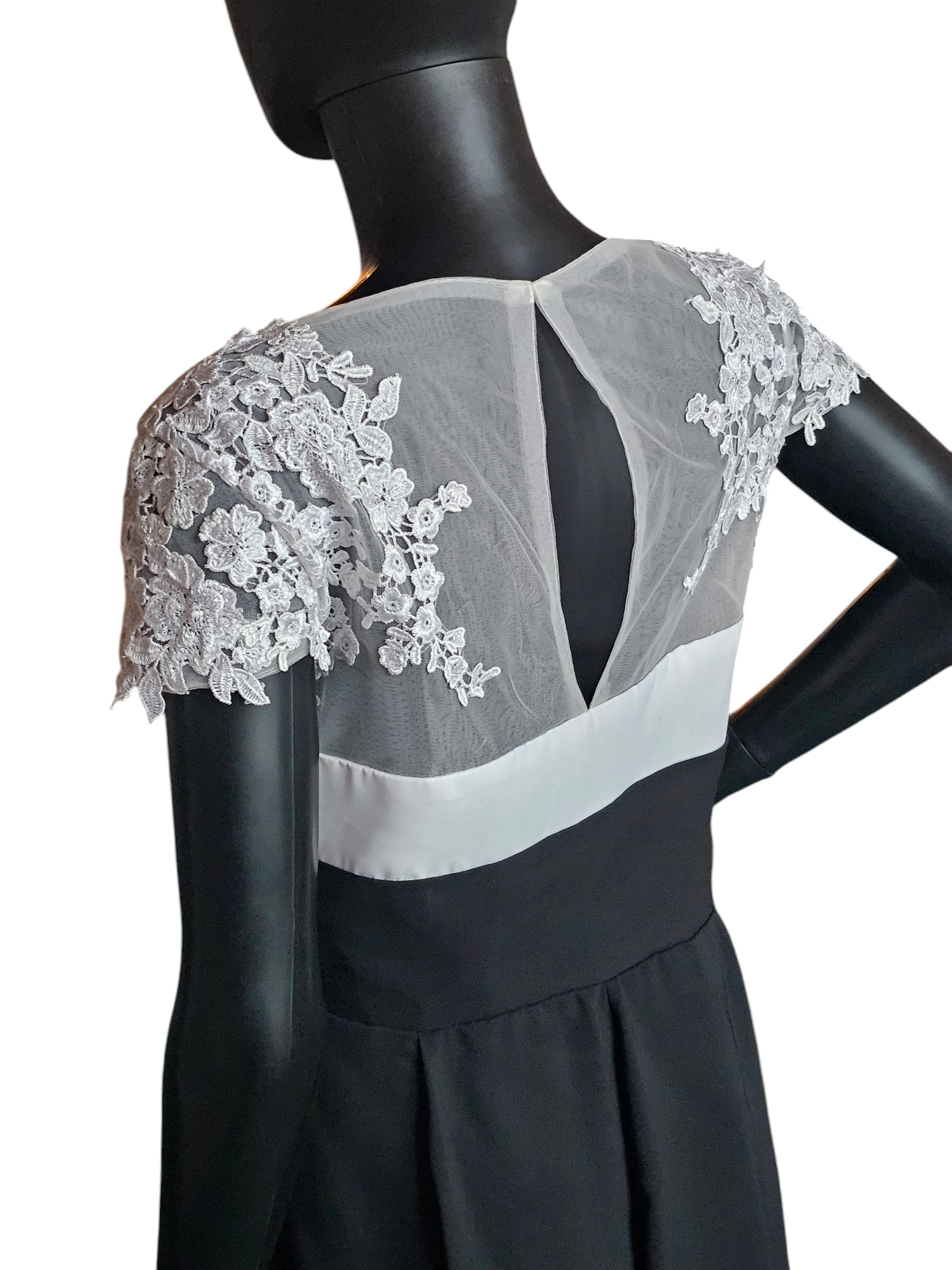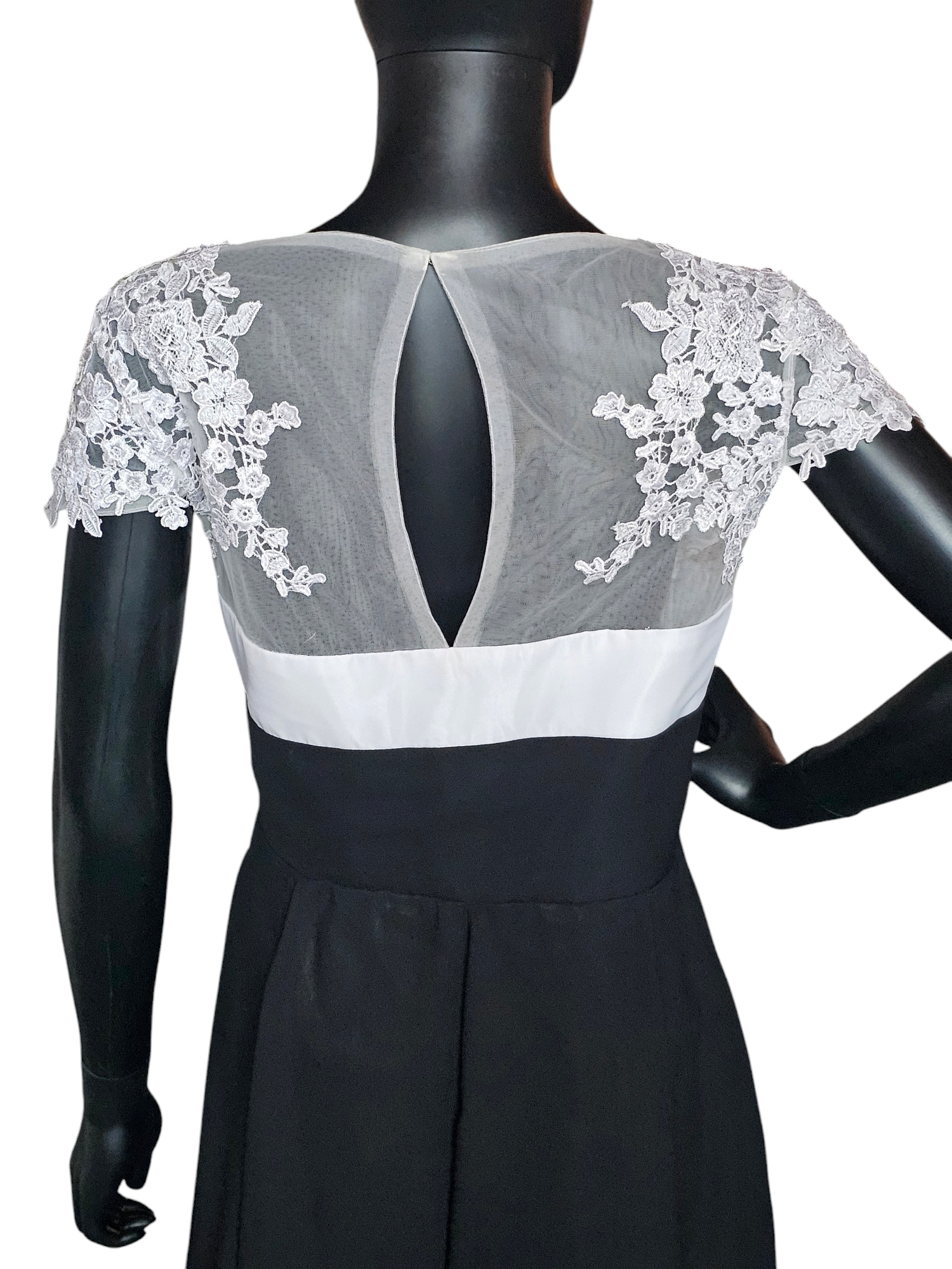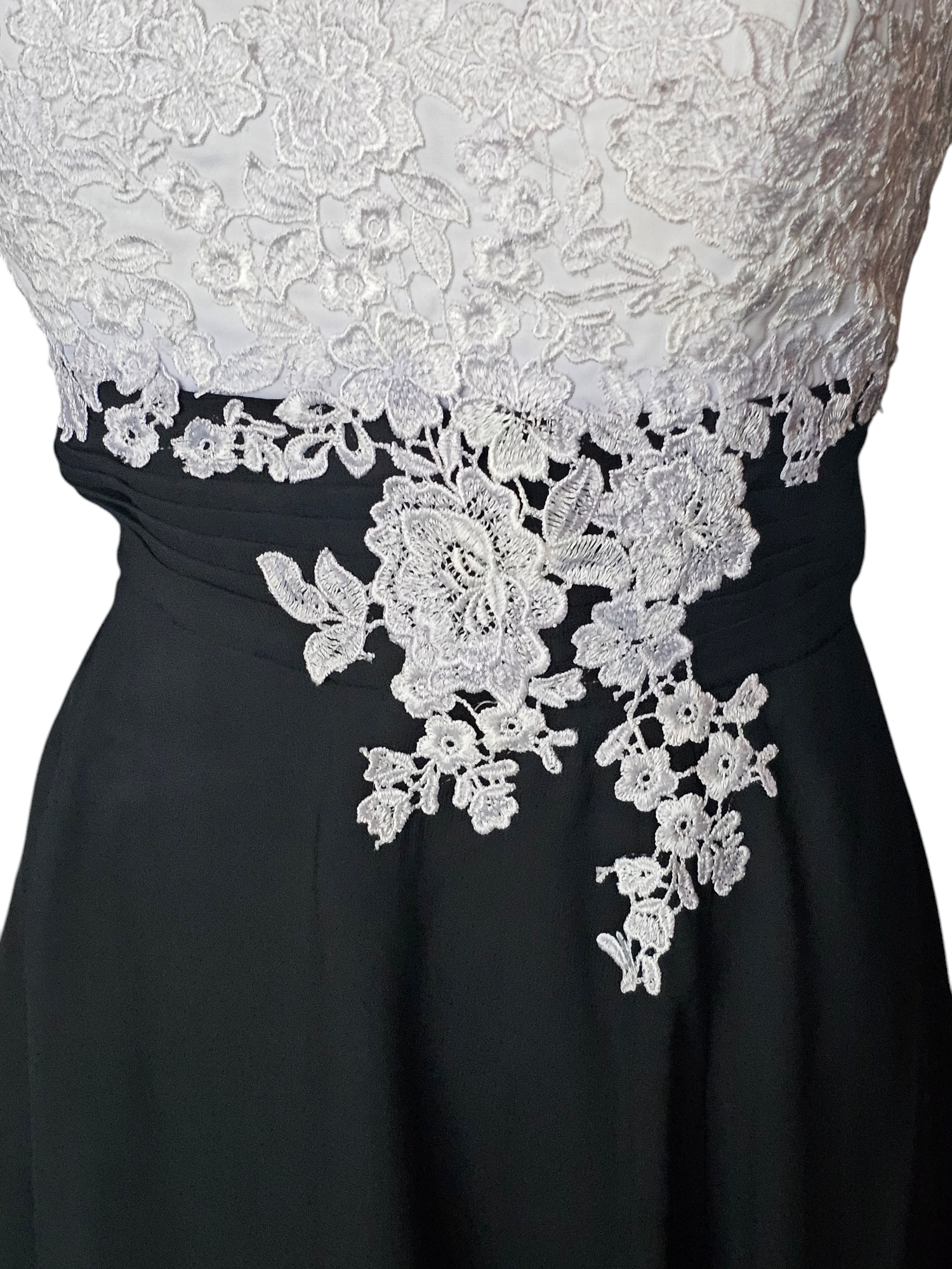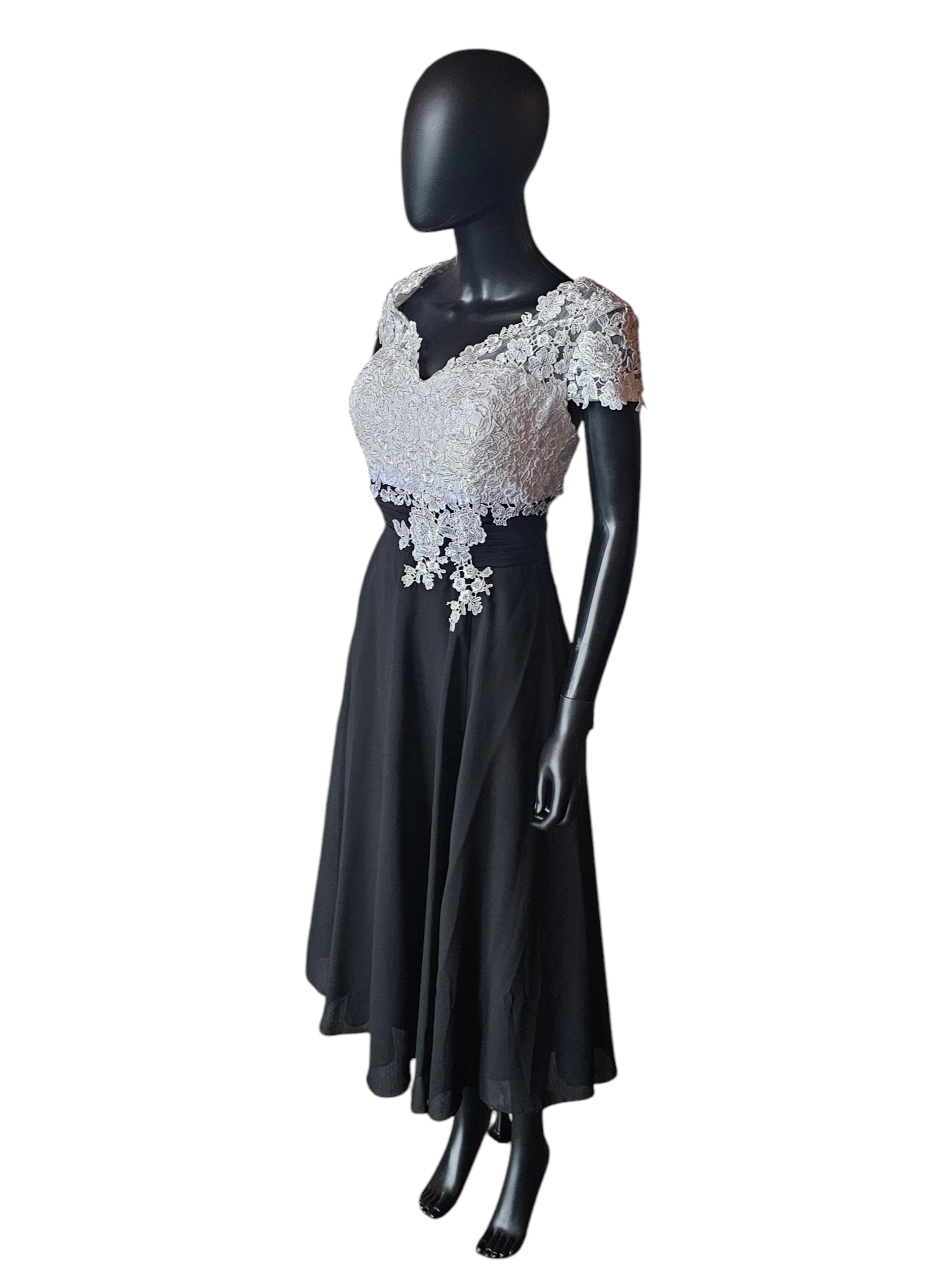 Elevate your formal look with our White/Black Lace Top Tea Length Formal Gown. The black chiffon and white lace bodice bring elegance to the full skirt and lace cap sleeve. The mid calf length is perfect for showing off your shoes. Expertly crafted for a classic and sophisticated silhouette.