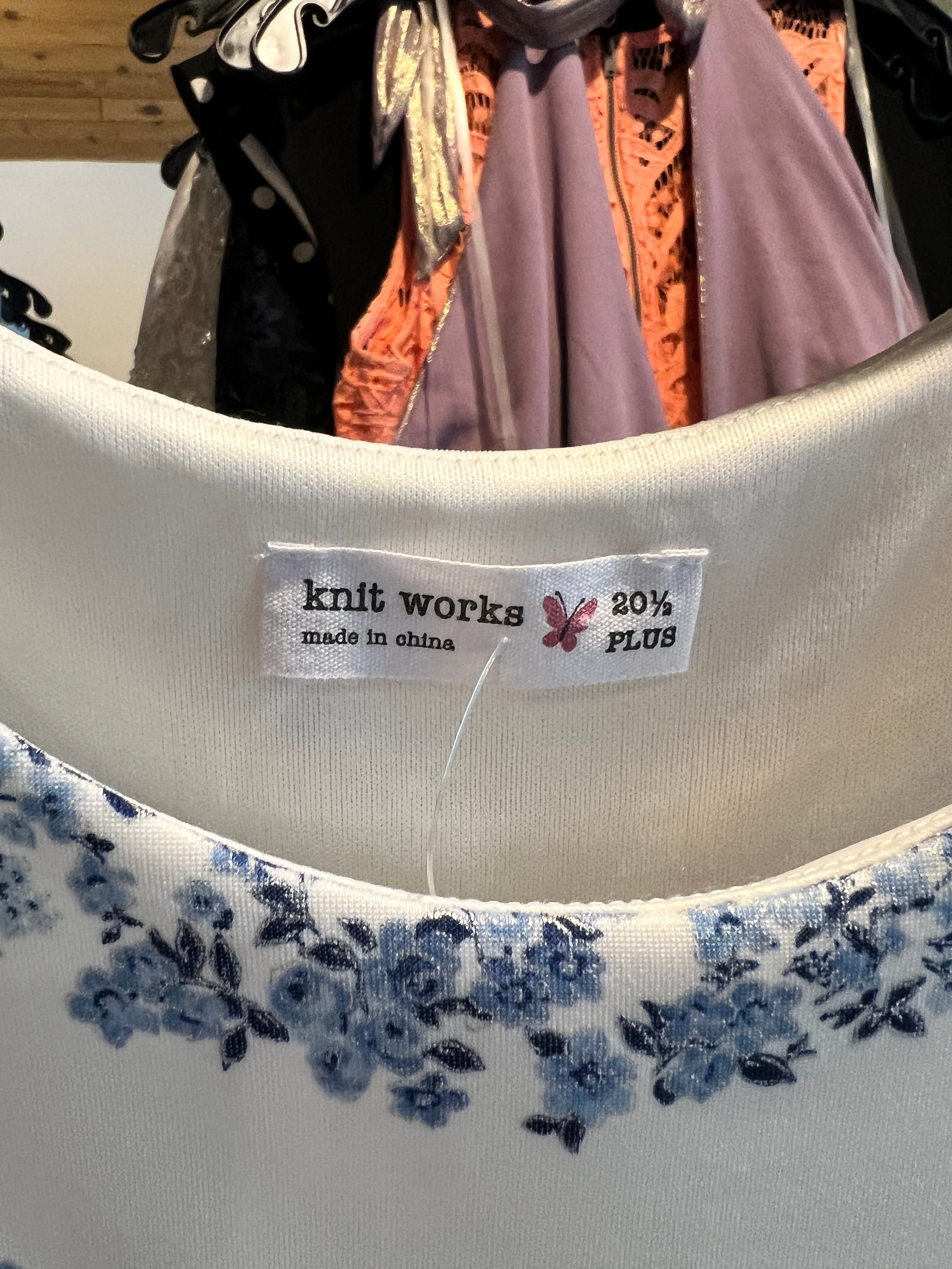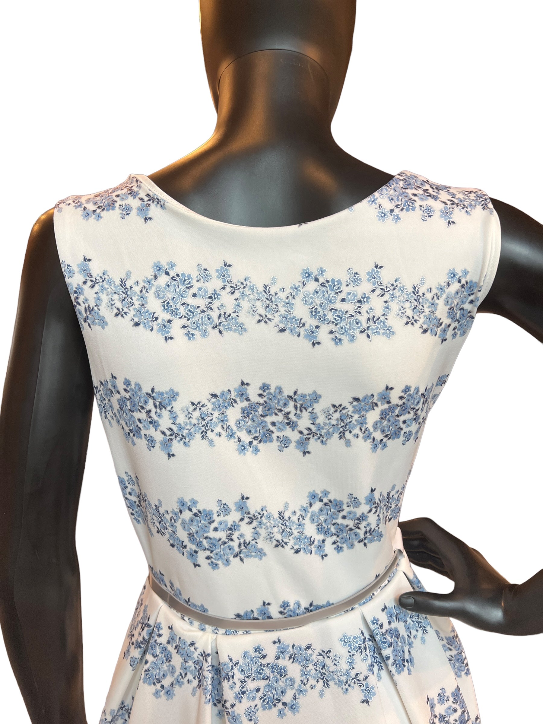 This adorable white and blue dress is perfect for a wedding, summer party, or semi-formal event. The white base is covered in stripes of blue flowers that match the edge of the skirt. The wide straps makes this dress comfortable for the entire day.