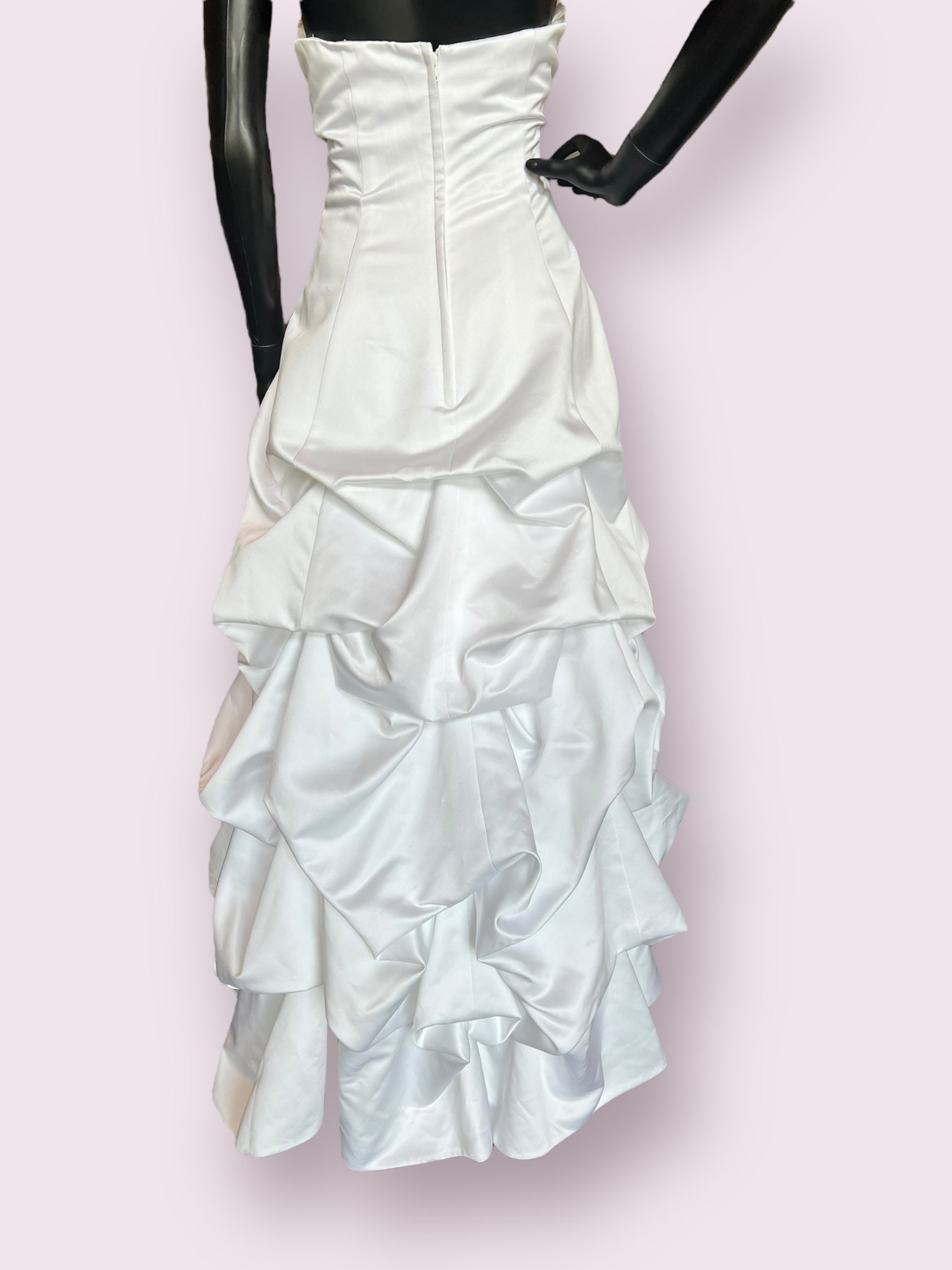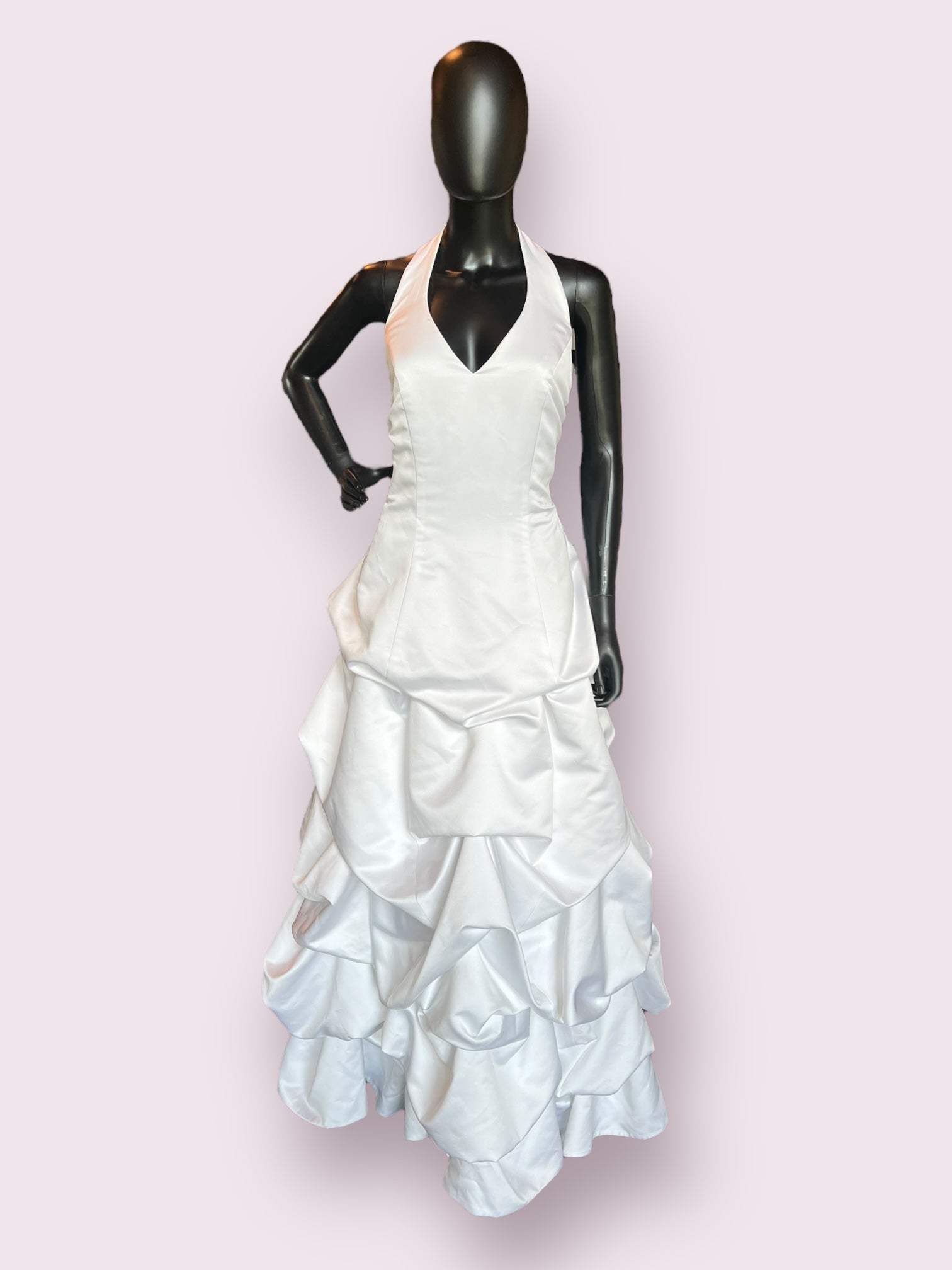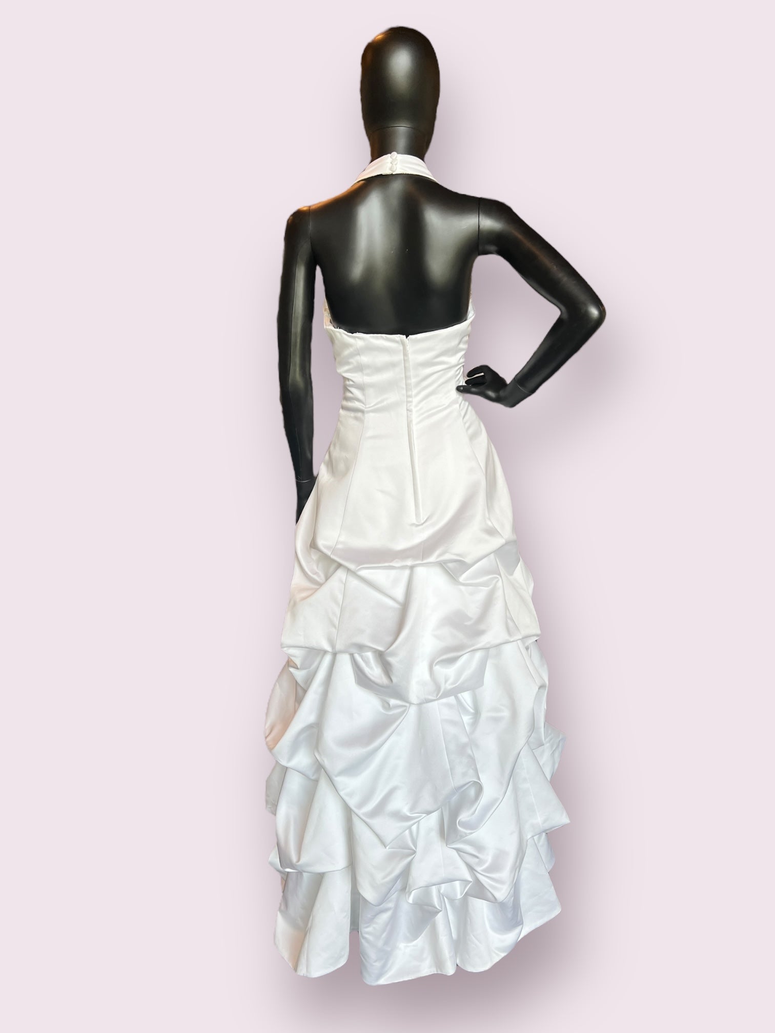 Enjoy your special day in style with our White Halter A-Line Bustled Skirt Wedding Gown. Made with luxurious white satin, this gown features a stunning halter neckline and a deep V, accentuating your figure. The fitted bodice and full a-line skirt with bustle/tucks create a timeless and elegant silhouette with lots of interest. No train means you can dance the night away without any worries. The simplicity of the gown can be elevated with a jeweled belt or other sparkly accessories. Feel beautiful in this sophisticated and exclusive gown.