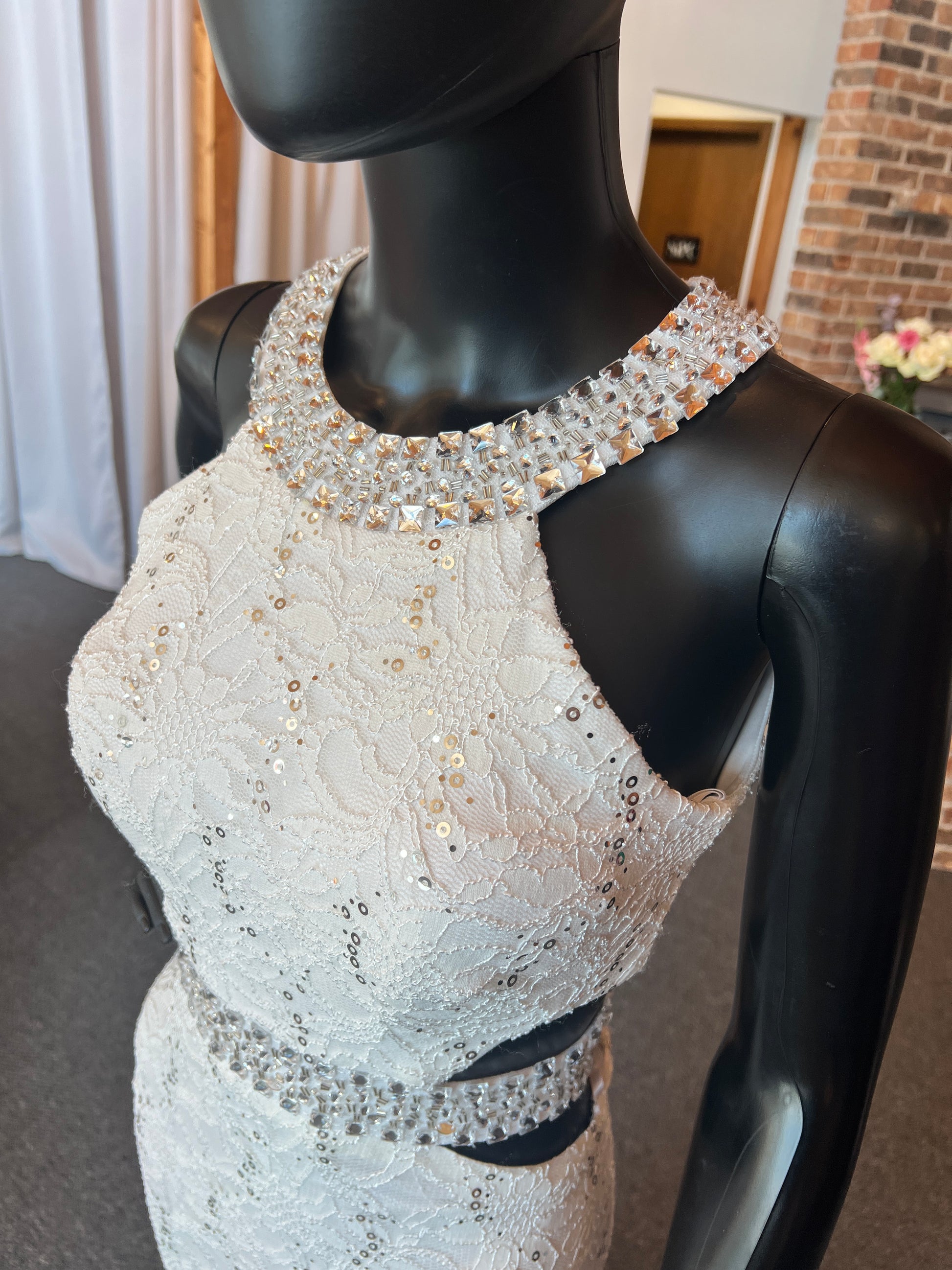 This elegant white gown is wonderful for a business event or a fun night out. The elegant halter top is beaded with sparkling crystals and layered with white lace. Meanwhile, the side cutouts creates a peak of sexy energy. This dress is not only comfortable, but also effortlessly glamorous.