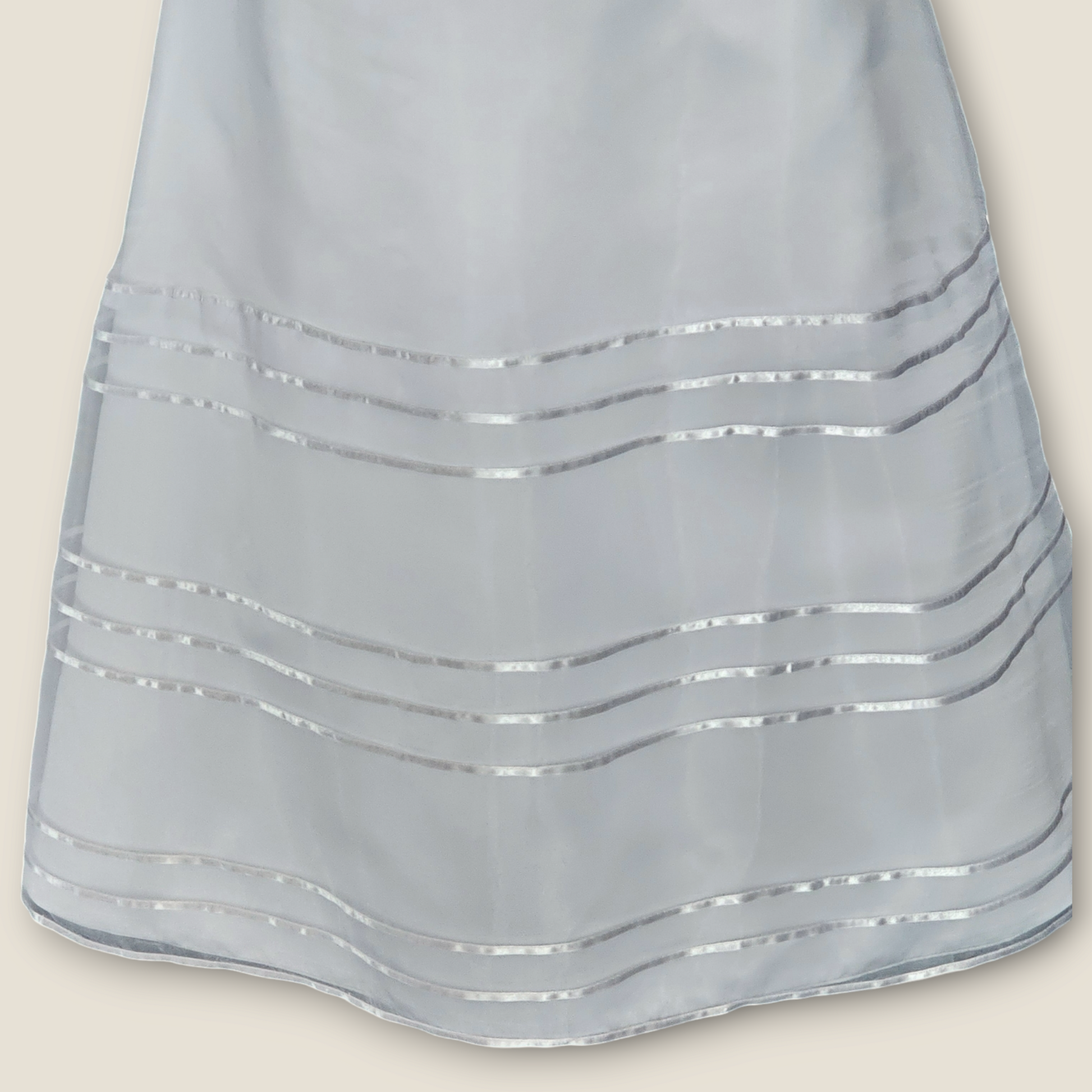 This sweet wedding gown is simple and chic with floaty organza and rows of satin ribbon. The bell skirt without a train is perfect for easy movement and a fuss free day. The fitted bodice features a straight strapless neckline and a row of ribbons on the natural waistline.