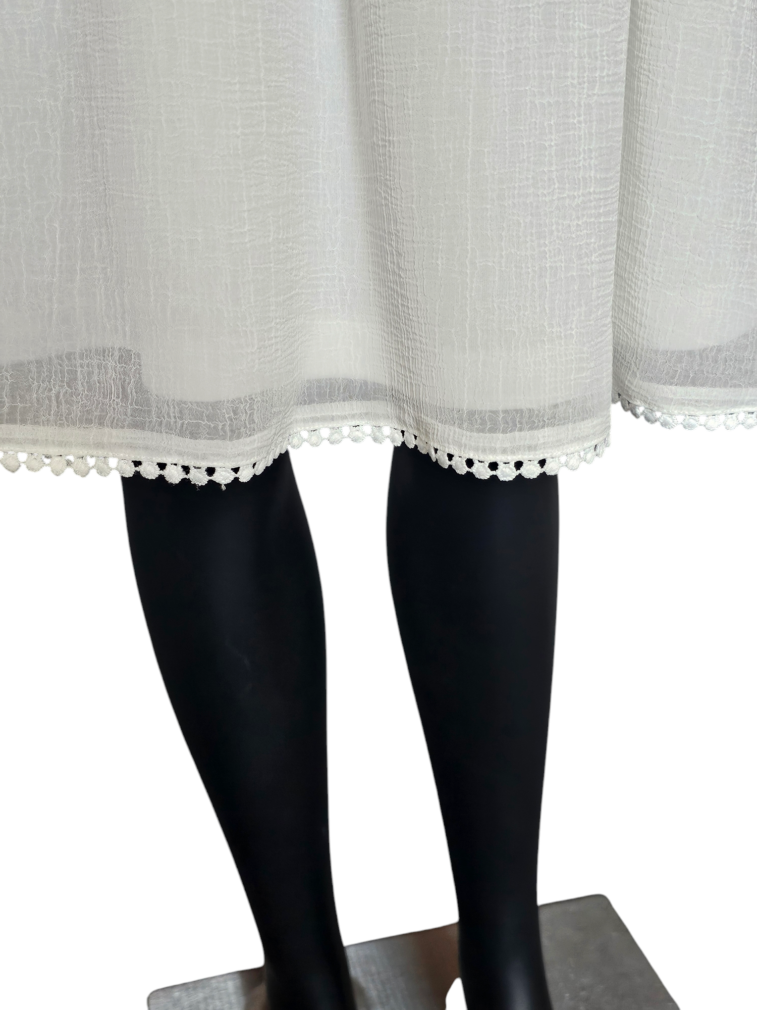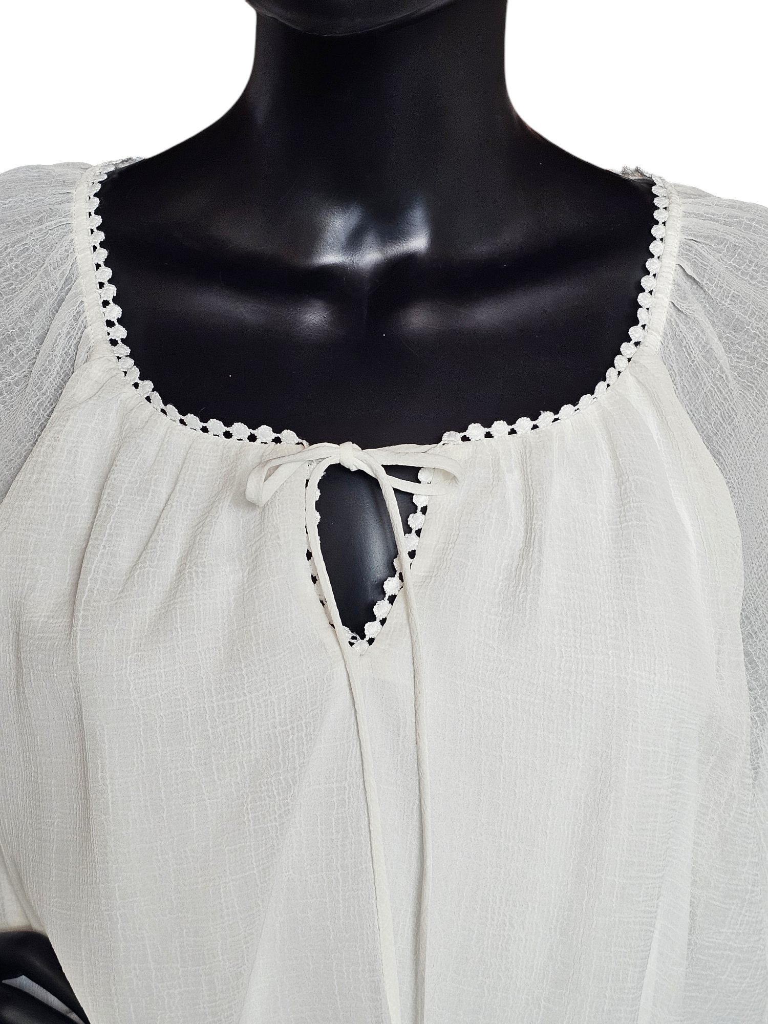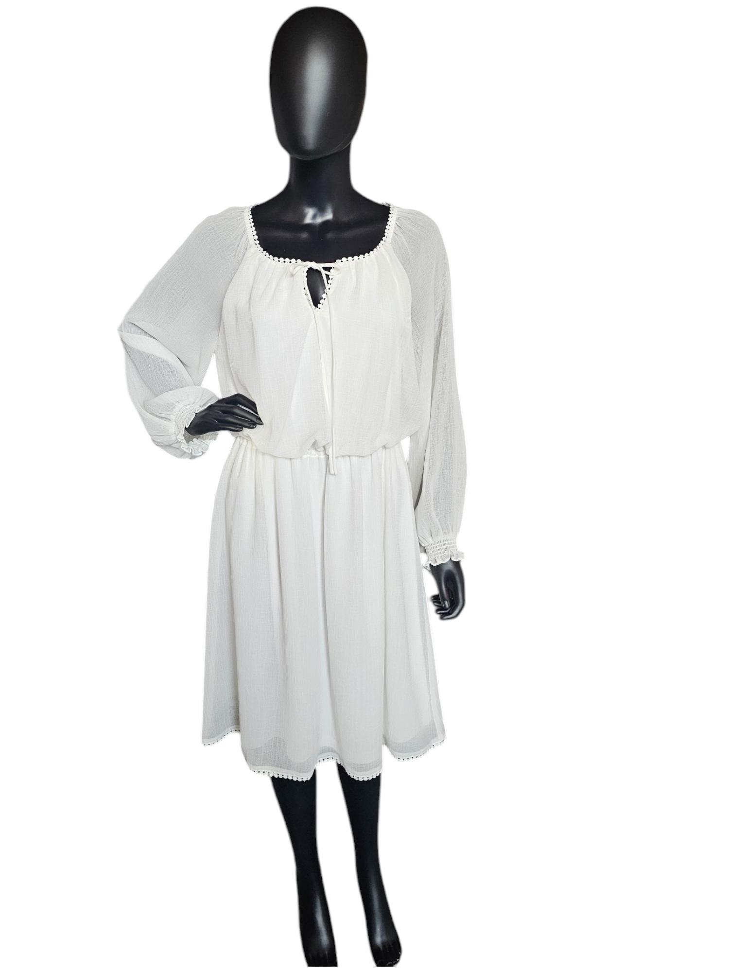 Embody effortless elegance in the White Peasant Dress by Adrianna Papell. With its casual yet stylish peasant style, blouson bodice, and full flowy sleeves, this dress exudes relaxed chic. The tie closure and gathered full skirt add a touch of femininity, while the demure ball lace at the neckline and hem elevate the overall look. Perfect for any occasion, this knee-length dress will surely make a statement.