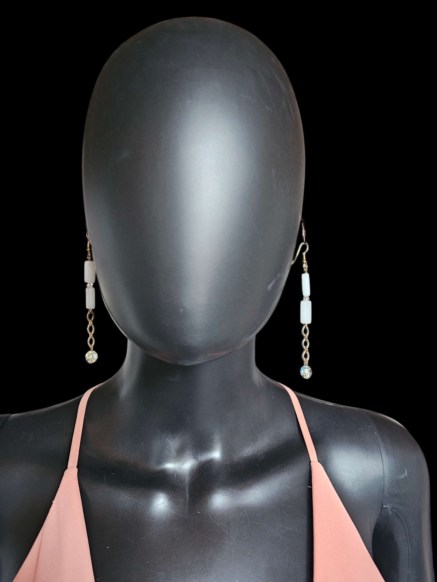 Enhance your style with these exquisite White Quartz Long Dangle Hook Earrings. The long gold chain and oblong white quartz stone beads create a unique and captivating look, while Swarovski crystals add a touch of sparkle. Elevate any outfit with these exciting and luxurious earrings.