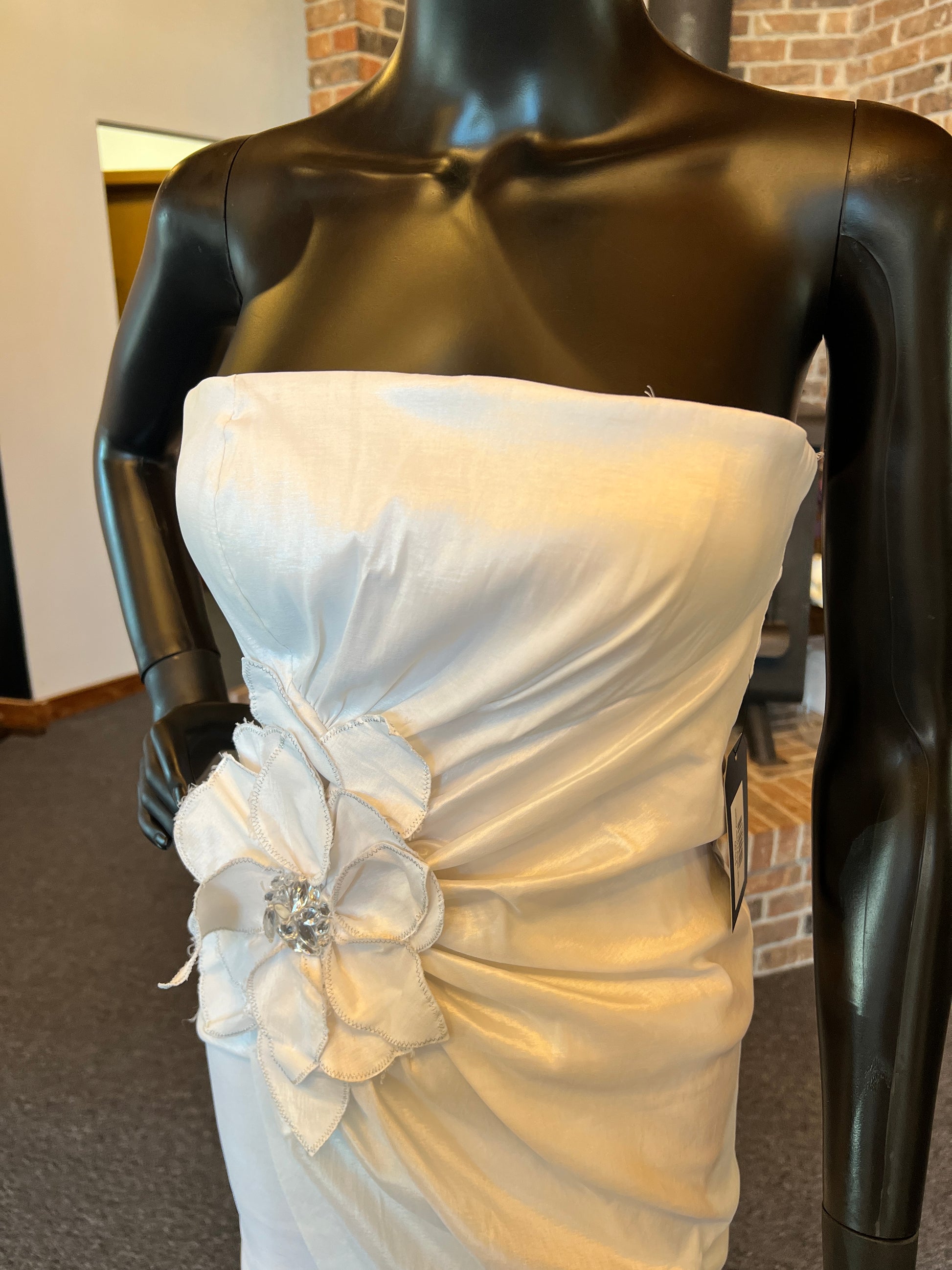This dress is so fun! It's a white strapless cocktail dress with side ruching and a large floral accent to the side.