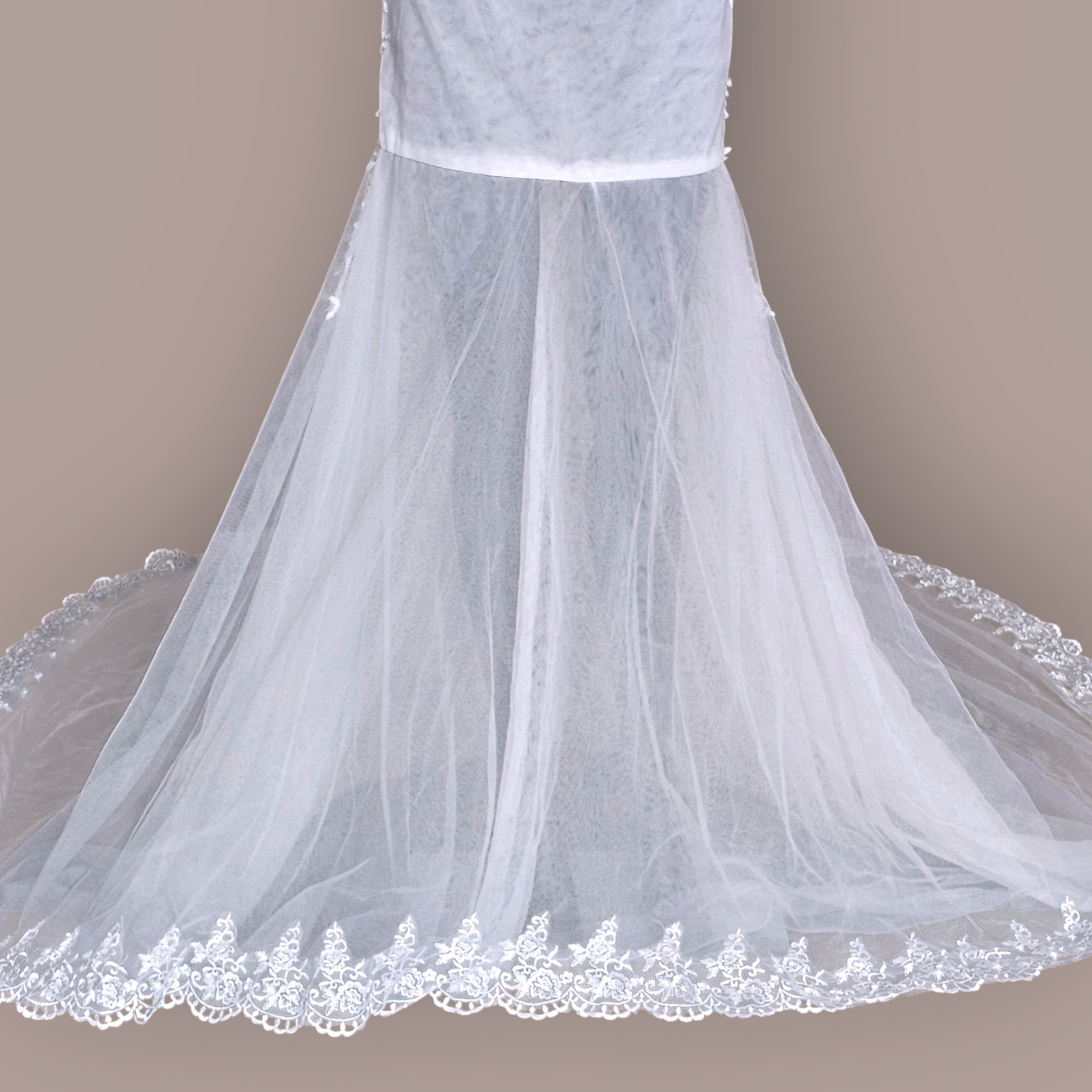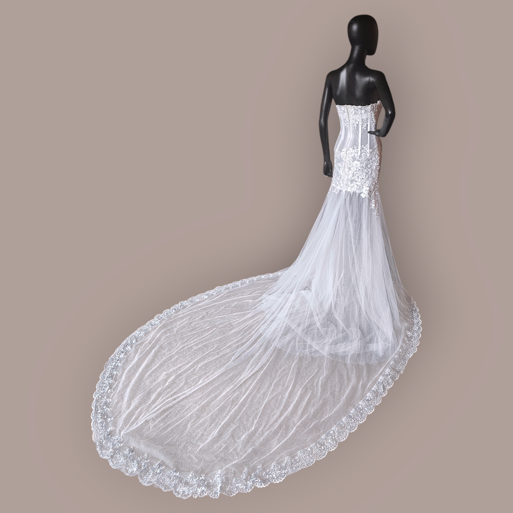 Fitted gown with flare at the mid thigh. Beautiful cathedral length train and scalloped lace along the hem.