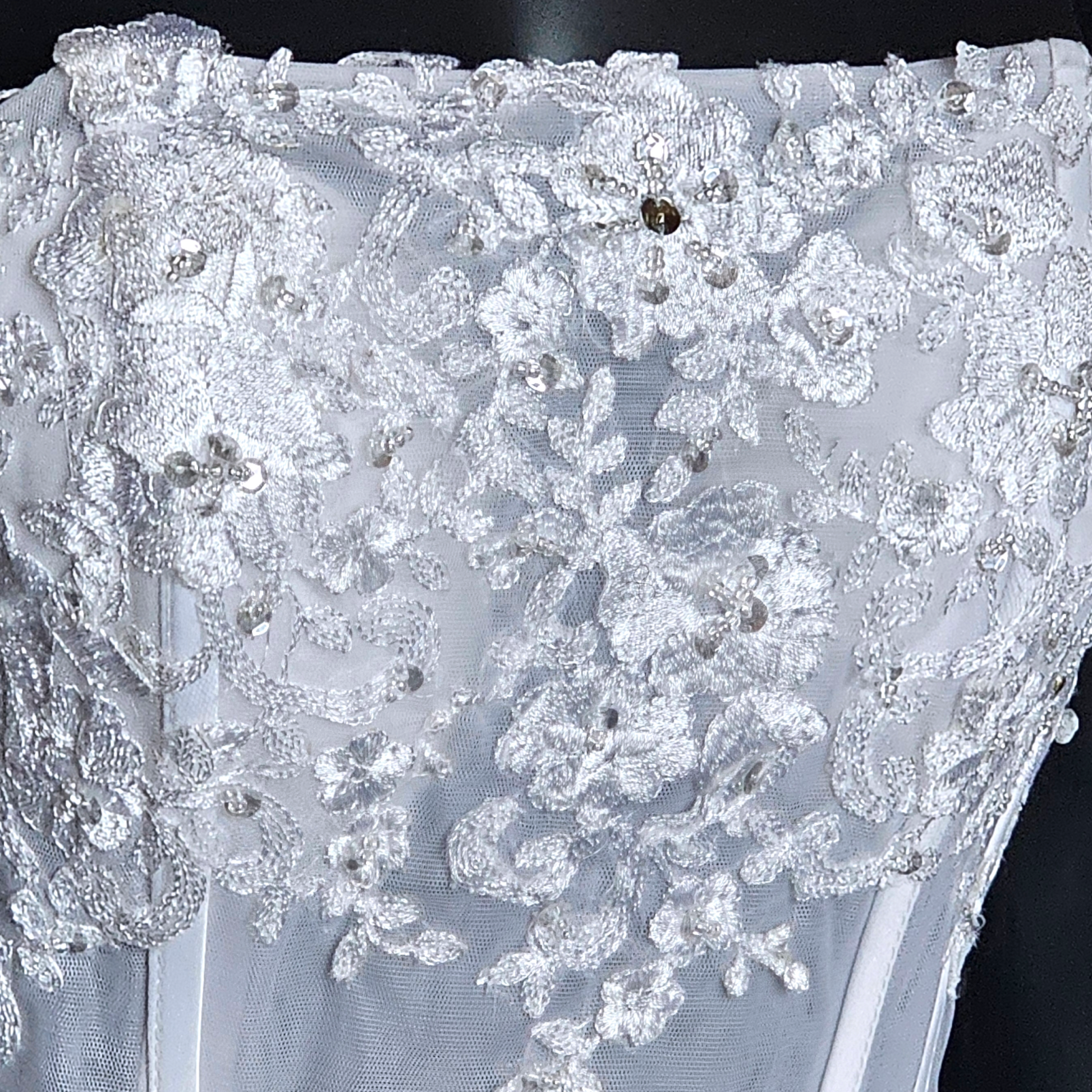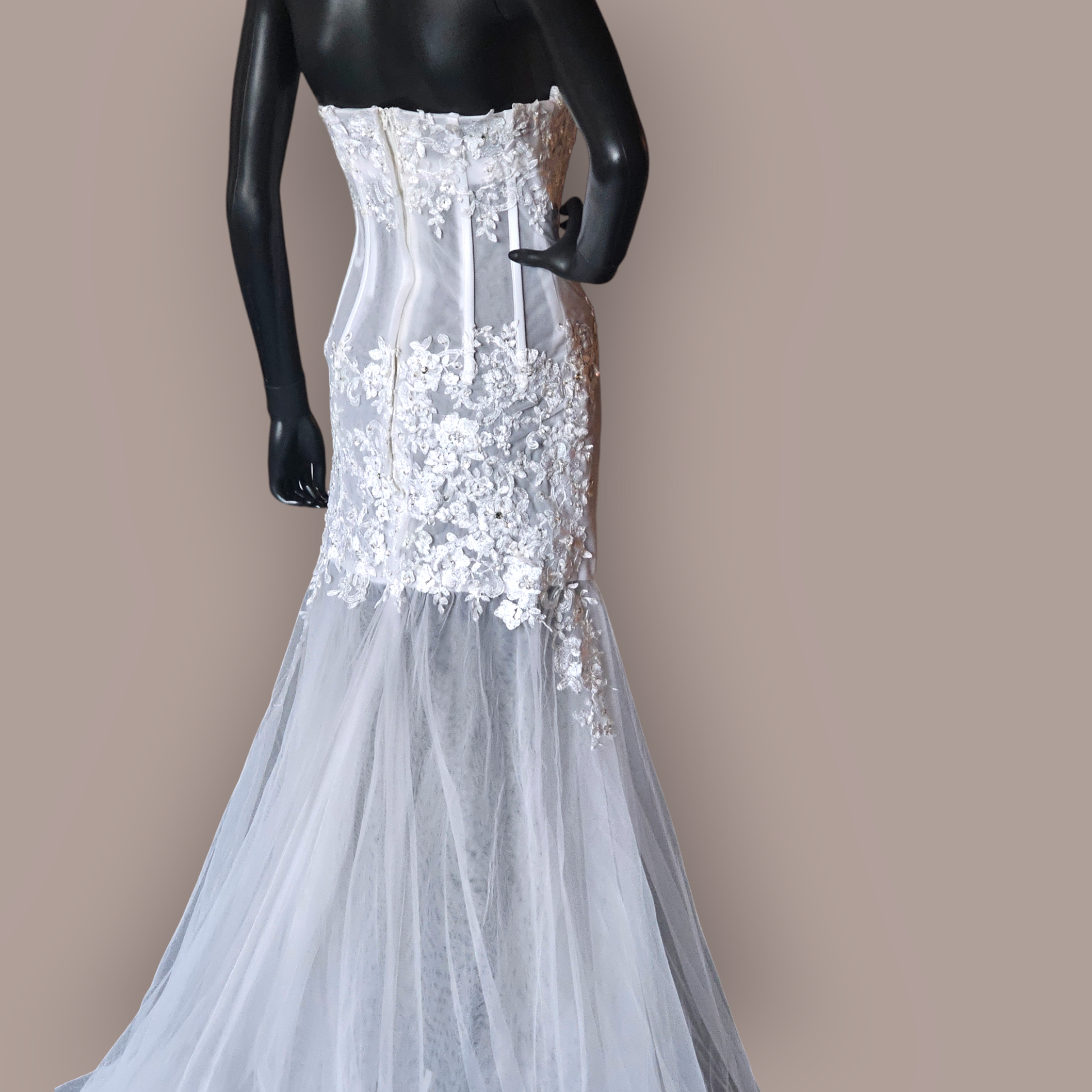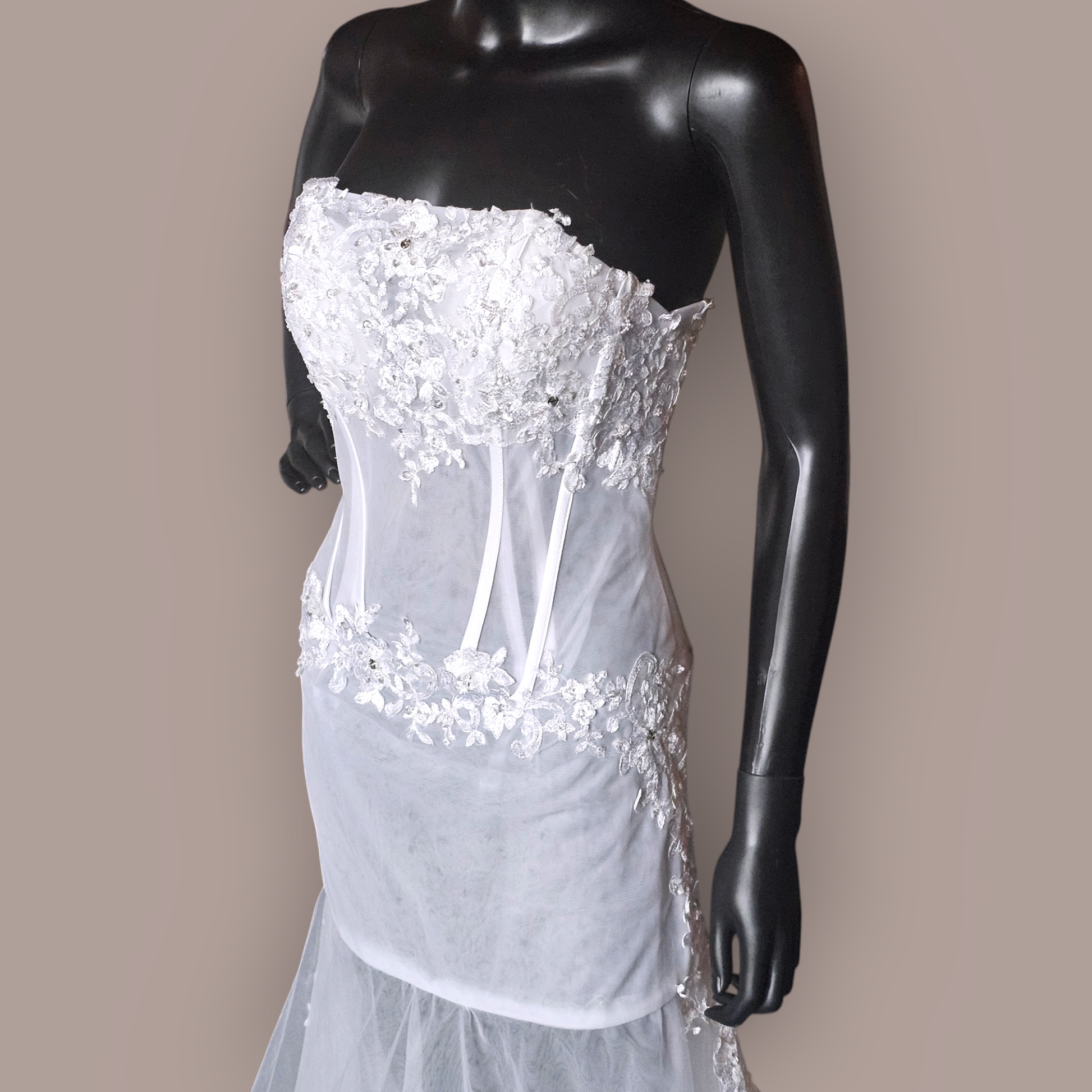 Special Attributes: Sheer bodice to show boning, lace and crystal accents, fabulous cathedral train!
