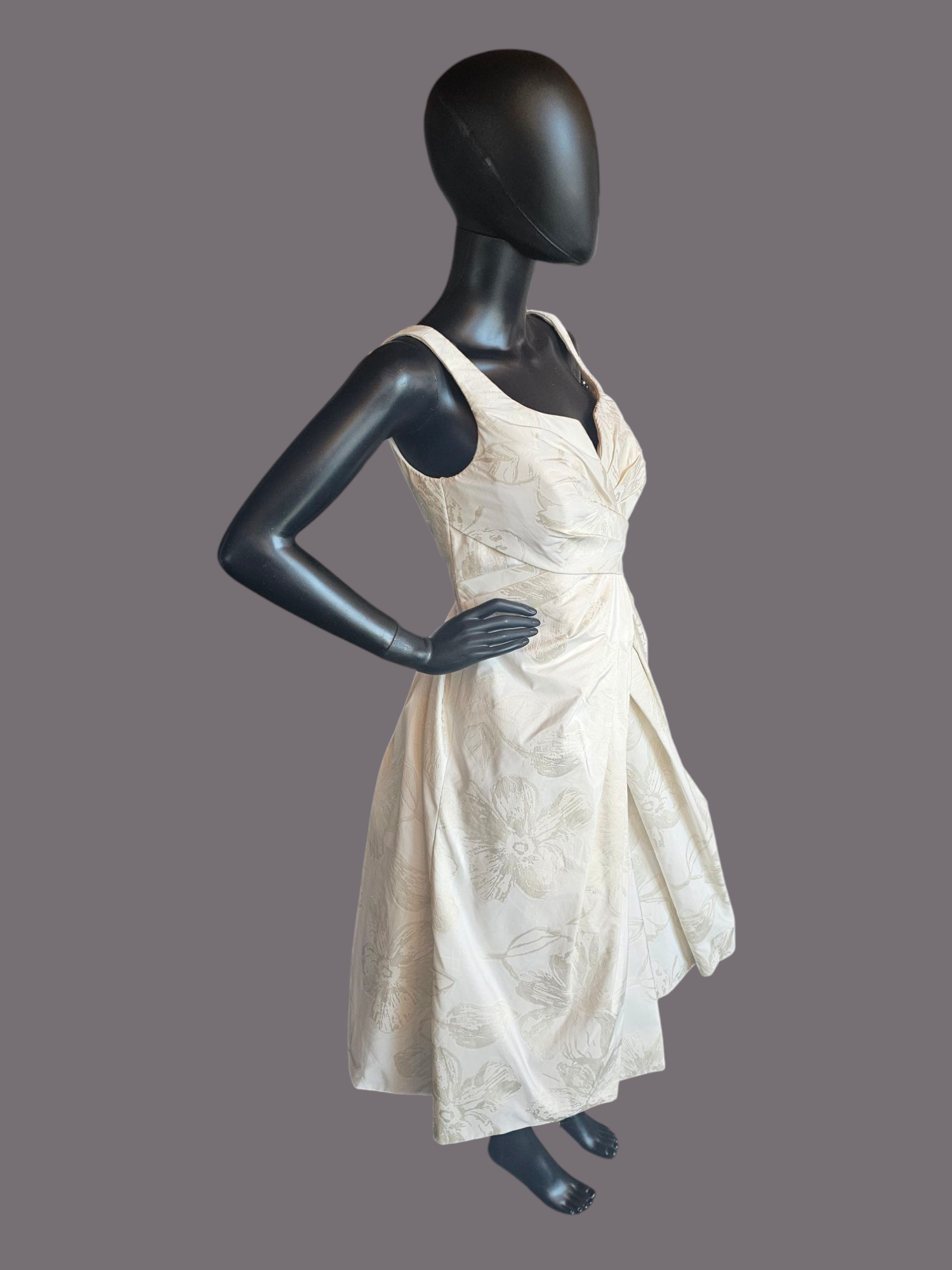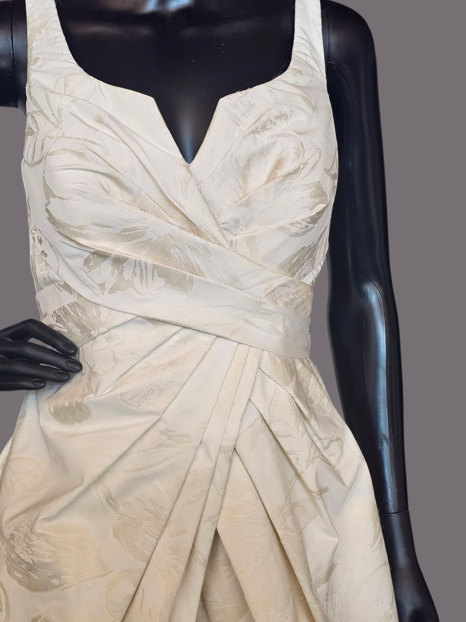 Expertly crafted with chic ivory jacquard fabric, this Zachary Alexander wedding gown features a stunning champagne floral print. The exquisitely pleated design creates a fitted waist and flared skirt, while the short length and modified scoop neckline with wide straps add an elegant touch. Perfect for any bride looking for a timeless and sophisticated look on her special day.